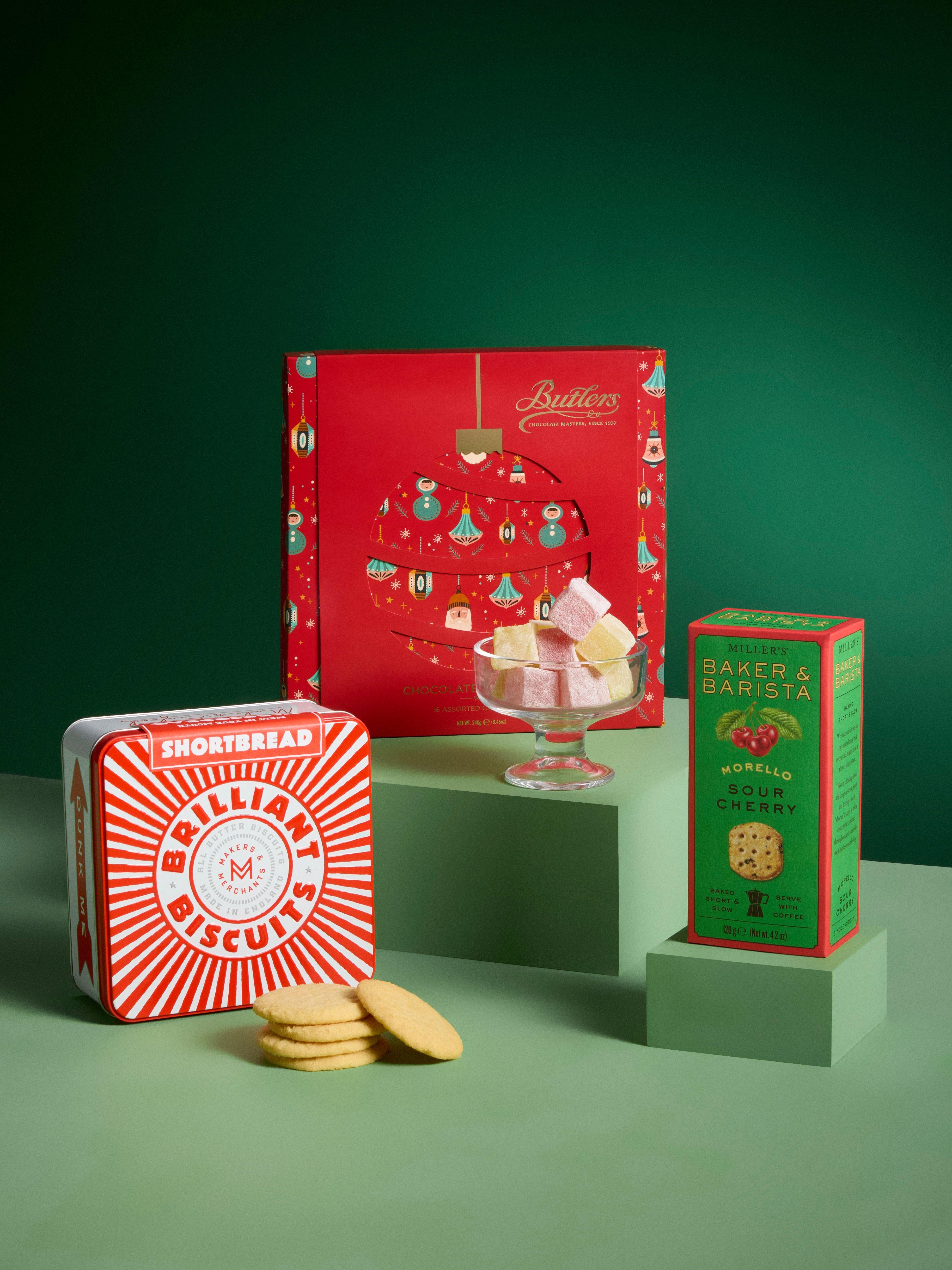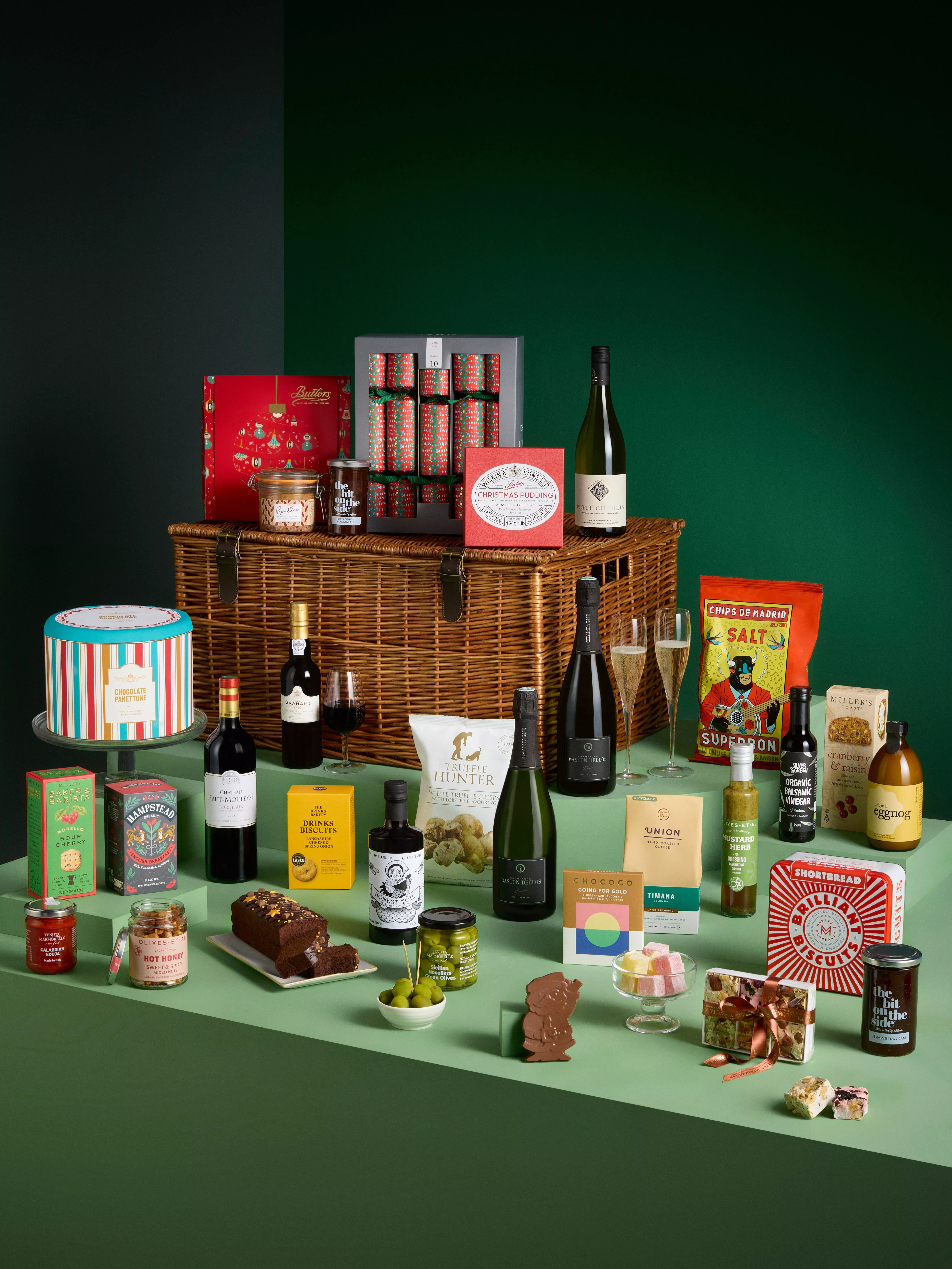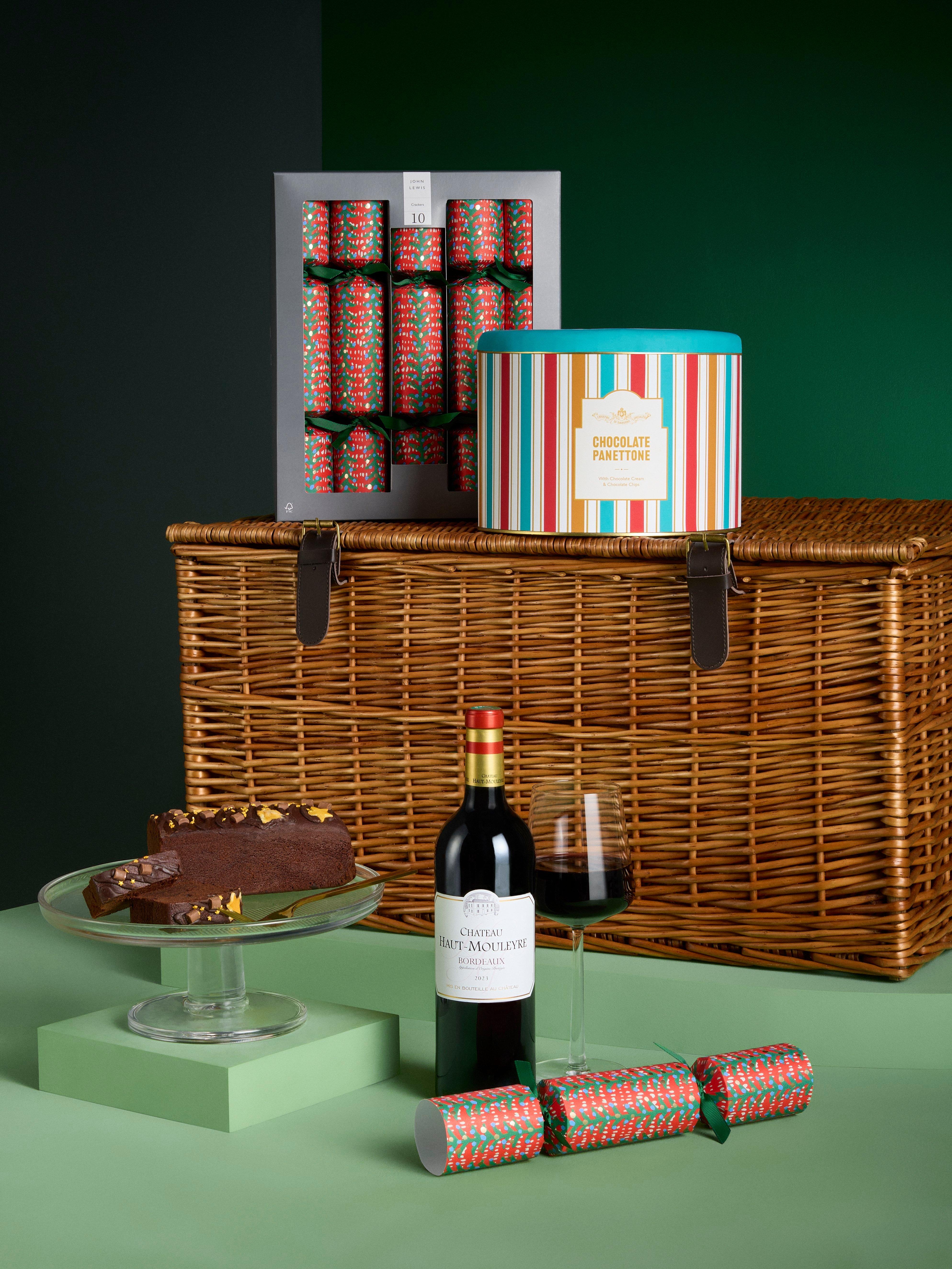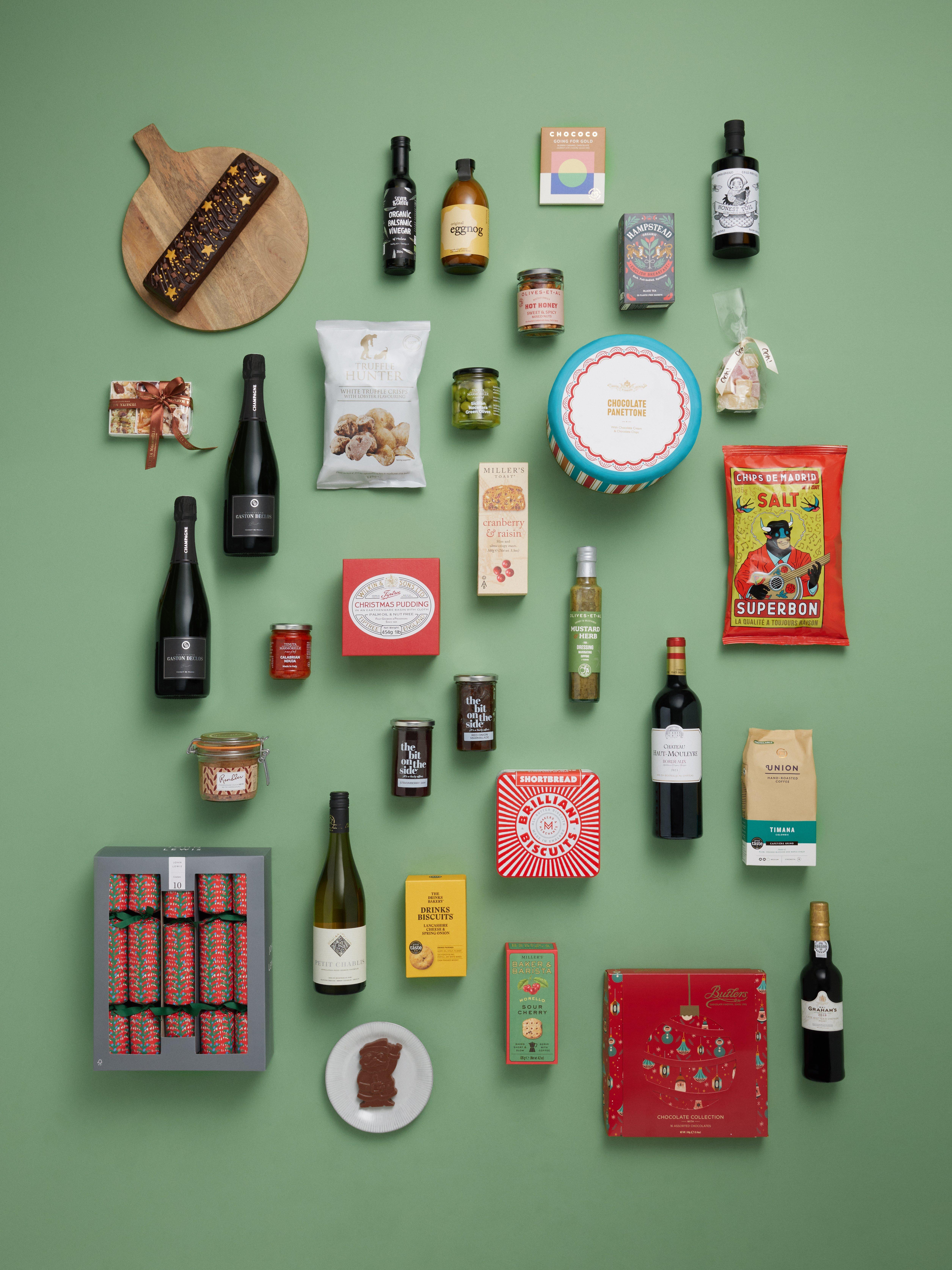 - John Lewis Chioistro Chocolate Panettone 750g Gaston Declos Champagne 75cl x 2 Chateau Haut-Mouleyre Bordeaux 75cl Oliver Tricon Petit Chablis 75cl Maxwell & Franks Chocolate Sharing Cake 575g Honestyolk Original Eggnog 50cl Honest Toil Extra Virgin Olive Oil 500ml Wilkin & Sons Tiptree Christmas Pudding 454g Makers & Merchants Brilliant Biscuits Shortbread Tin 300g John Lewis Mid 10 Wordly Treasures Tree Red Crackers The Bit on the Side Red Onion Marmalade 290g The Bit on the Side Strawberry Jam 290g Rendles Farmhouse Duck Pate with Armagnac 280g Tenuta Marmorelle Sicilian Nocellara Green Olives 280g Silver & Green Organic Balsamic Vinegar 250g Olives Et Al Mustard & Herb Dressing 250ml Butlers Chocolates Chocolate Collection 240g Union Hand Roasted Coffee Timana Cafetiere Grind 200g Tenuta Marmorelle Calabrian Nduja 180gTenuta Marmorelle Mixed Nougat Gift Box 180g Ooh! Chocolata Rose & Lemon Turkish Delight 180g Olives Et Al Hot Honey Sweet & Spicy Mixed Nuts 150g Superbon Salt Chips de Madrid 135g Truffle Hunter White Truffle Crisps with Lobster Flavouring 125g Miller's Baker & Barista Morello Sour Cherry 120g The Drinks Bakery Lancashire Cheese & Spring Onion Drinks Biscuits 110g Miller's Toast Cranberry & Raisin 100g Chococo Going for Gold Blonde Caramel Chocolate Tablet Bar 75gChococo Milk Chocolate Father Christmas Bar 45g Hampstead Tea Organic English Breakfast Tea 40g