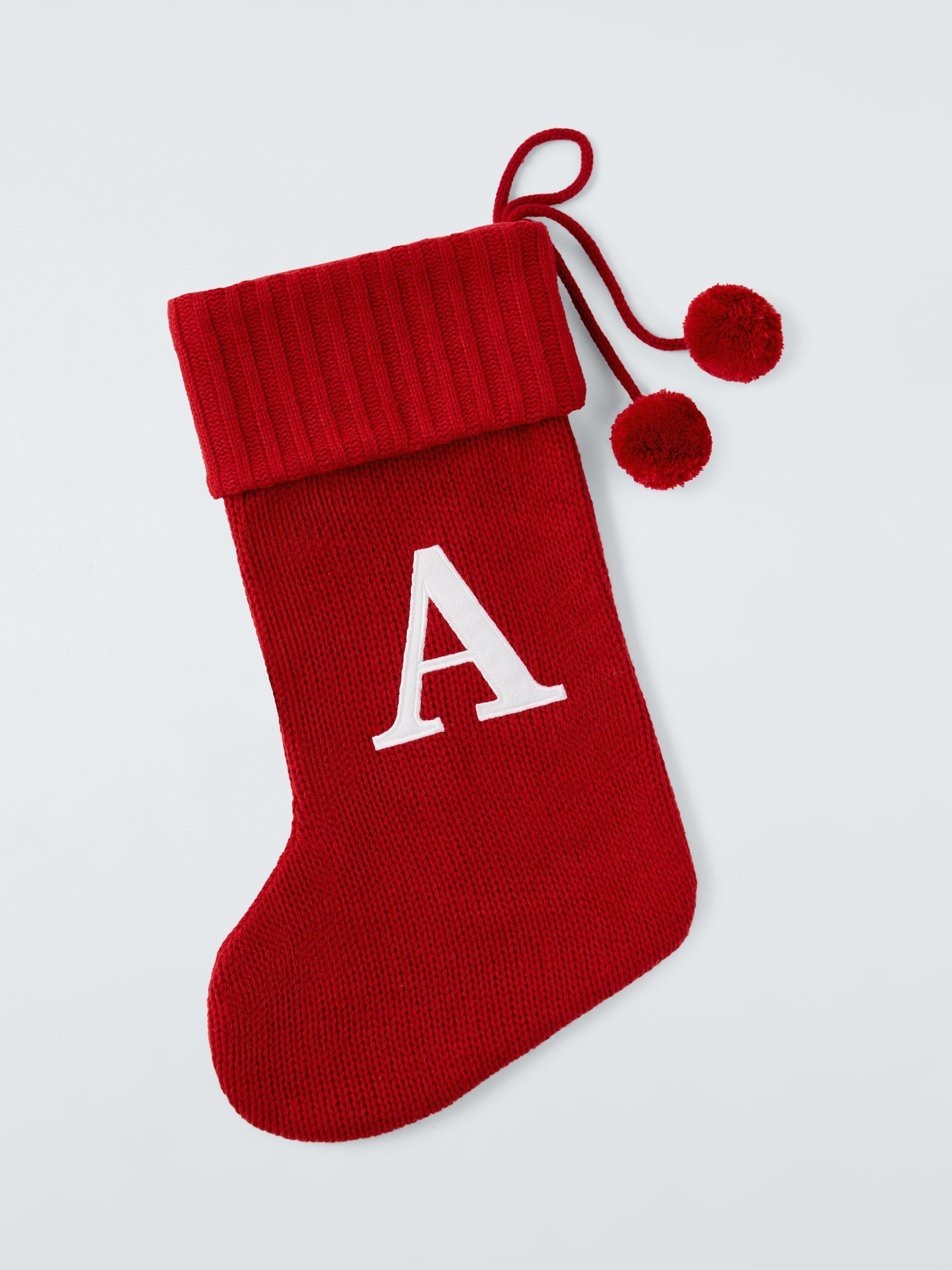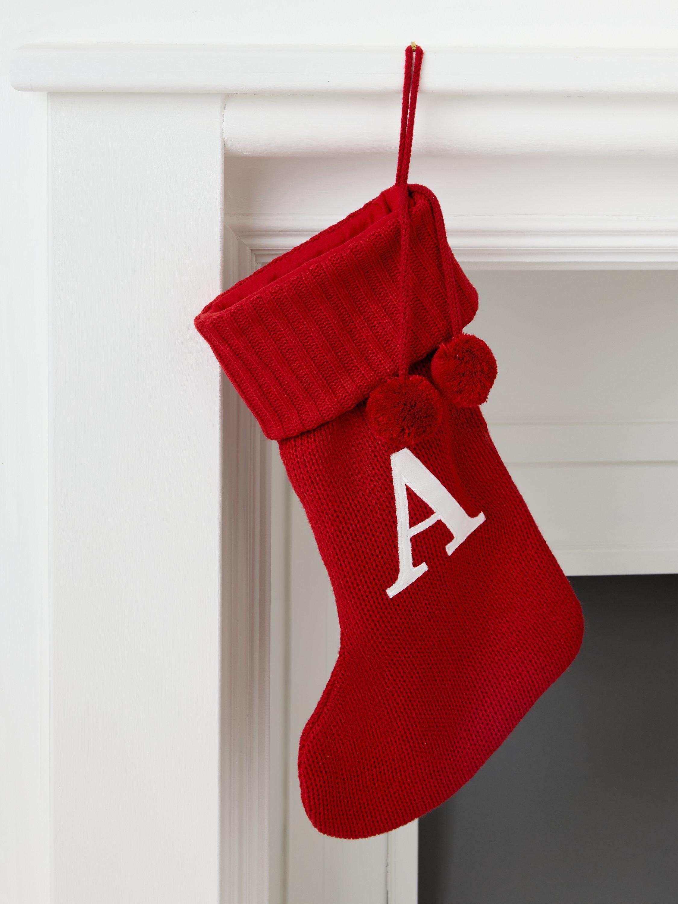 A knitted Christmas stocking trimmed with pom poms. Each one comes appliqued with an identifying letter of the alphabet, so you can hang one for every member of the family.