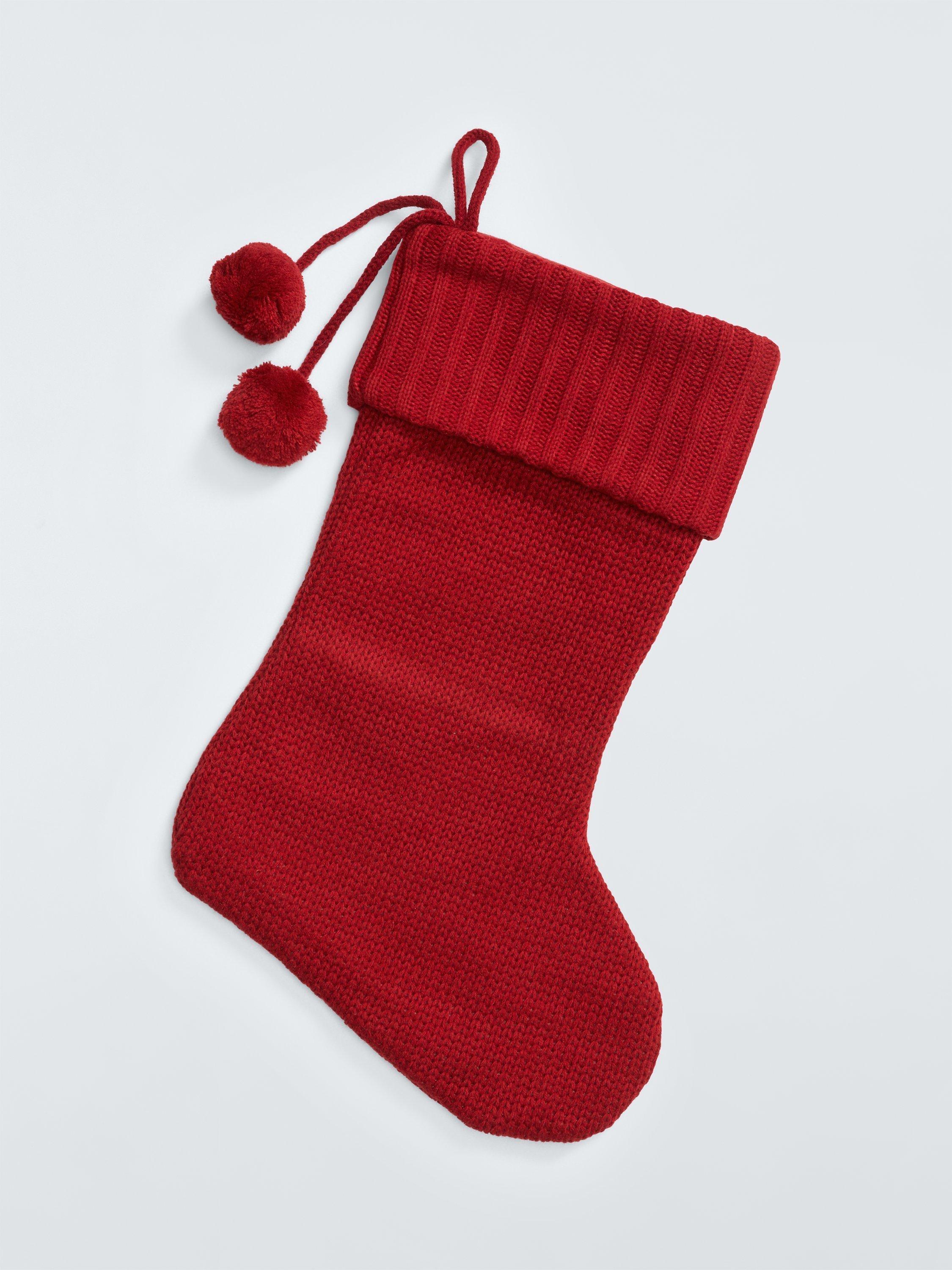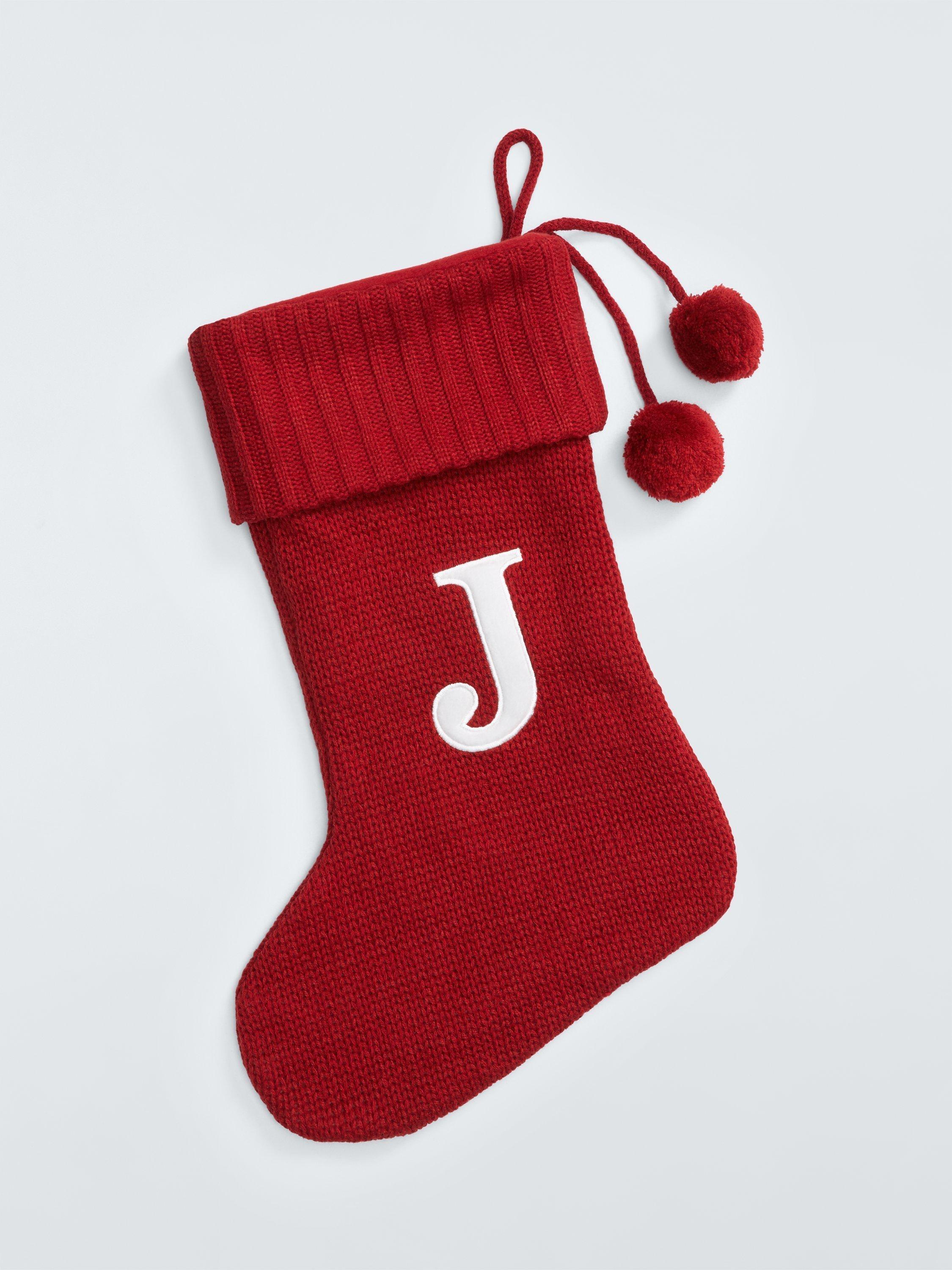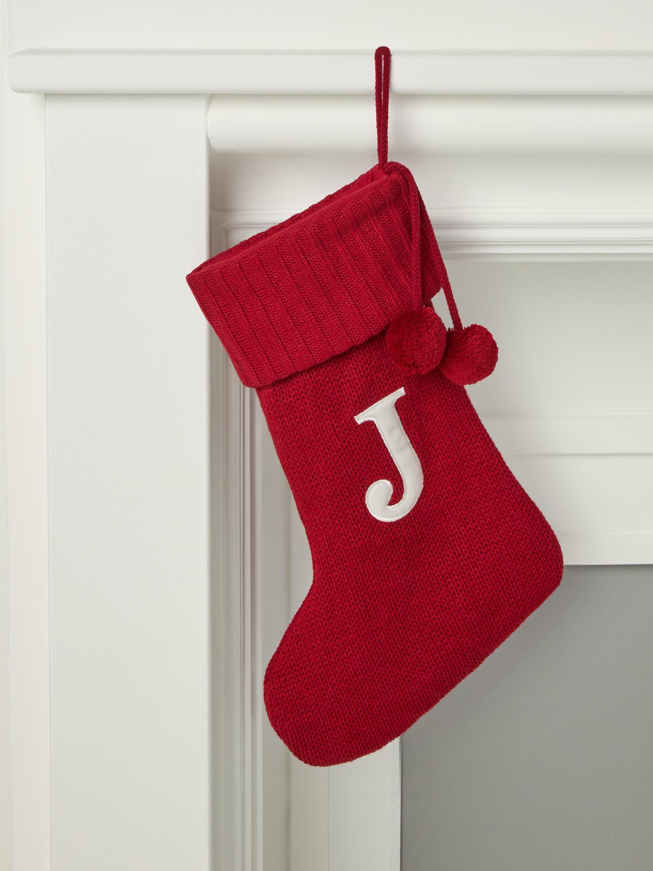 A knitted Christmas stocking trimmed with pom poms. Each one comes appliqued with an identifying letter of the alphabet, so you can hang one for every member of the family.