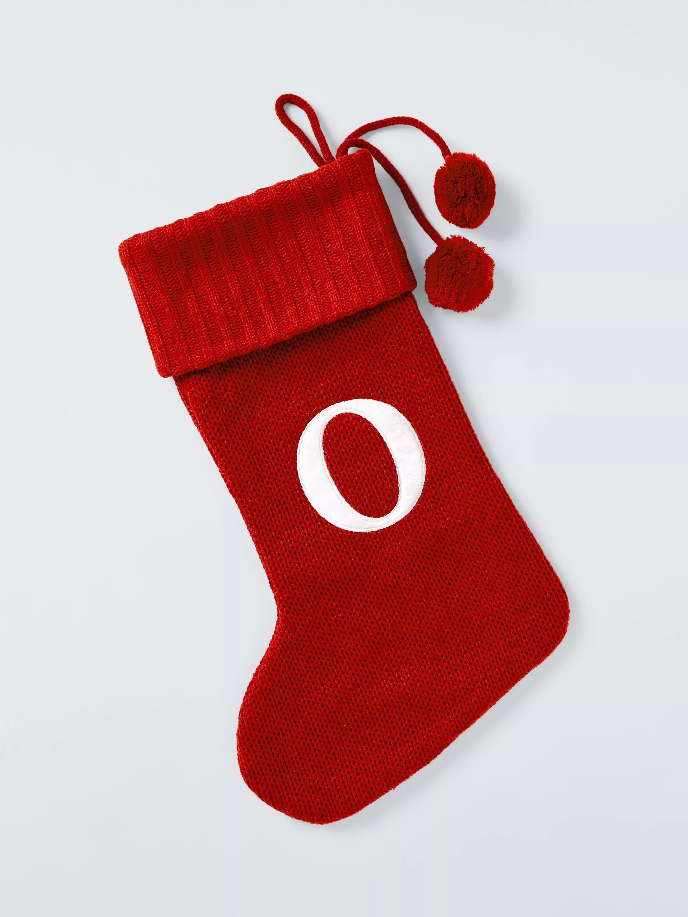 A knitted Christmas stocking trimmed with pom poms. Each one comes appliqued with an identifying letter of the alphabet, so you can hang one for every member of the family.