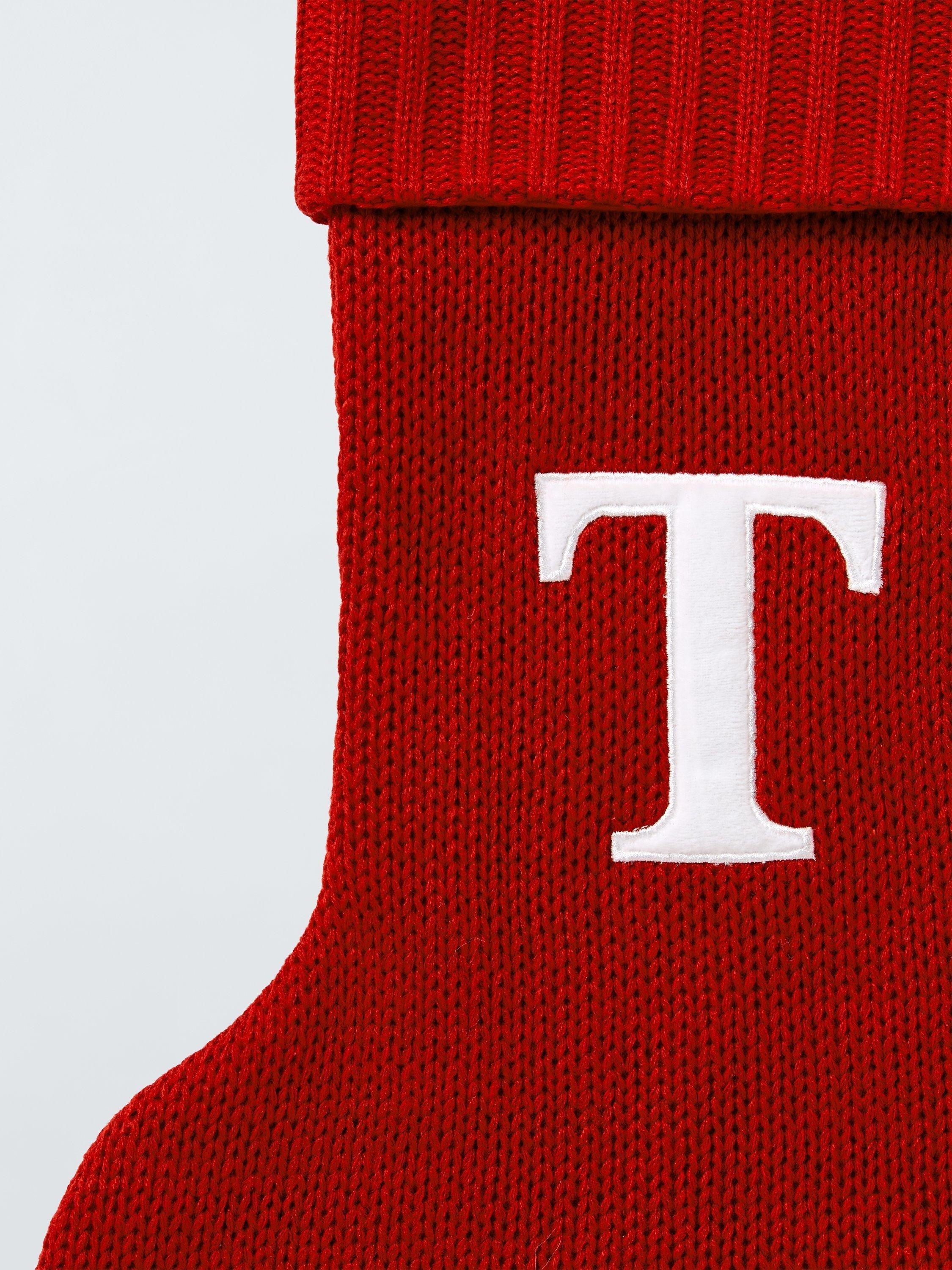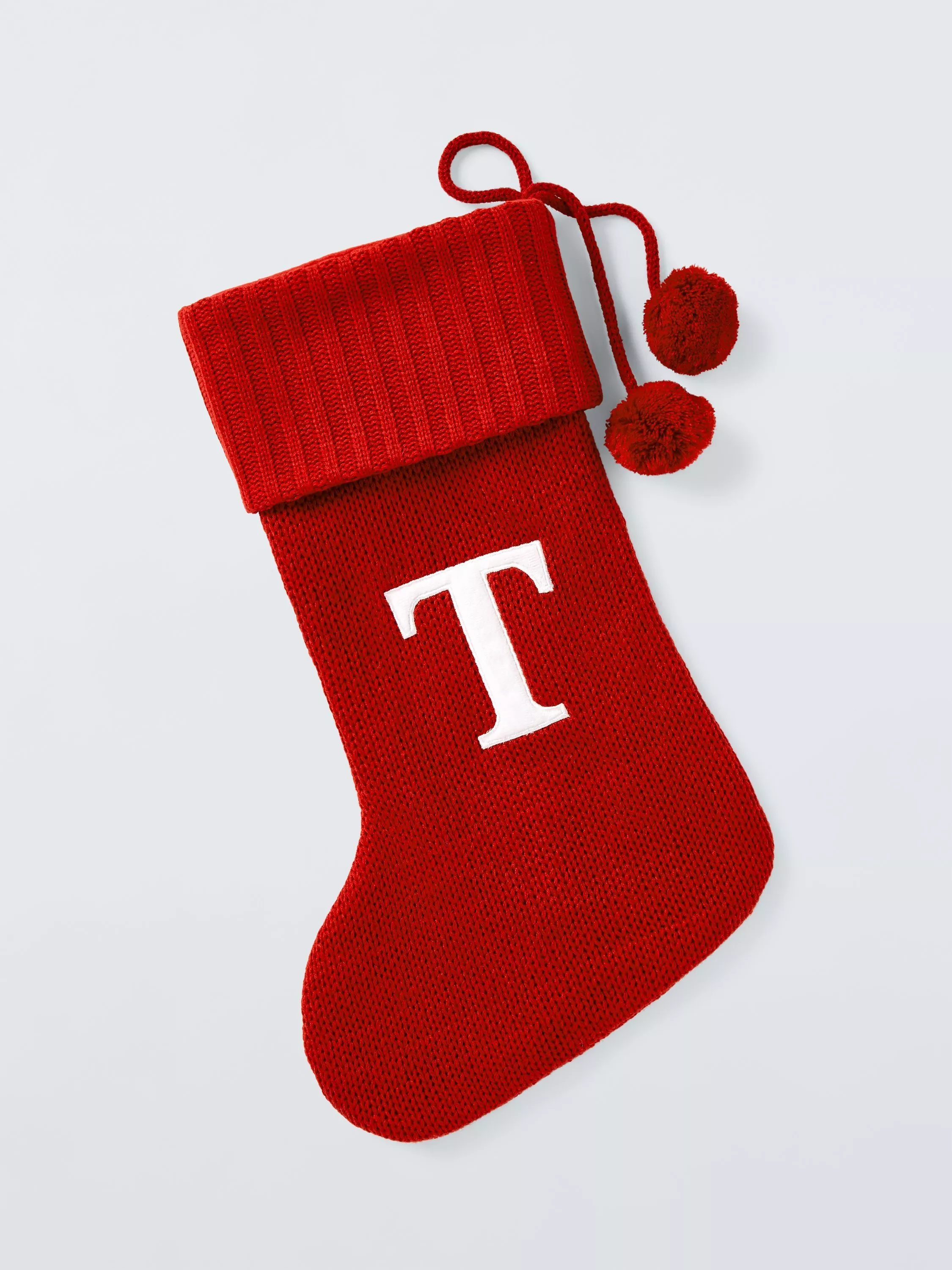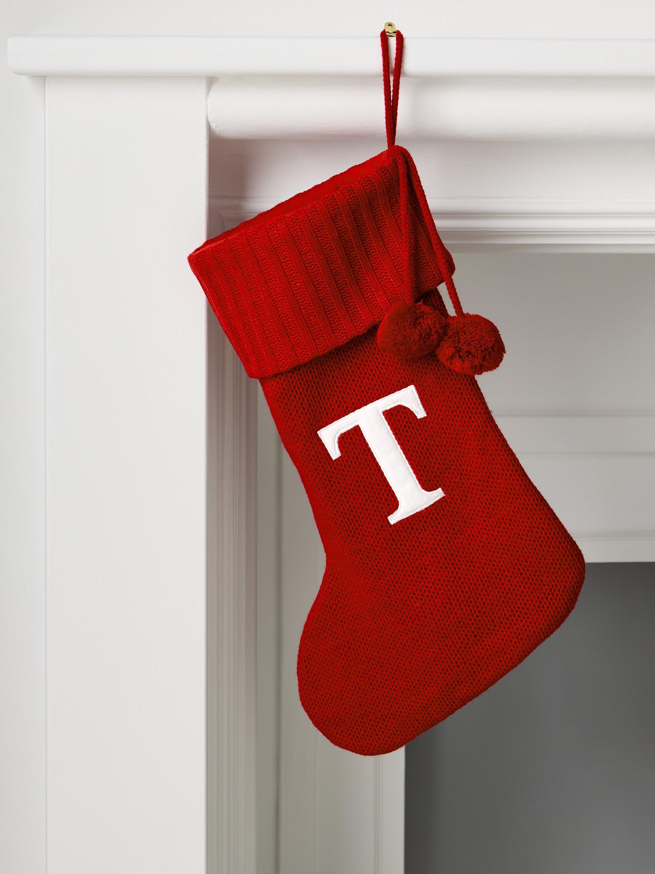 A knitted Christmas stocking trimmed with pom poms. Each one comes appliqued with an identifying letter of the alphabet, so you can hang one for every member of the family.
