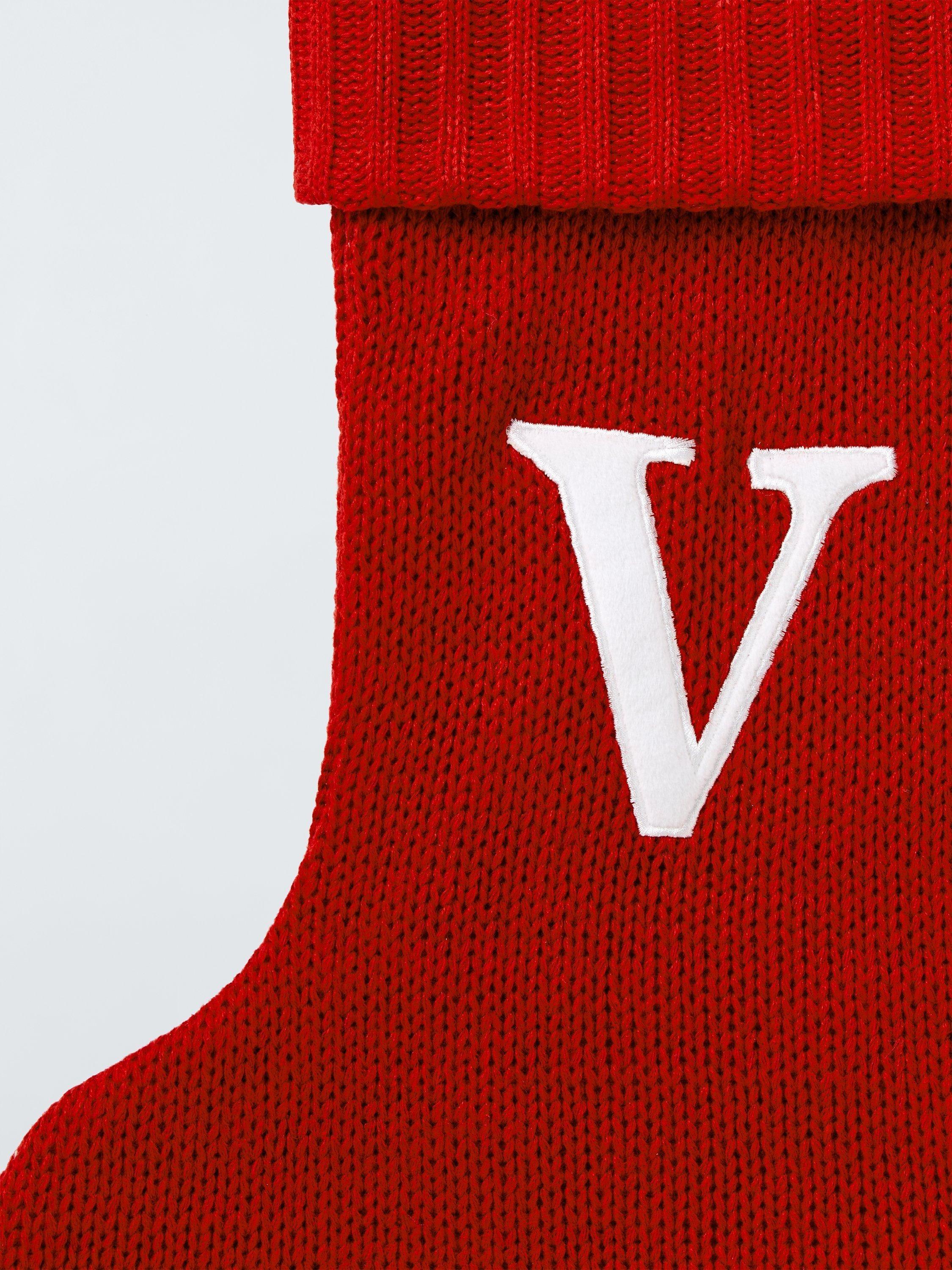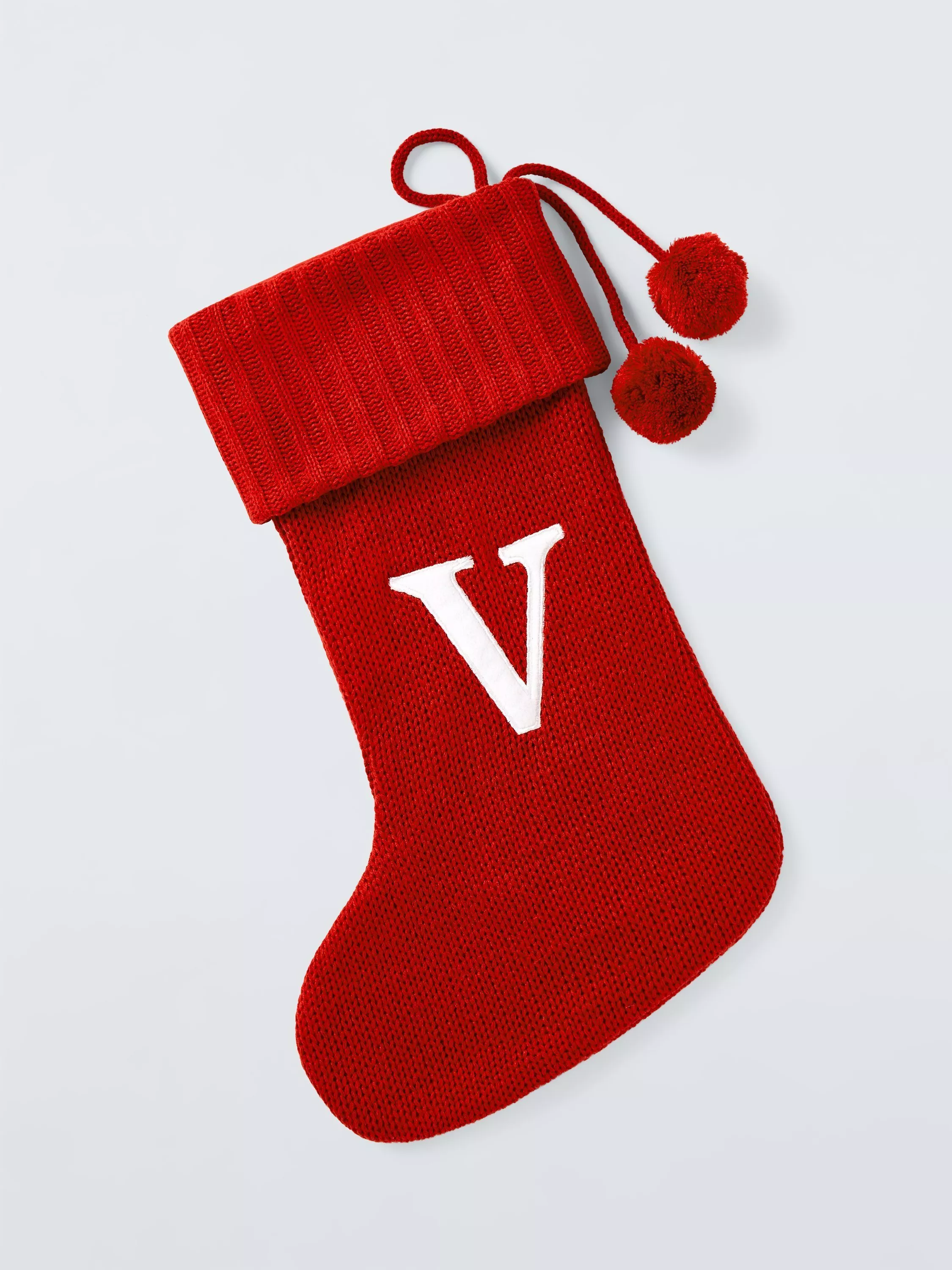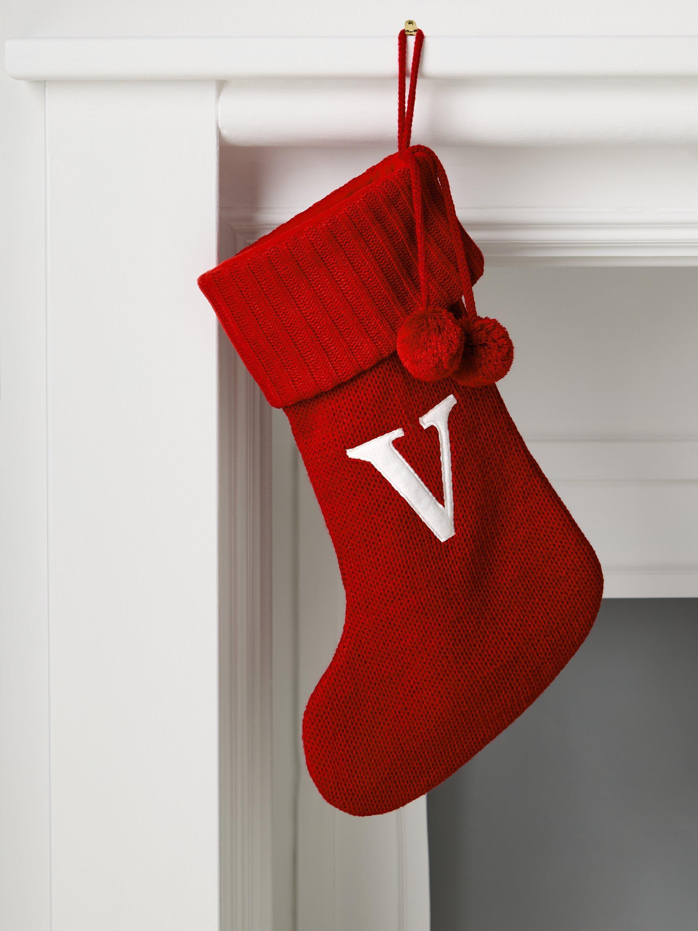 A knitted Christmas stocking trimmed with pom poms. Each one comes appliqued with an identifying letter of the alphabet, so you can hang one for every member of the family.