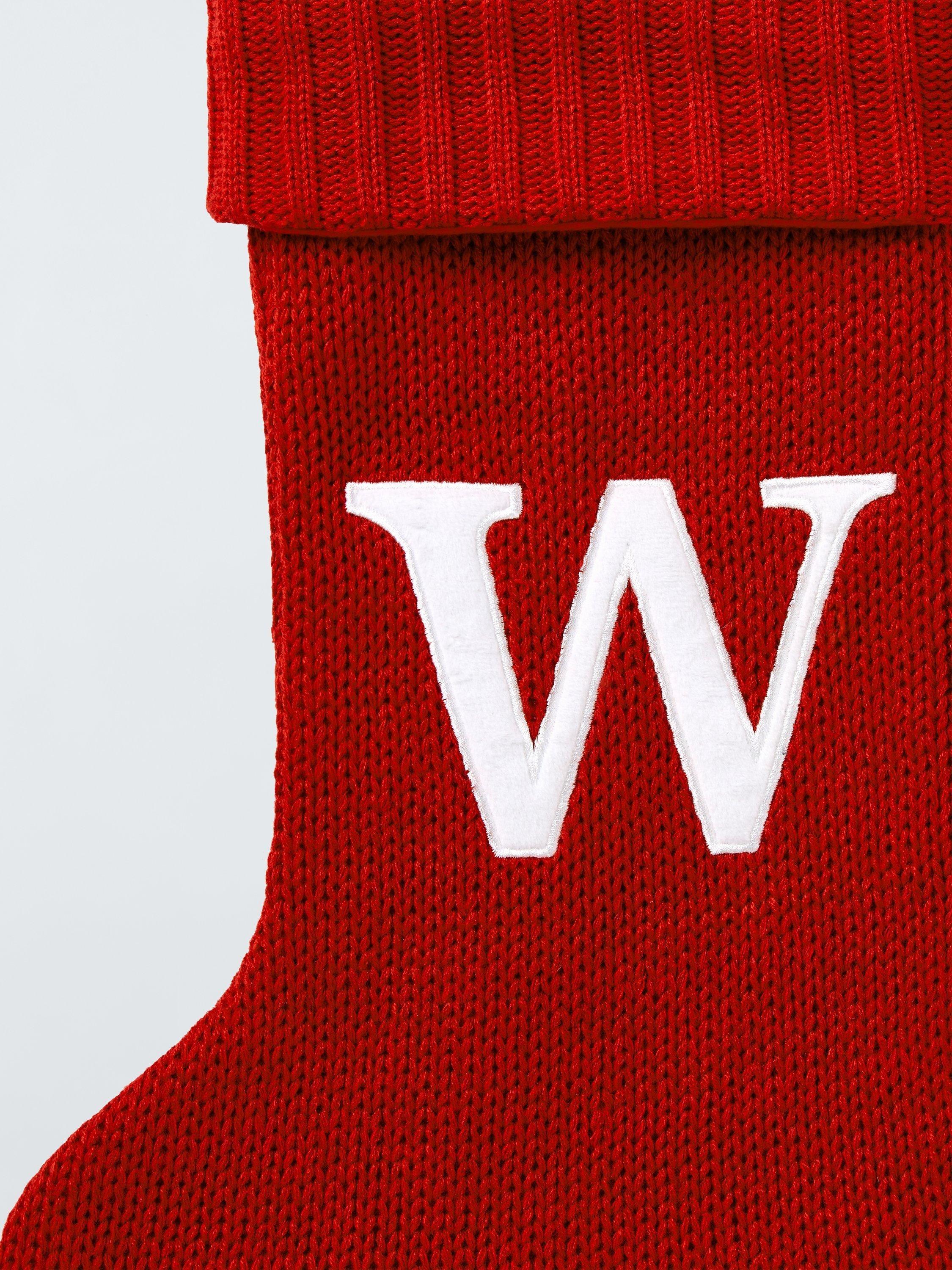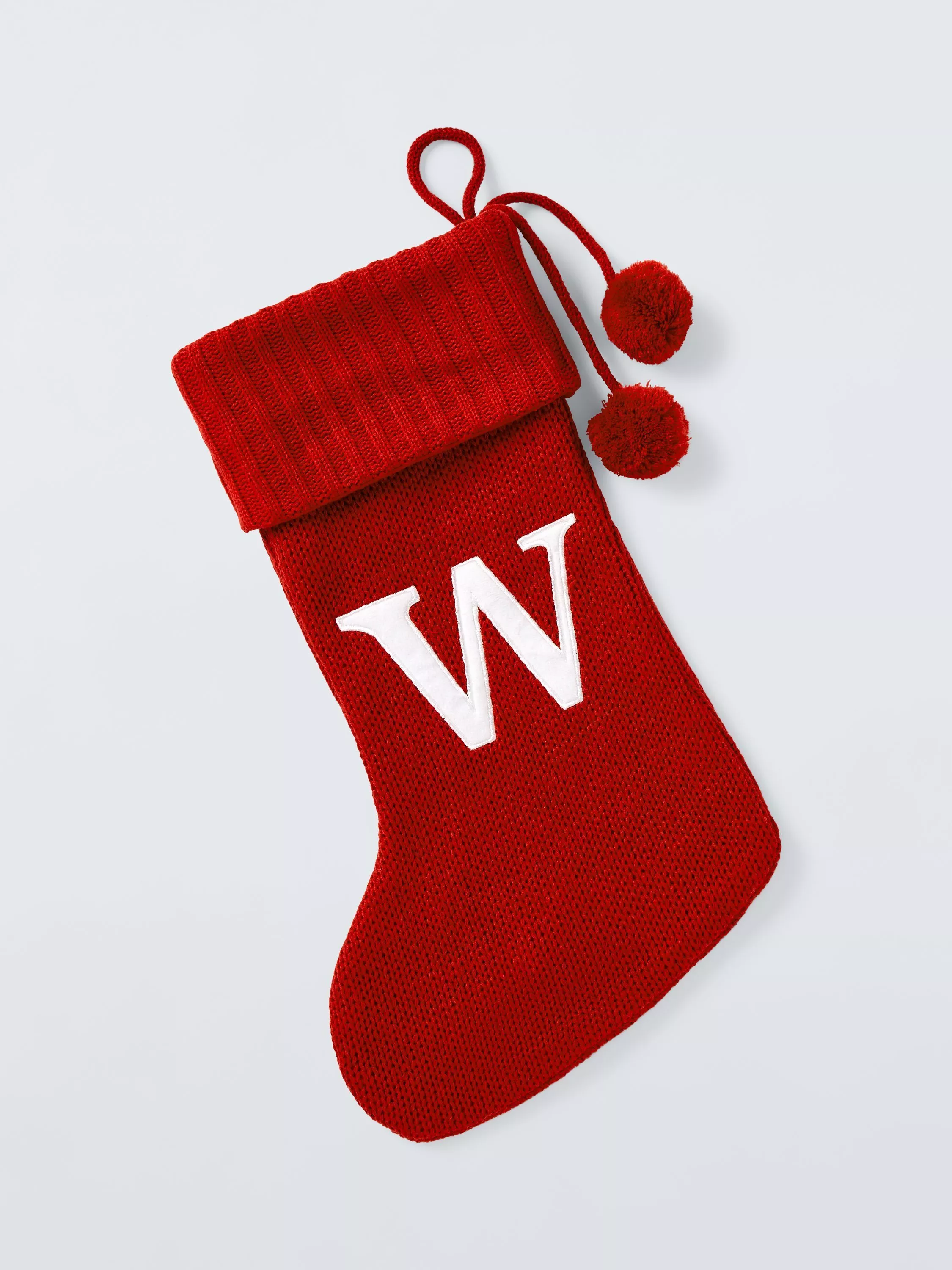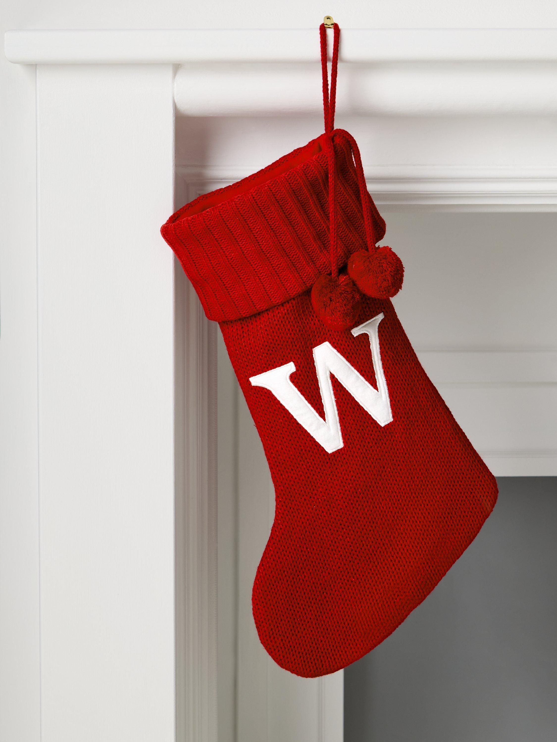 A knitted Christmas stocking trimmed with pom poms. Each one comes appliqued with an identifying letter of the alphabet, so you can hang one for every member of the family.