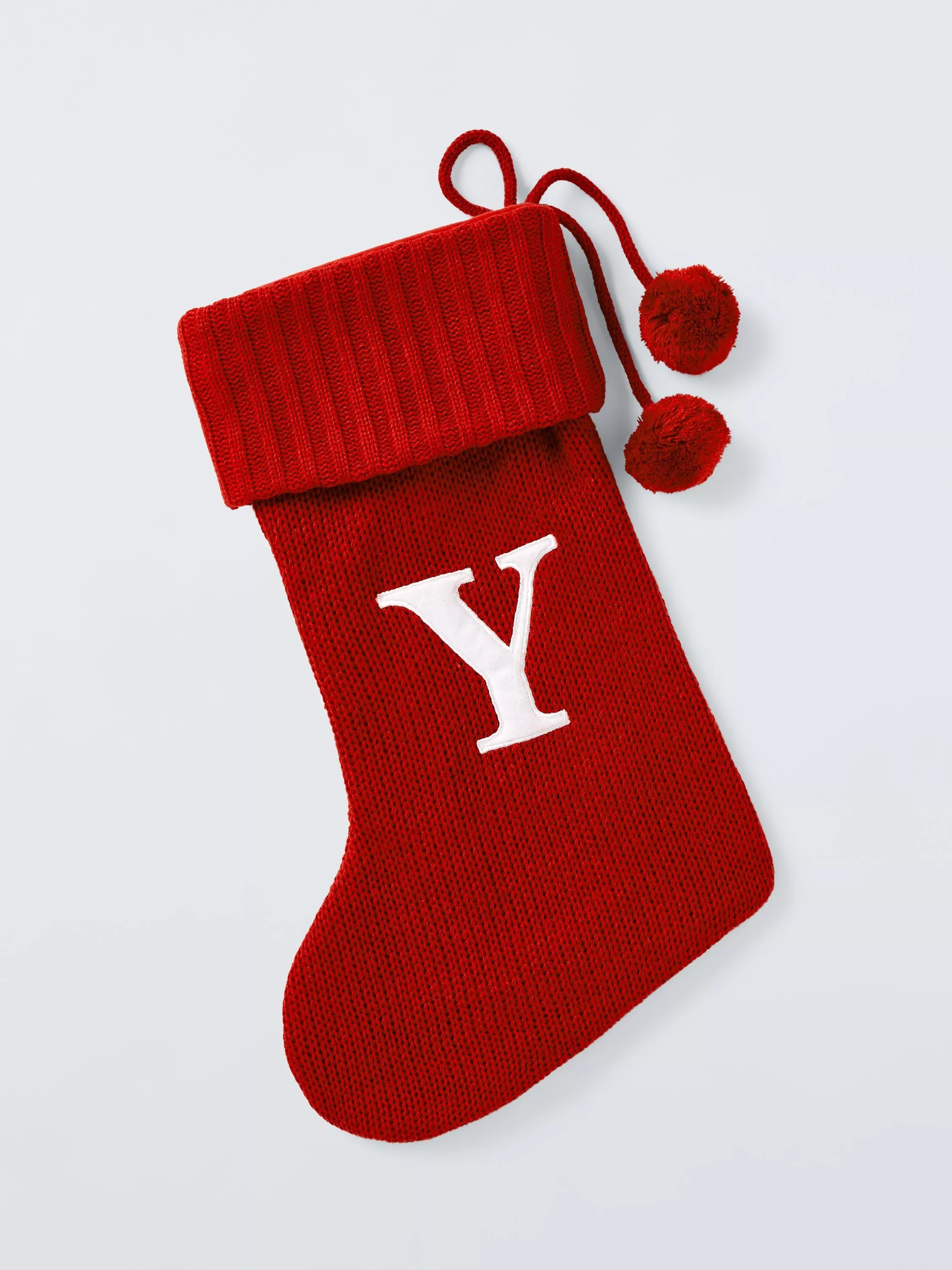 A knitted Christmas stocking trimmed with pom poms. Each one comes appliqued with an identifying letter of the alphabet, so you can hang one for every member of the family.
