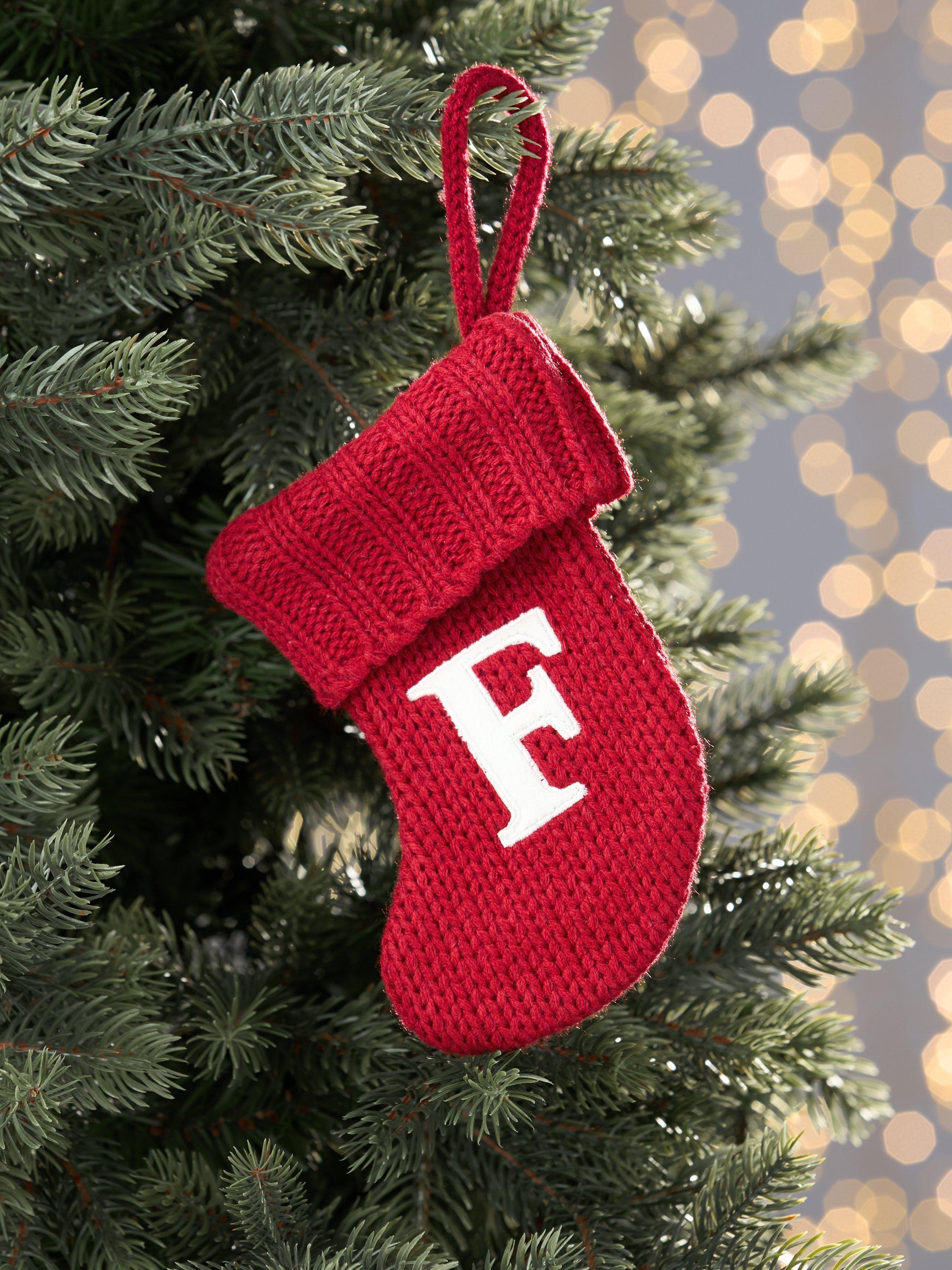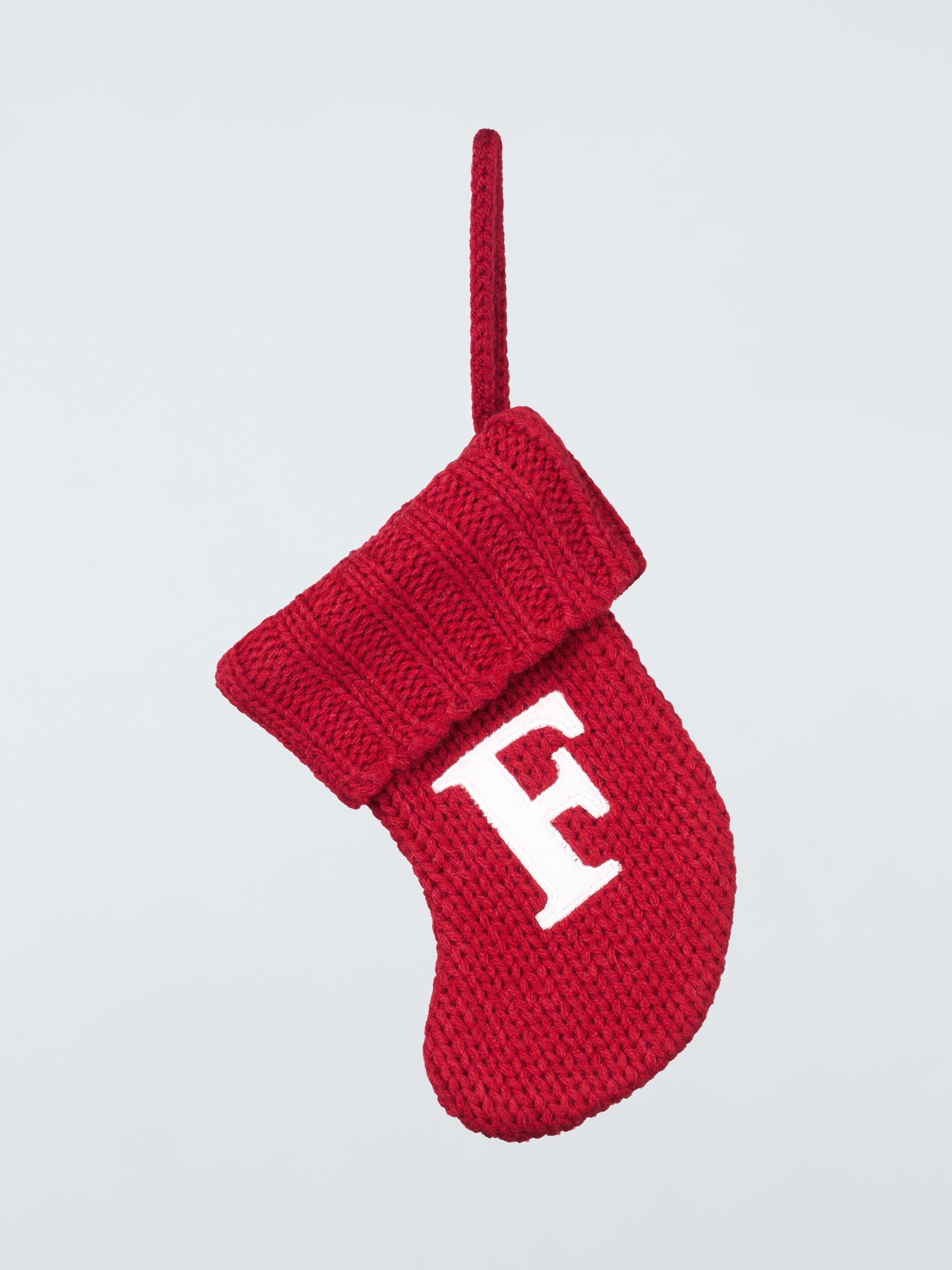 A knitted mini stocking with an alphabet motif.