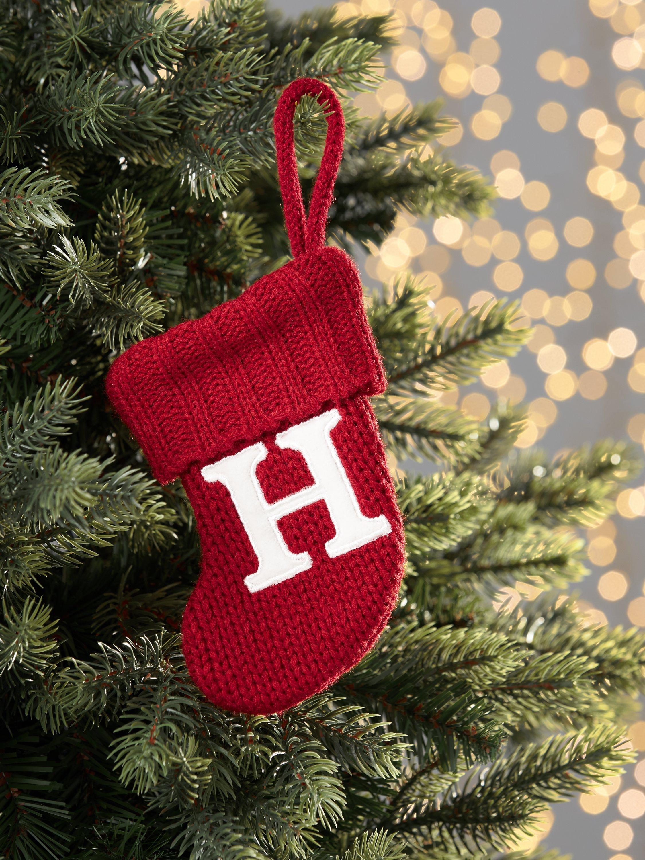 A knitted mini stocking with an alphabet motif.