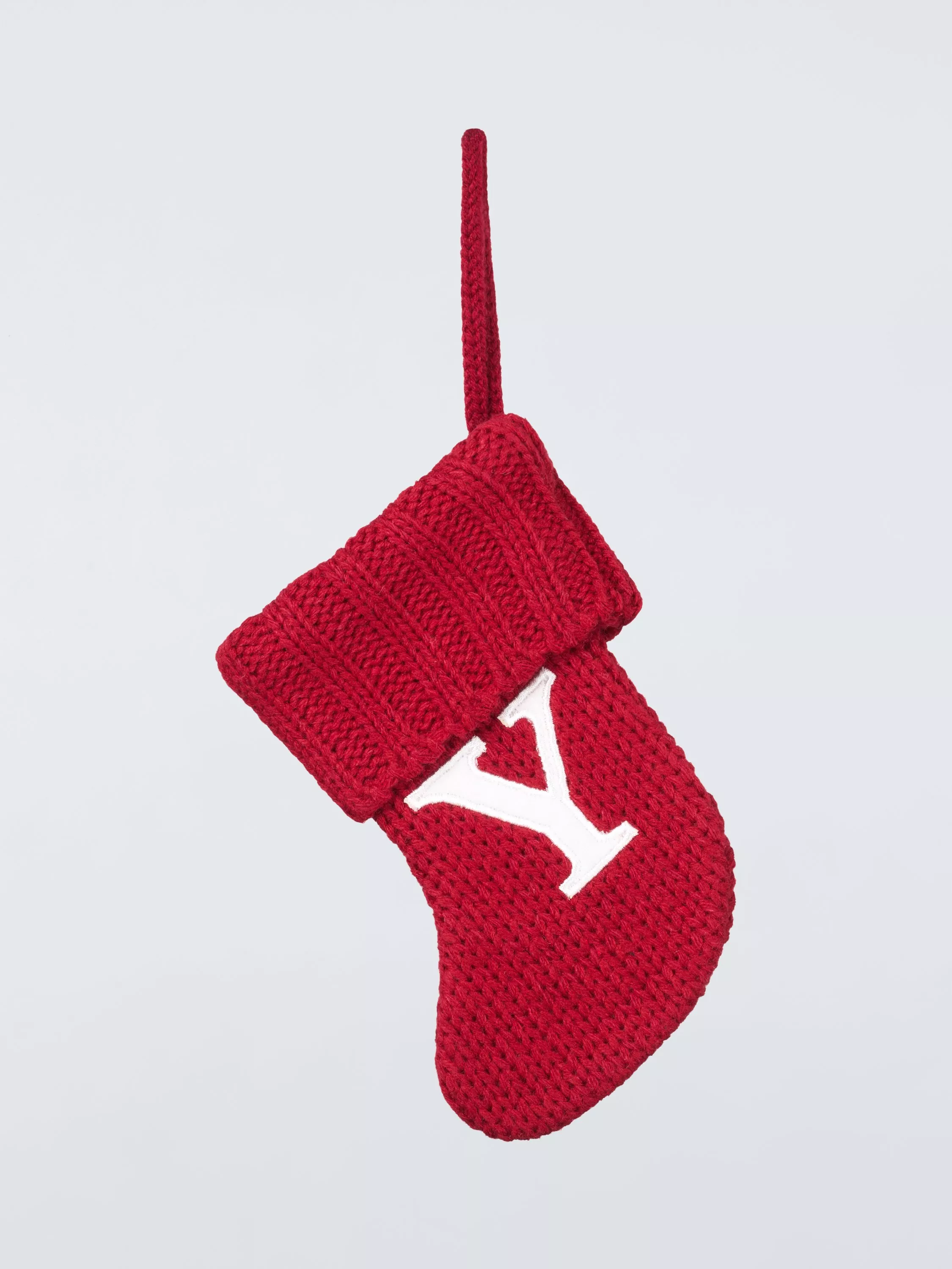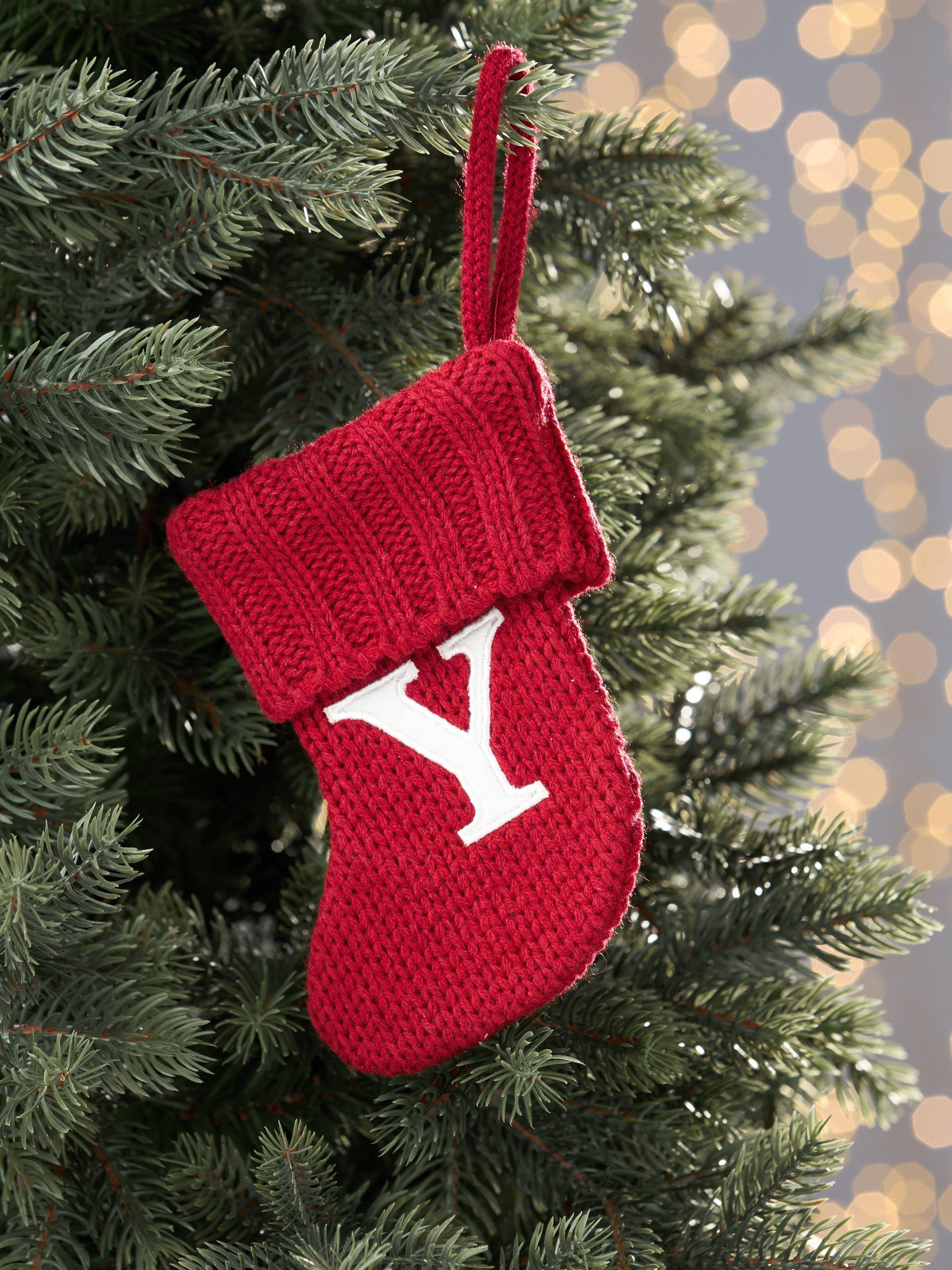 A knitted mini stocking with an alphabet motif.