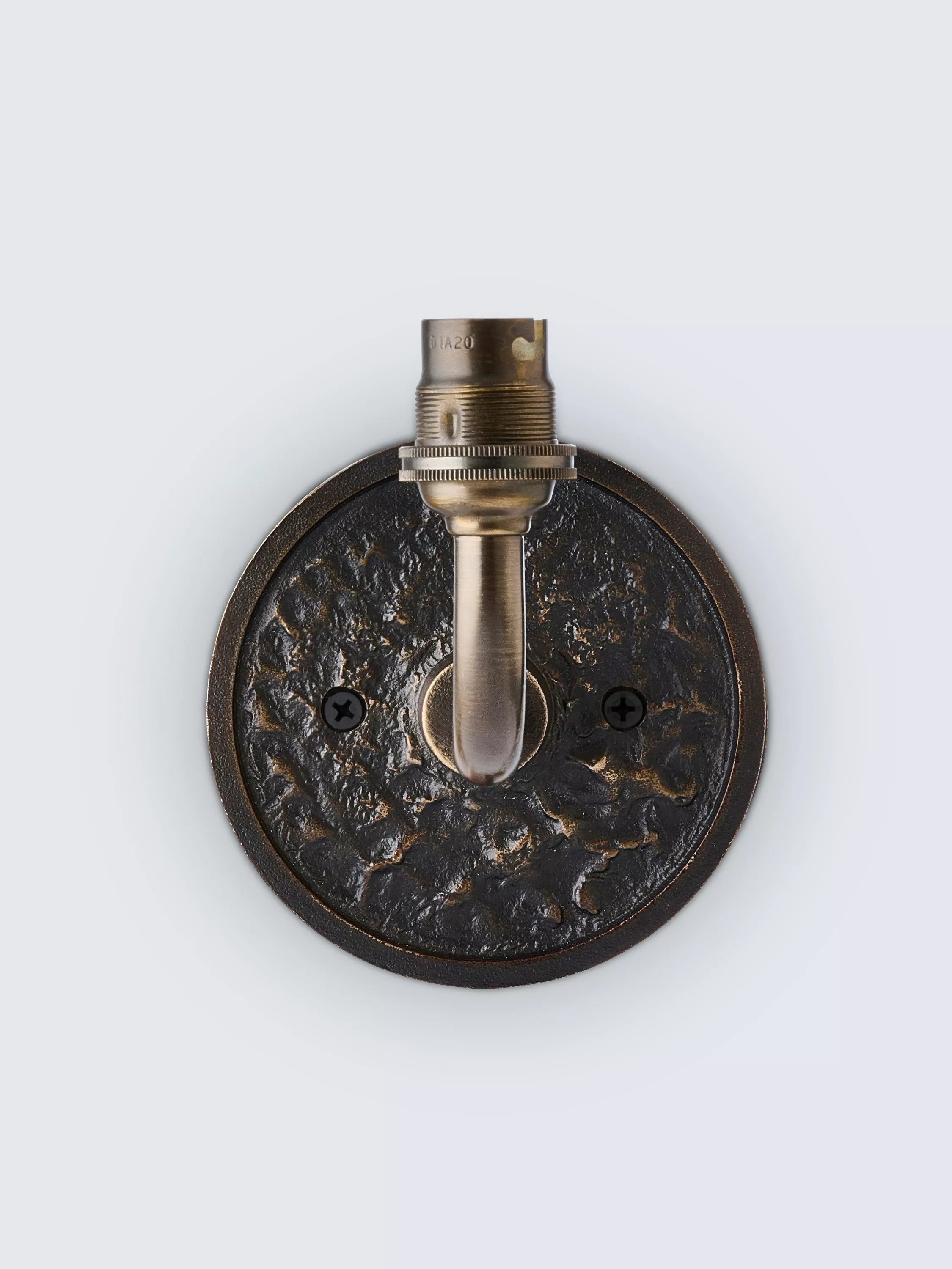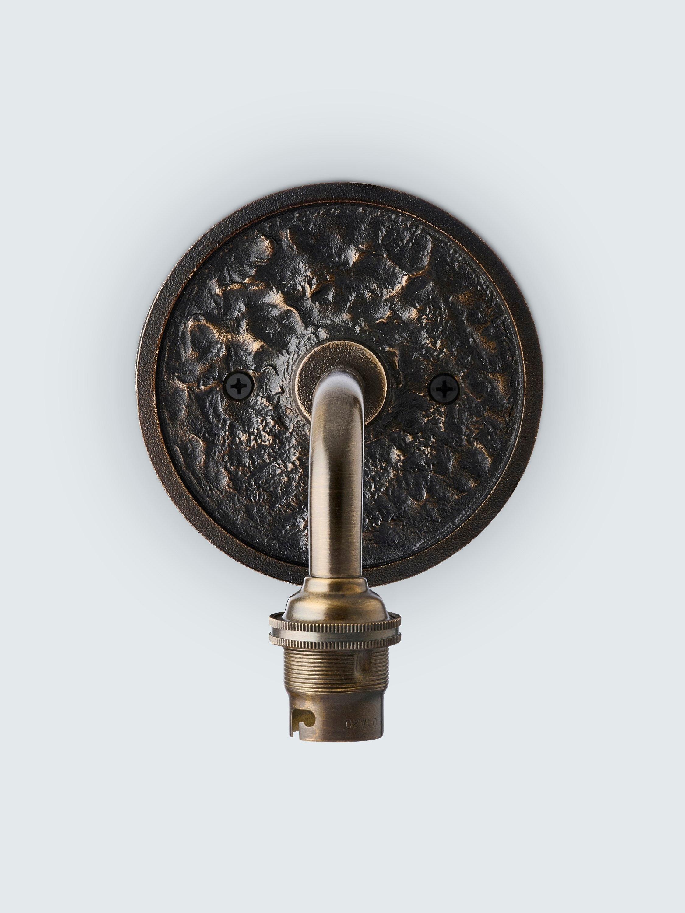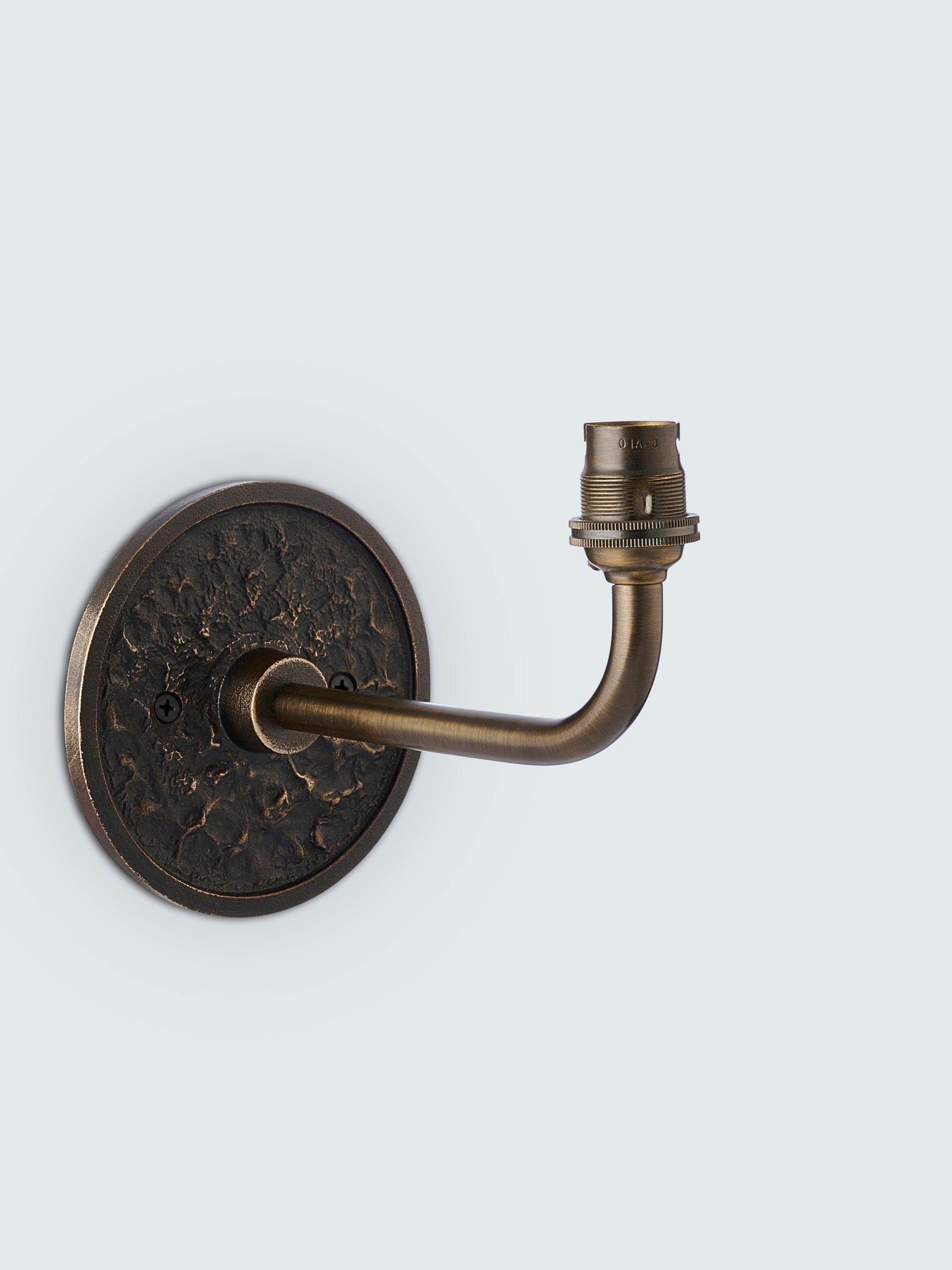 A beautiful die-cast wall back with a lunar-inspired texture, showcasing the craftsmanship of skilled metalworkers in India. Completed with a clean, modern arm shape. We recommend adding a fabric candle clip shade or a mini glass shade to complement this wall light base.