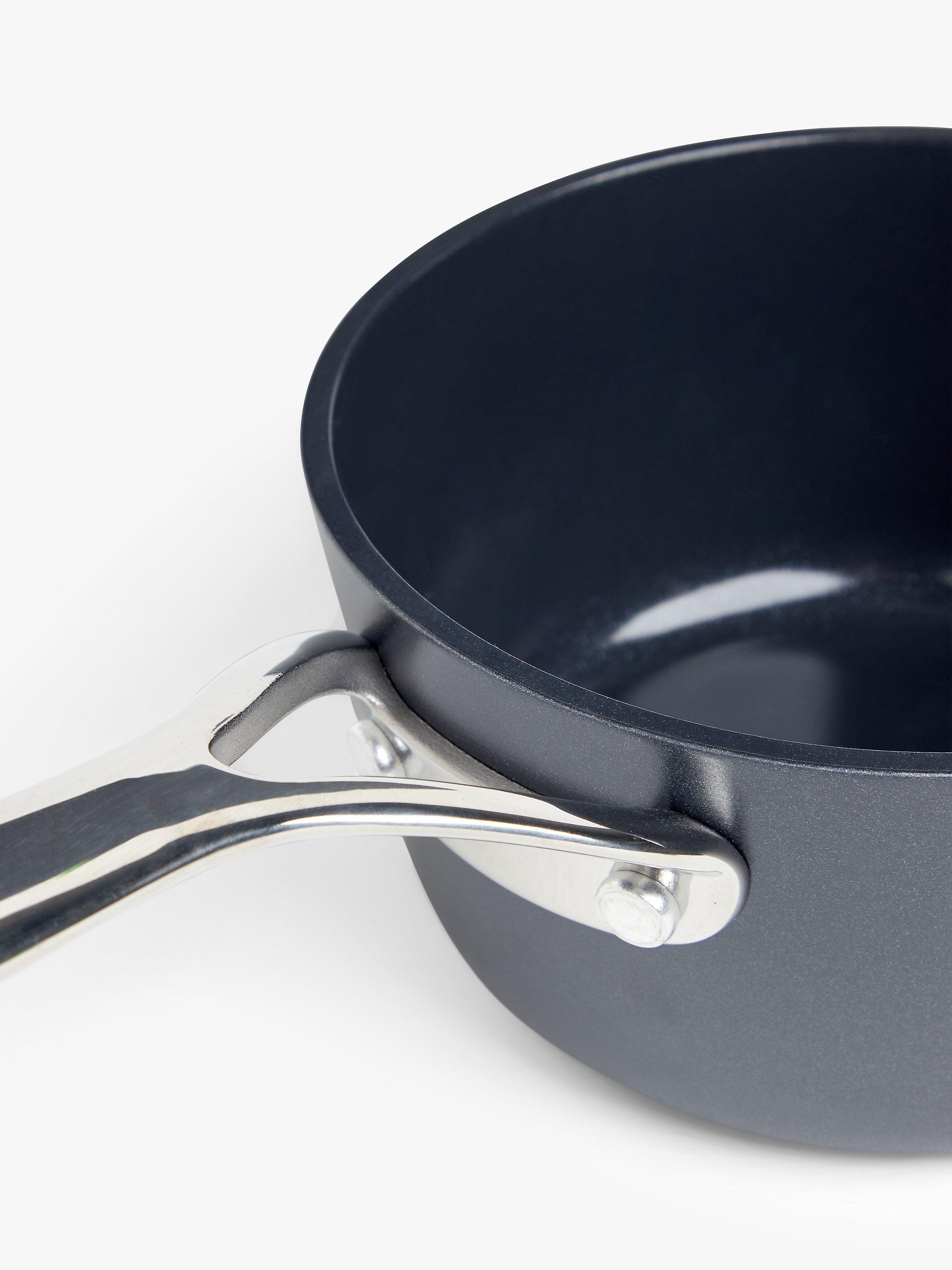 High-quality cookware with a modern look, made from heavy-gauge thick aluminium for superior heat distribution. The stainless steel handle is riveted for strength and designed for safe and comfortable use. Each pan has a 100% full induction plate for better conductivity when used on induction hobs and a smooth-finish ceramic non-stick coating.