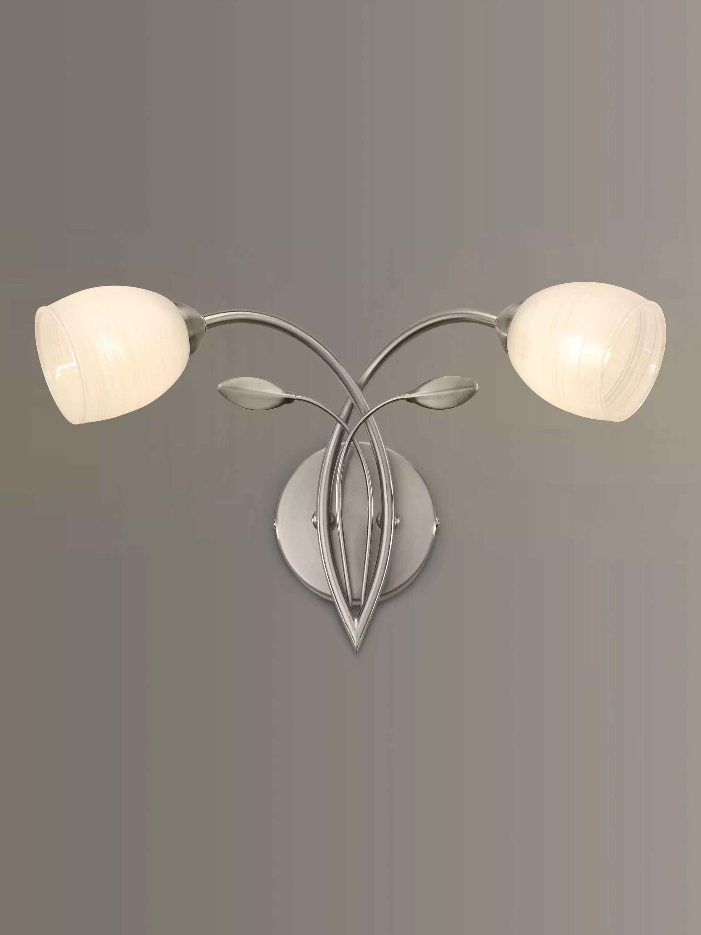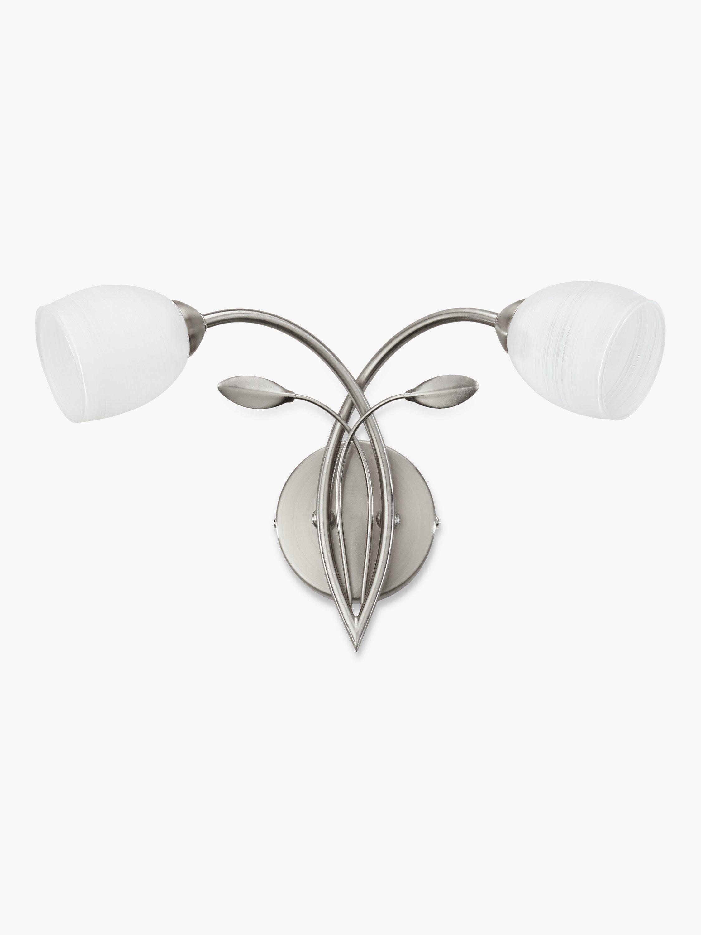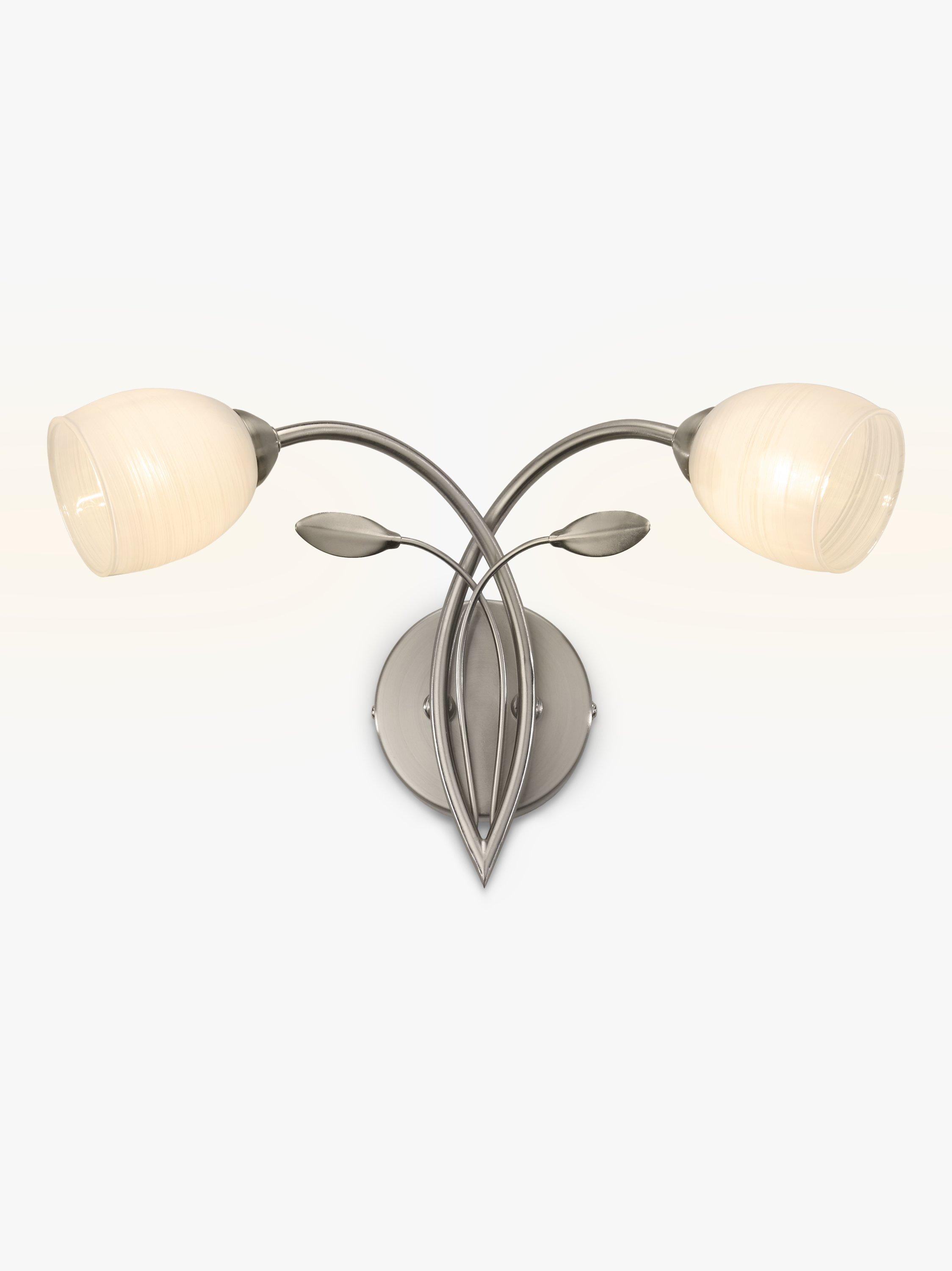 A classically styled twin wall light. Intertwined arms with small leaf details add an opulent air to the opal glass tulip shaped shades.
