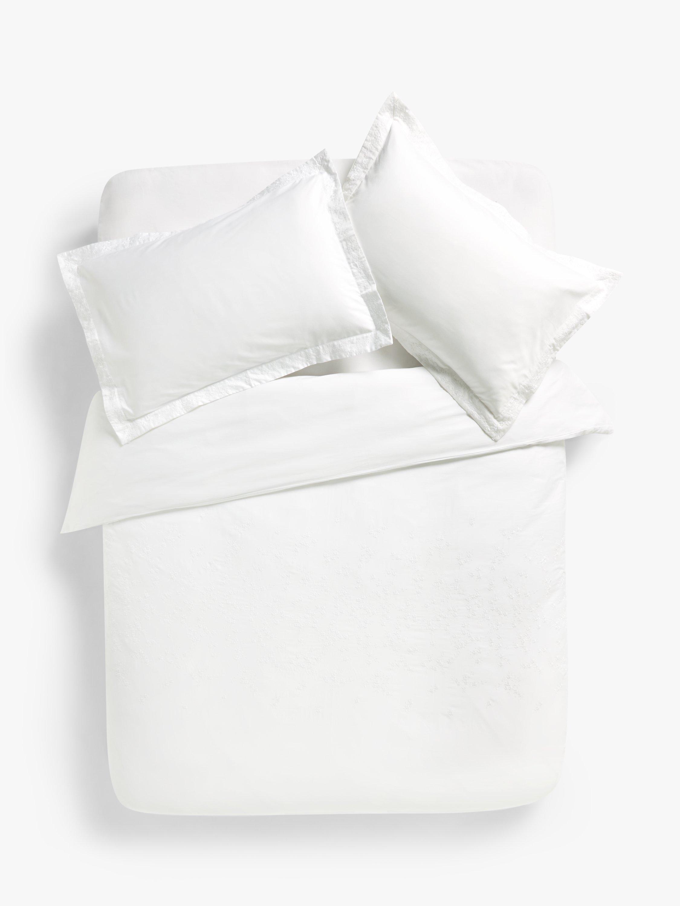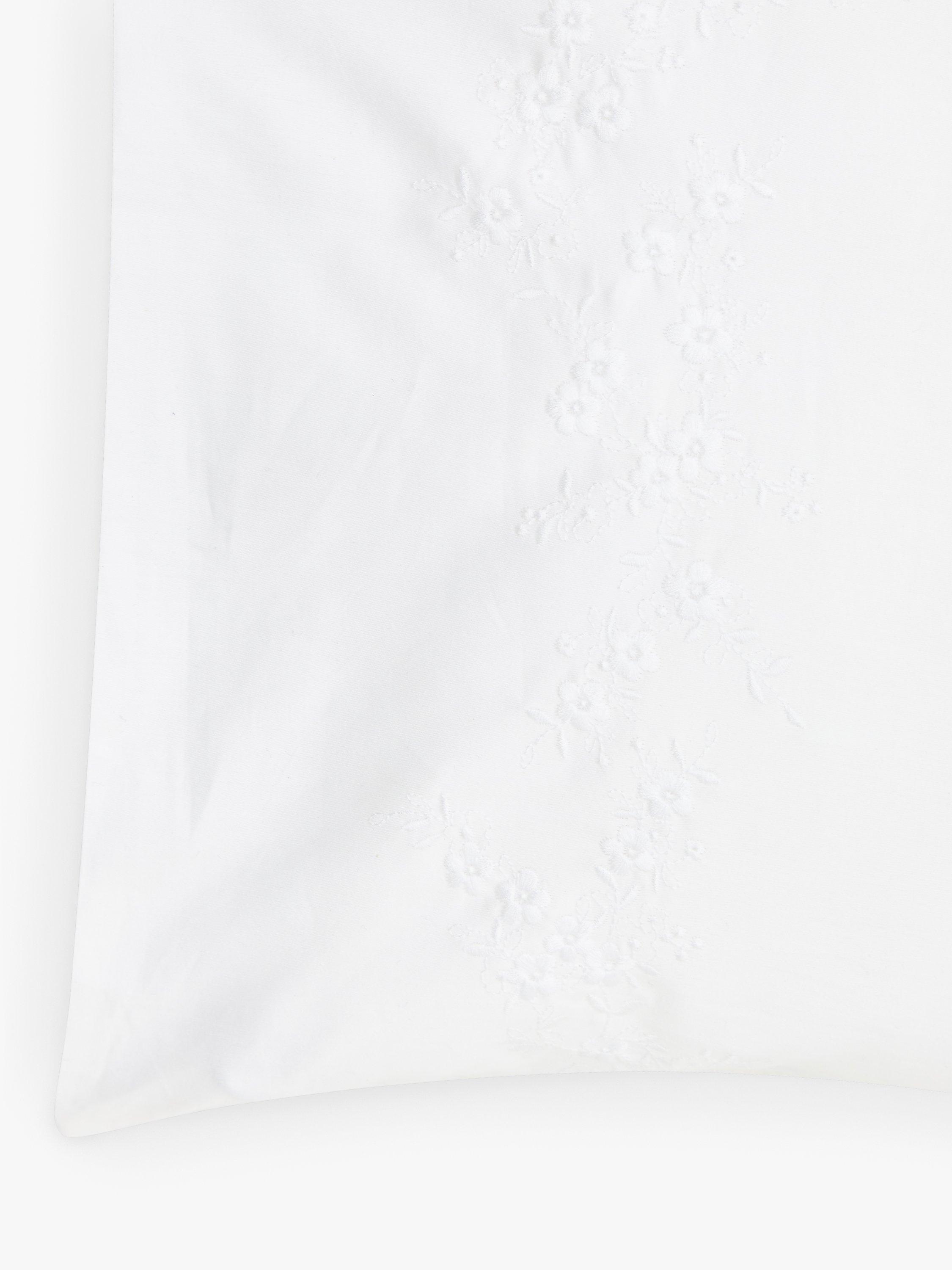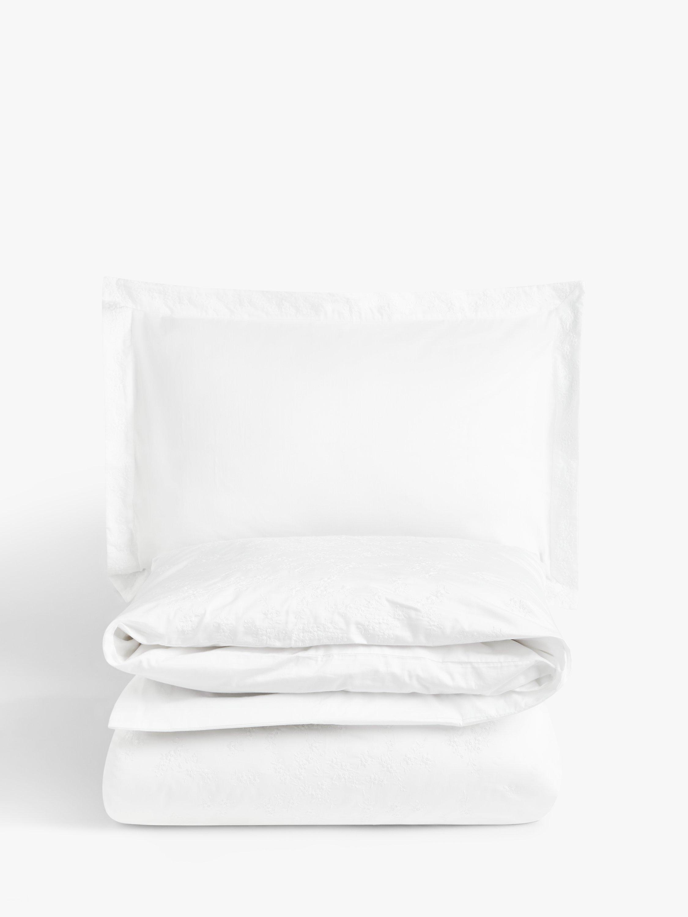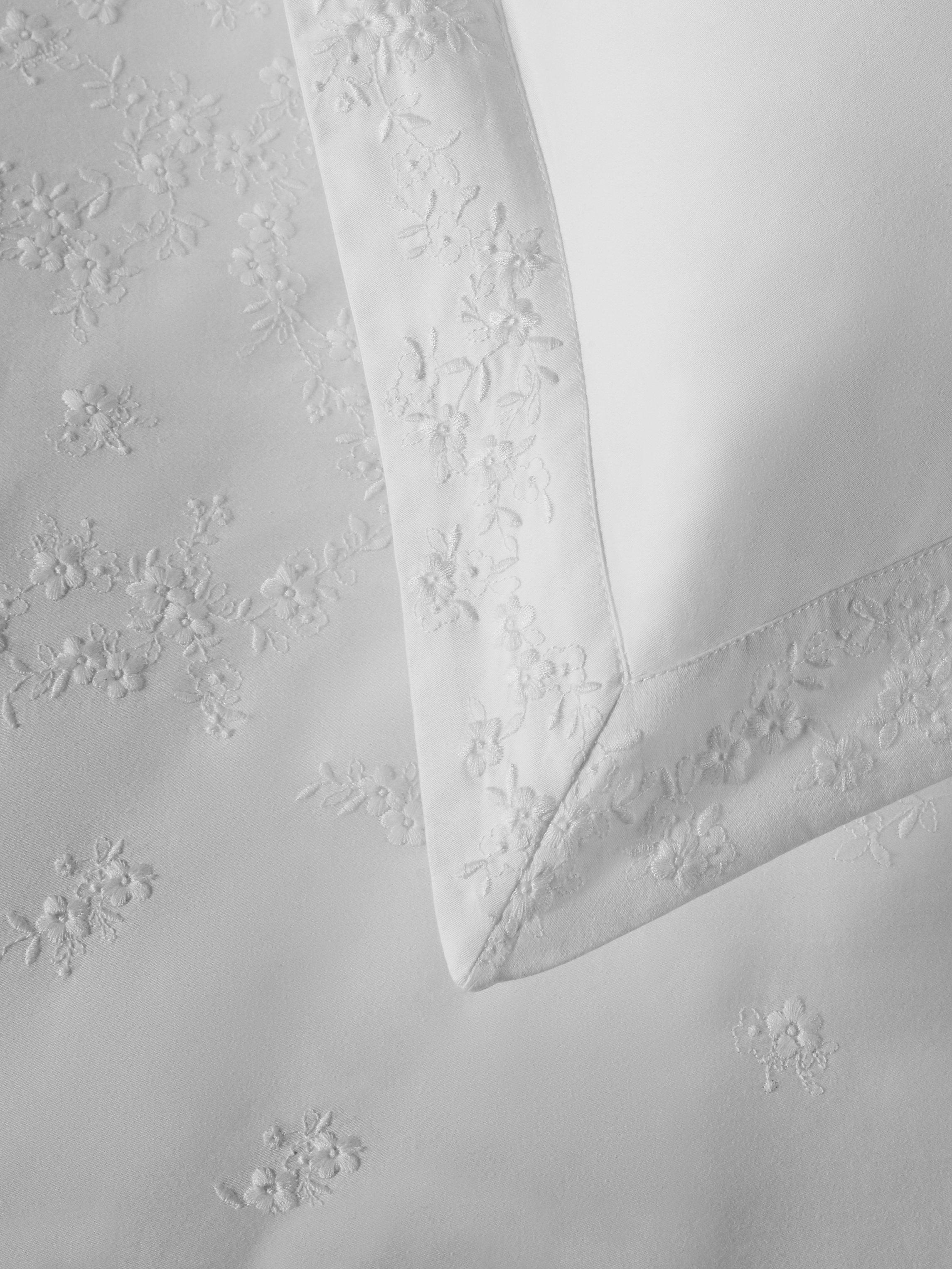 This beautiful and timeless design features tiny white flower clusters, machine embroidered onto the pillowcases and the top part of the duvet cover. Made from 400 thread count cotton.
