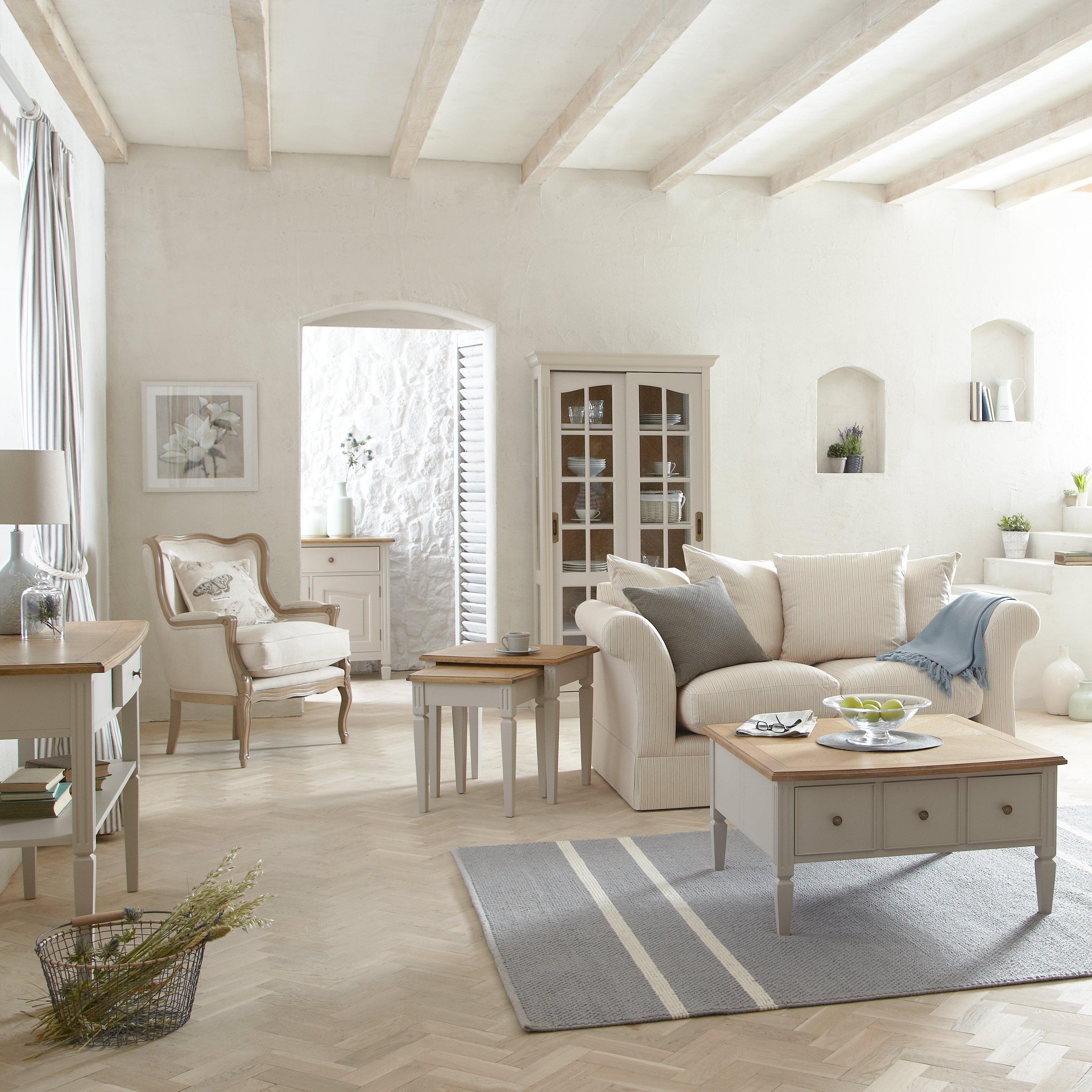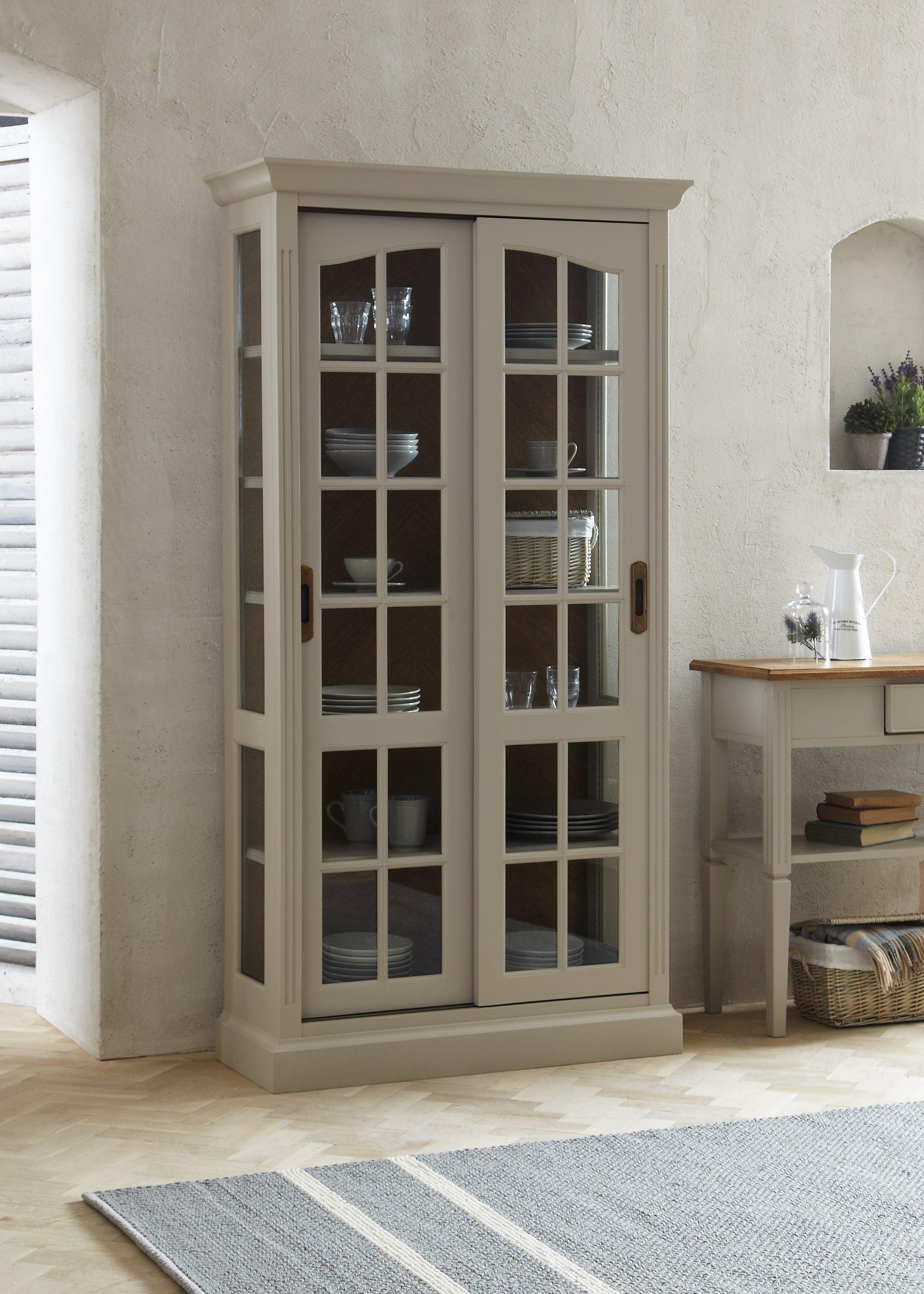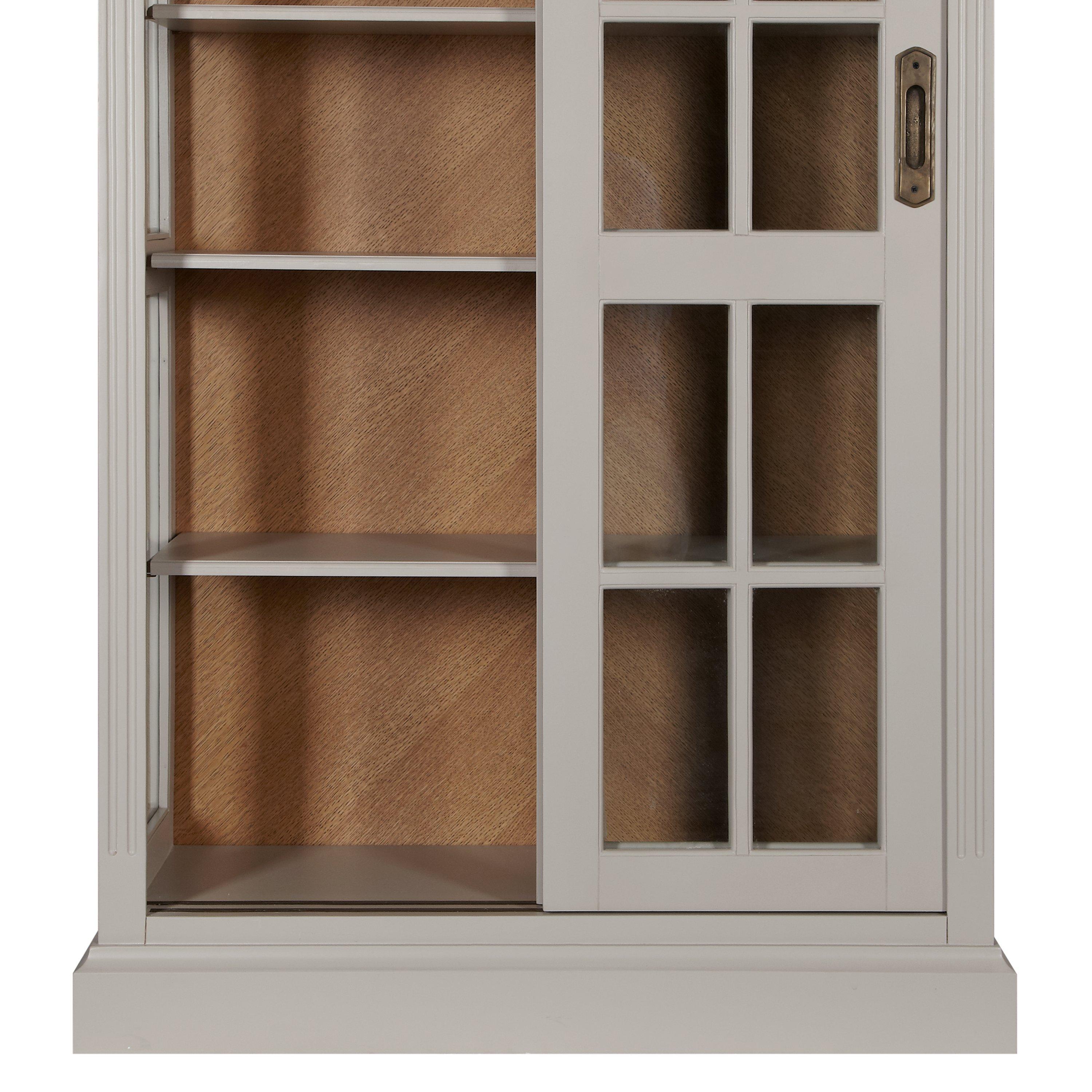 This elegant, French inspired table features a soft grey painted finish and beautiful parquet oak top with a lightly distressed finish. With one fixed and three adjustable shelves, the cabinet offers a wealth of storage space and allows you to show off your favourite possessions with a glazed, sliding door design.