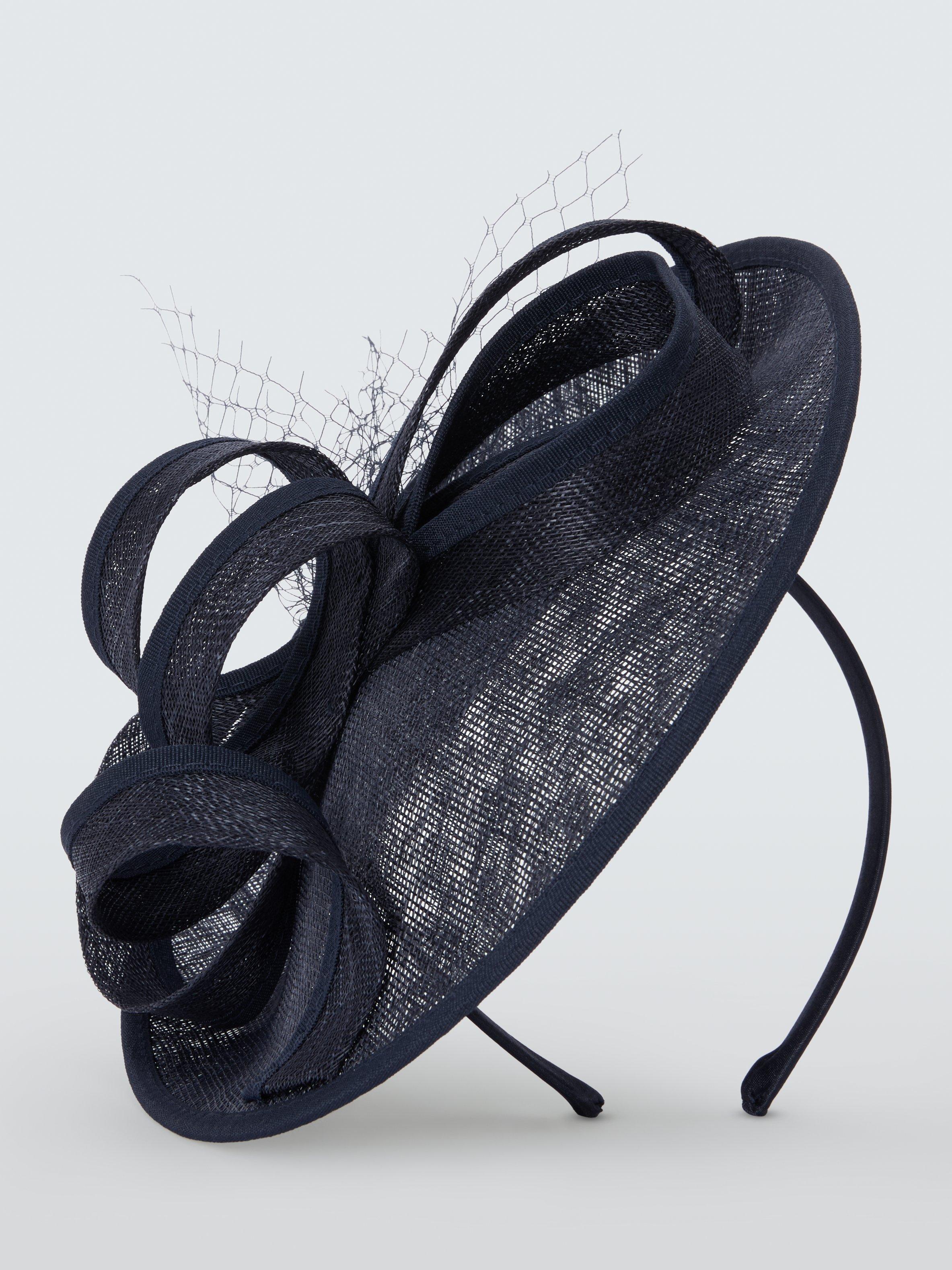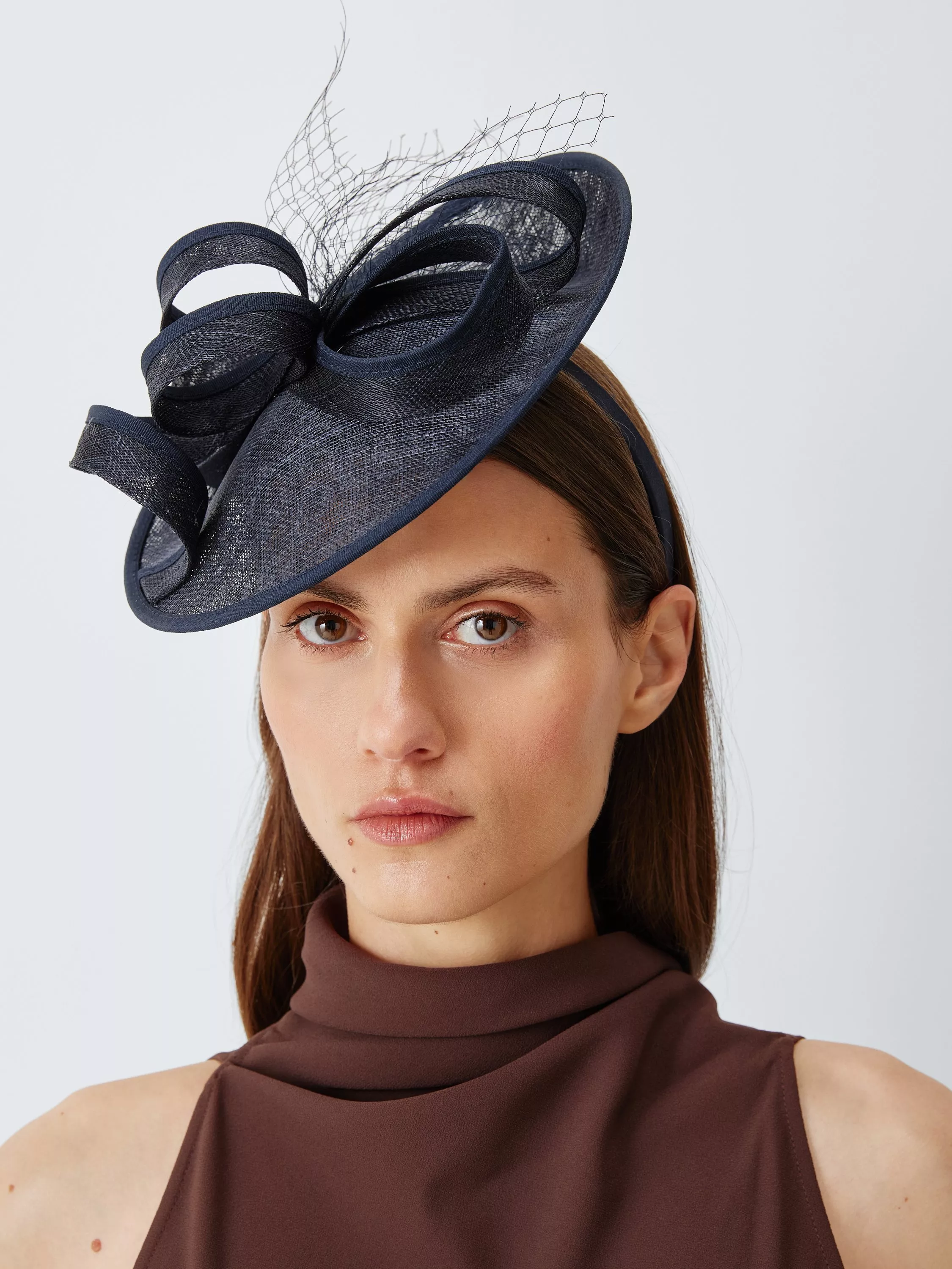 A small disc fascinator with ribbon and mesh elements. Made from durable and flexible abaca.