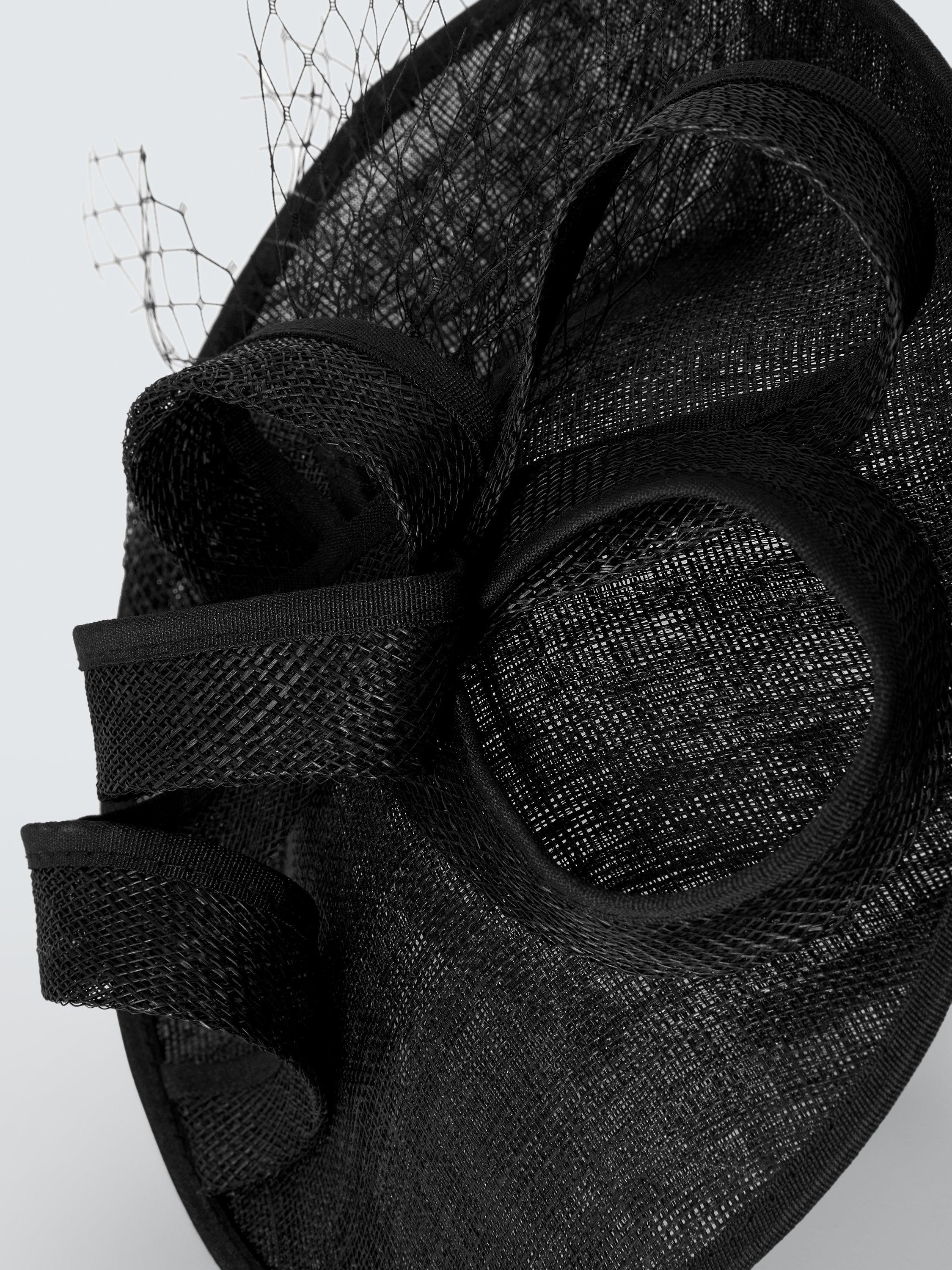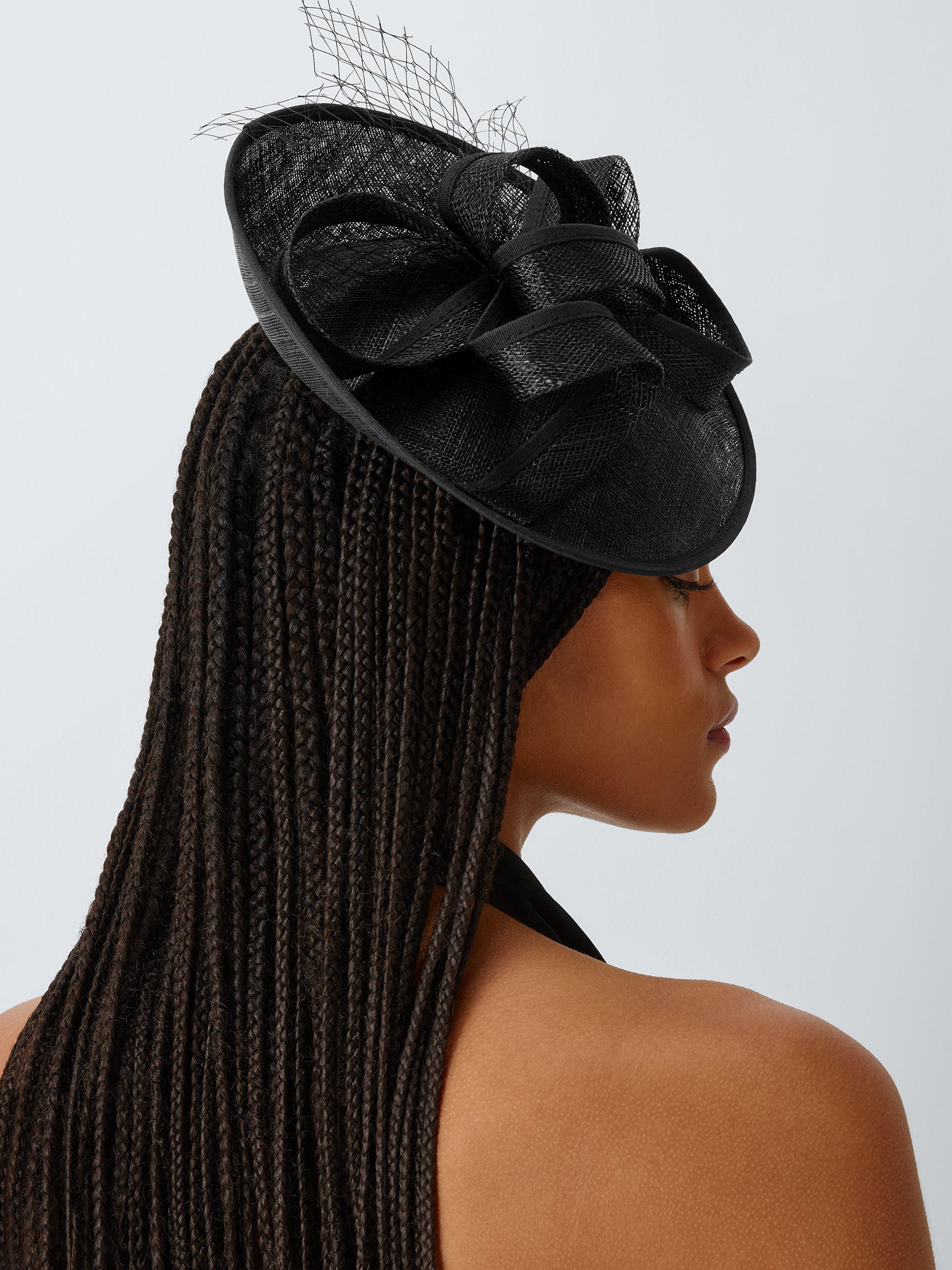 A small disc fascinator with ribbon and mesh elements. Made from durable and flexible abaca.