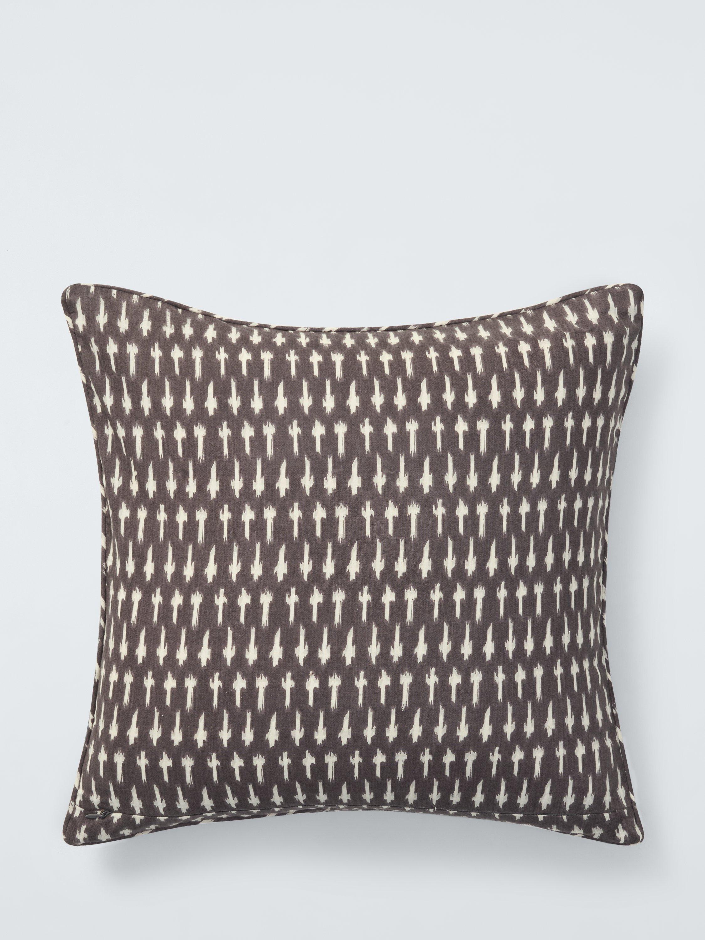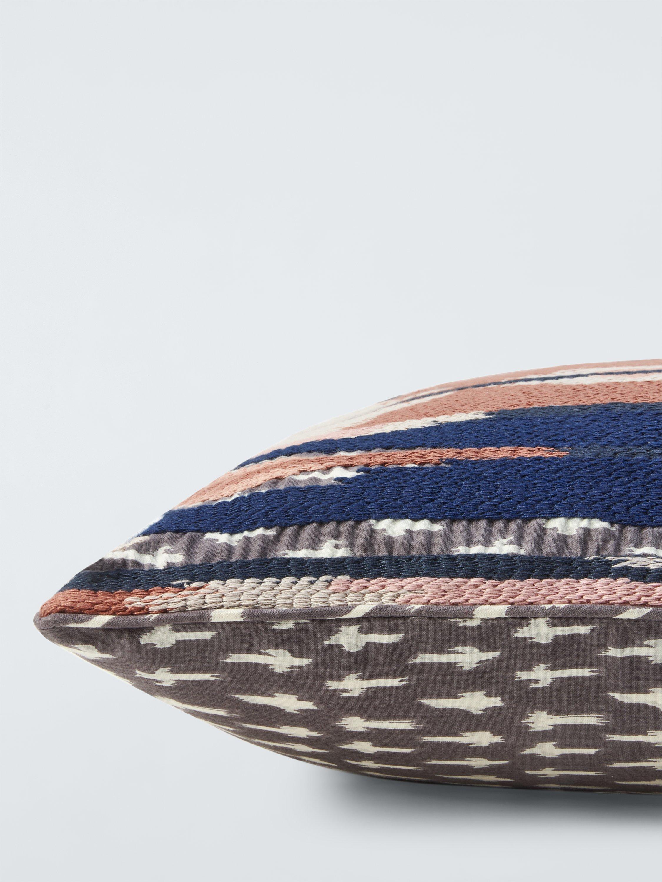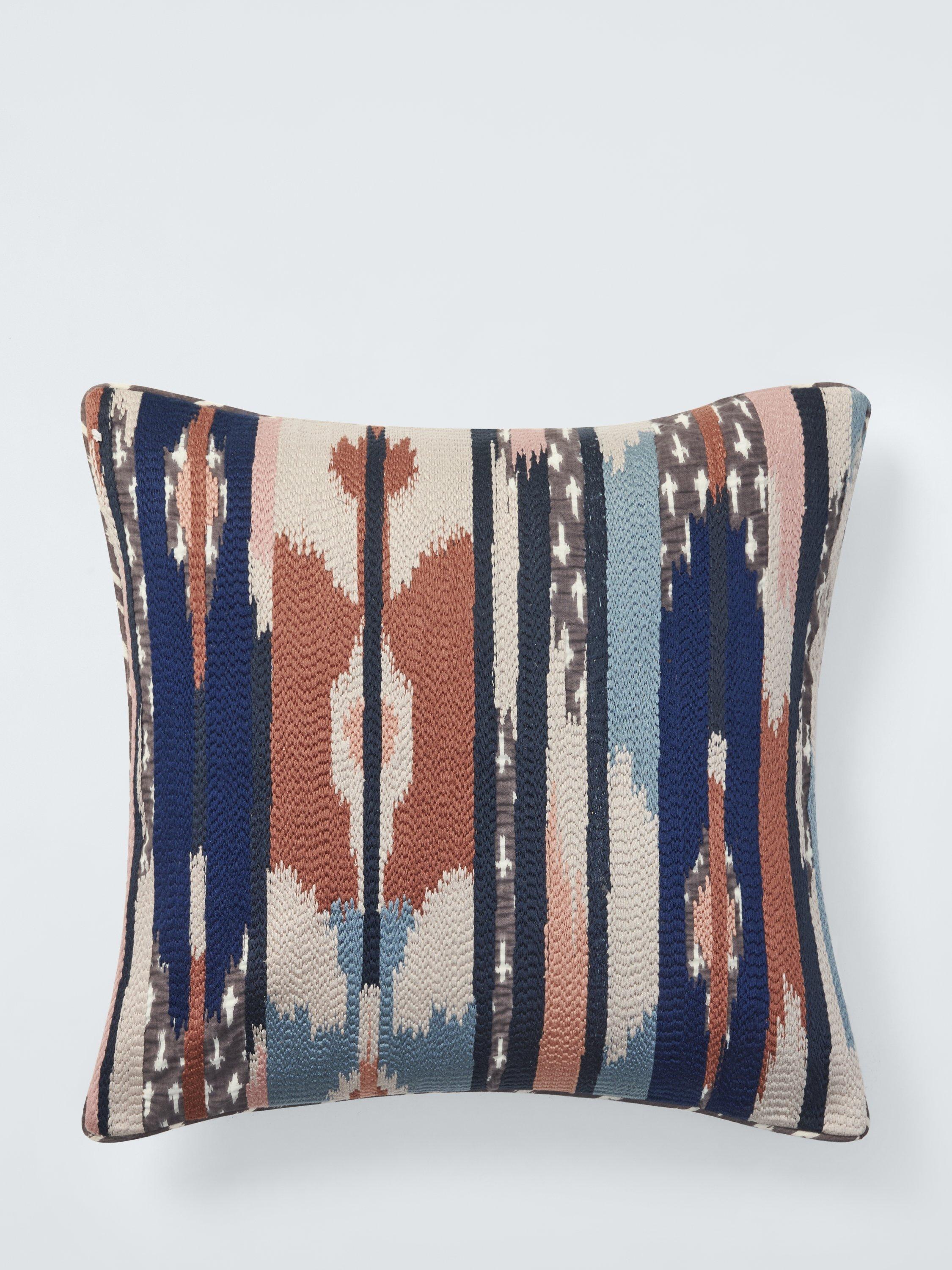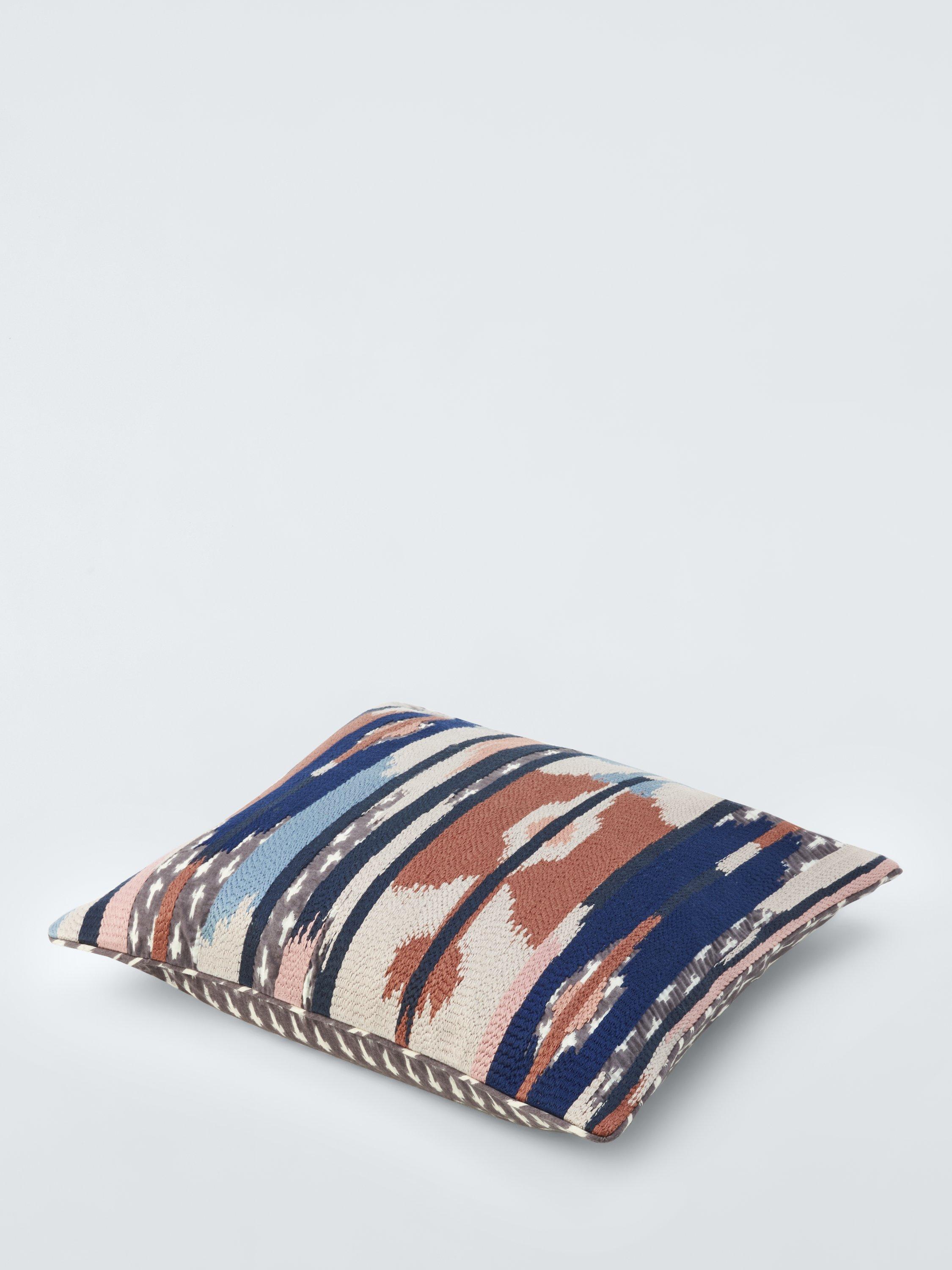A brightly-coloured longstitched Ikat cushion inspired by our Fusion home design theme. The base fabric is hand screen printed in grey and white, adding depth and texture to the design.