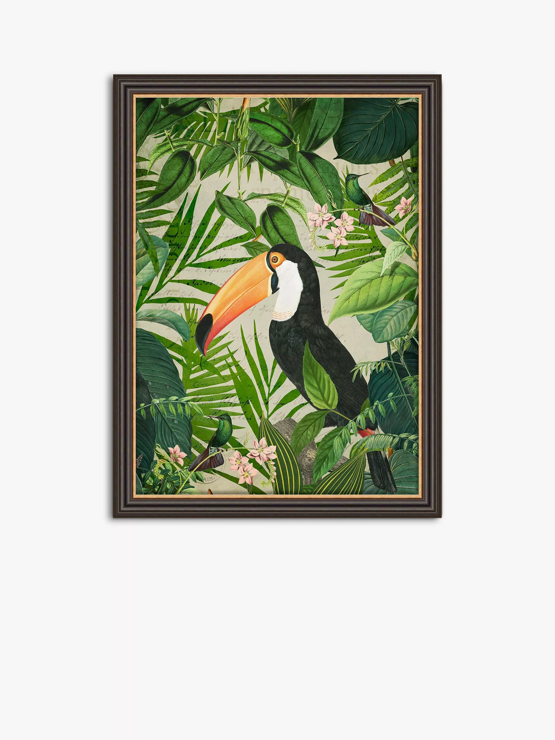 A framed unglazed print of a toucan in the jungle by artist Andrea Haase. Made in the UK, it's finished with a hand-applied artist's texture gel and presented in a traditional-style black and antique gold frame, ready to hang on your wall.