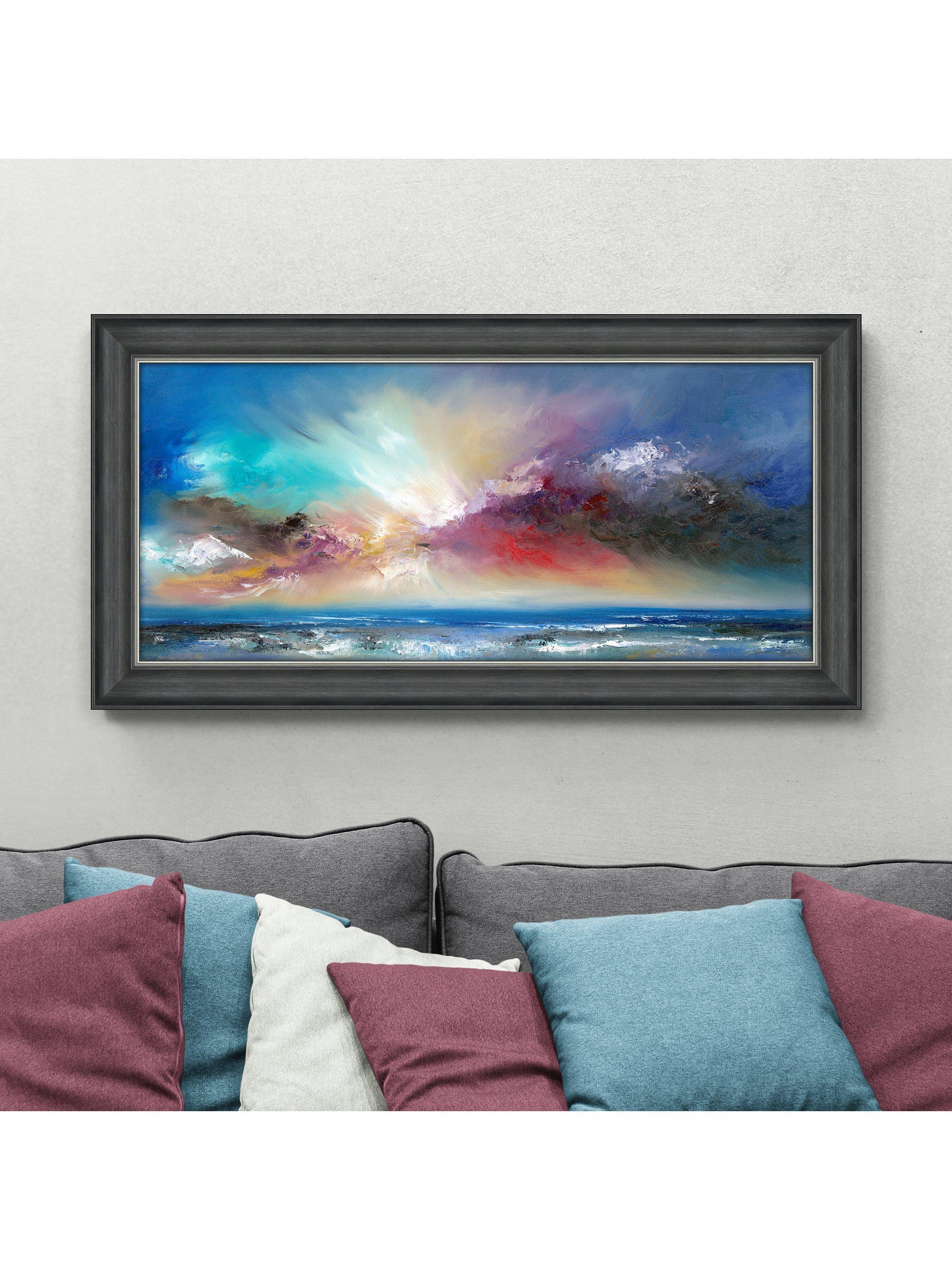 A framed, unglazed print of a dramatic and vibrant coastal scene by artist Anna Schofield. Made in the UK, finished with a hand-applied artist's texture gel and presented in a dark grey frame with an inner silver edge accent, ready to hang on your wall.