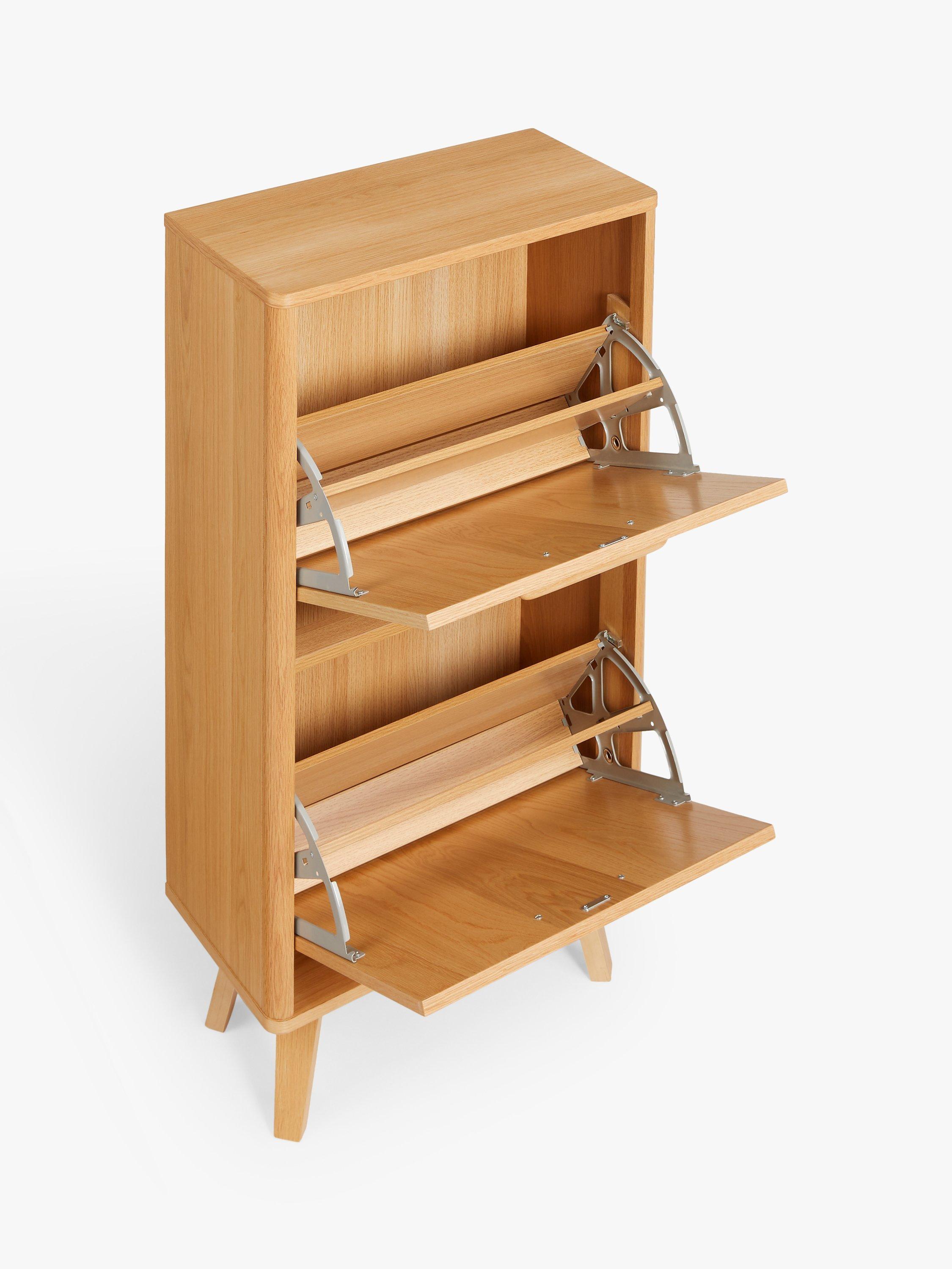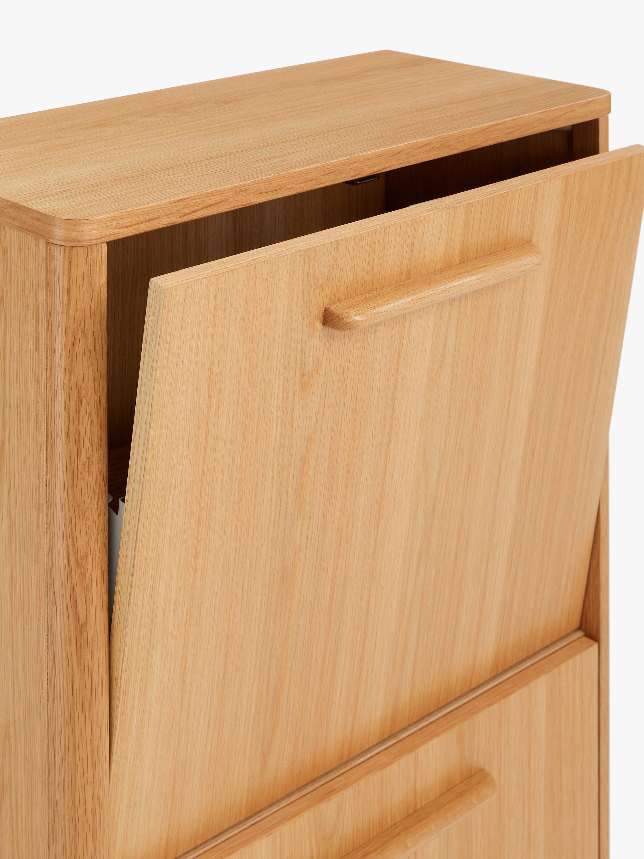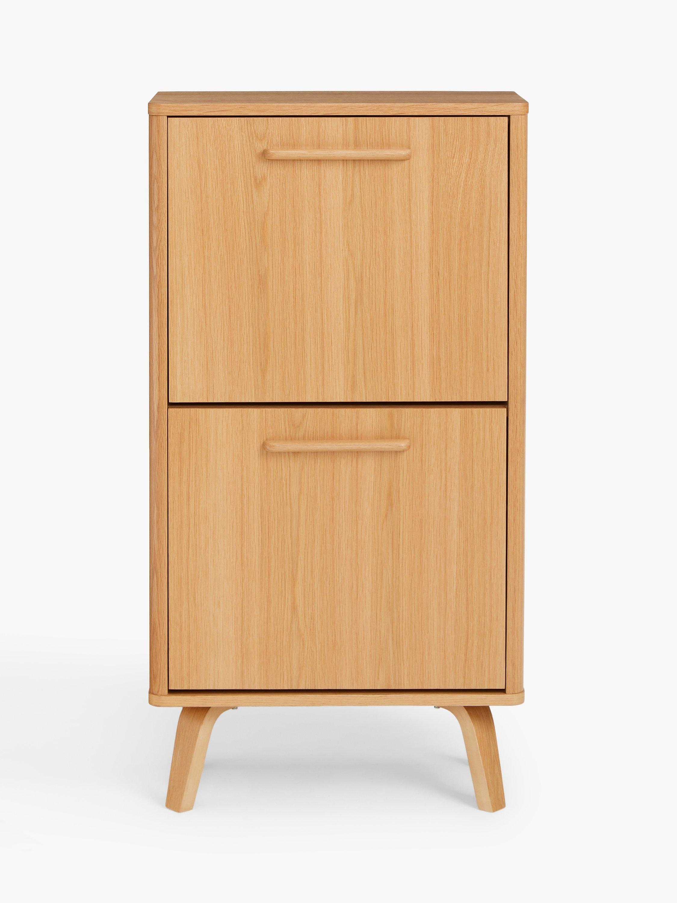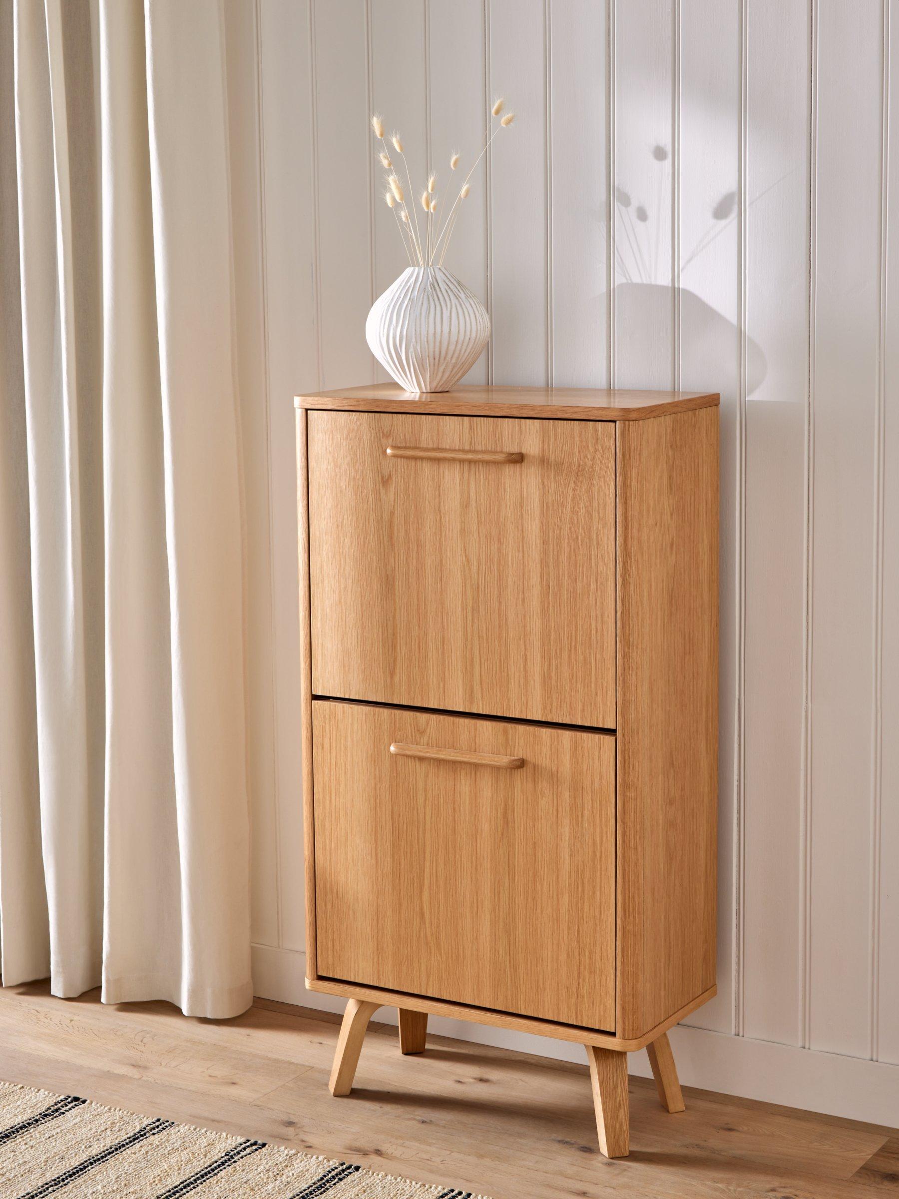 This oak veneer shoe storage unit offers relaxed mid-century styling, with classic splayed legs that are set under the base and linear handles that meet in the centre, sweeping a line across the front of the piece to give the simple profile an elegant focal point.