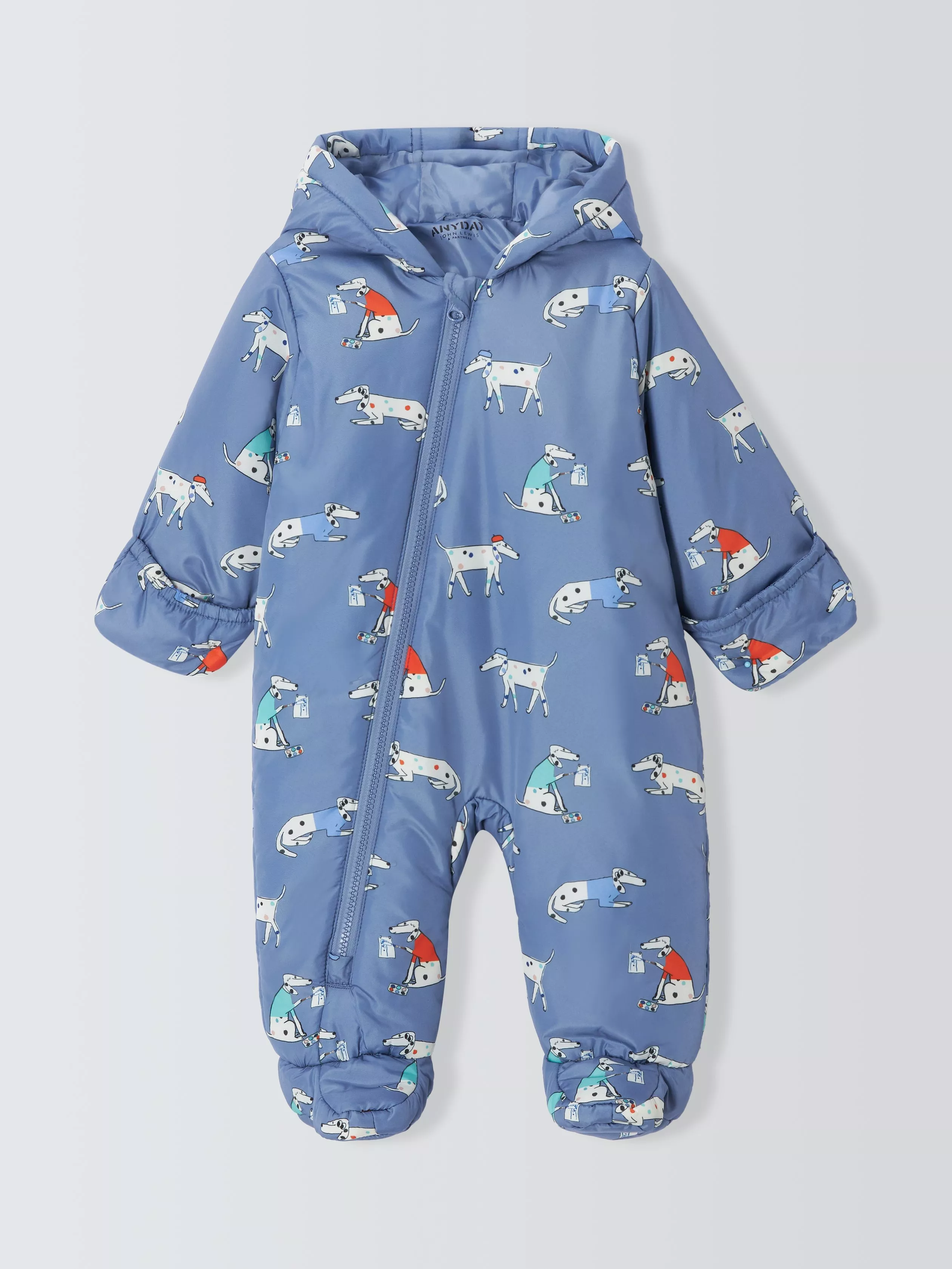 Baby snowsuit with all over Dalmatian quilted design. Featuring a zip opening and hood.