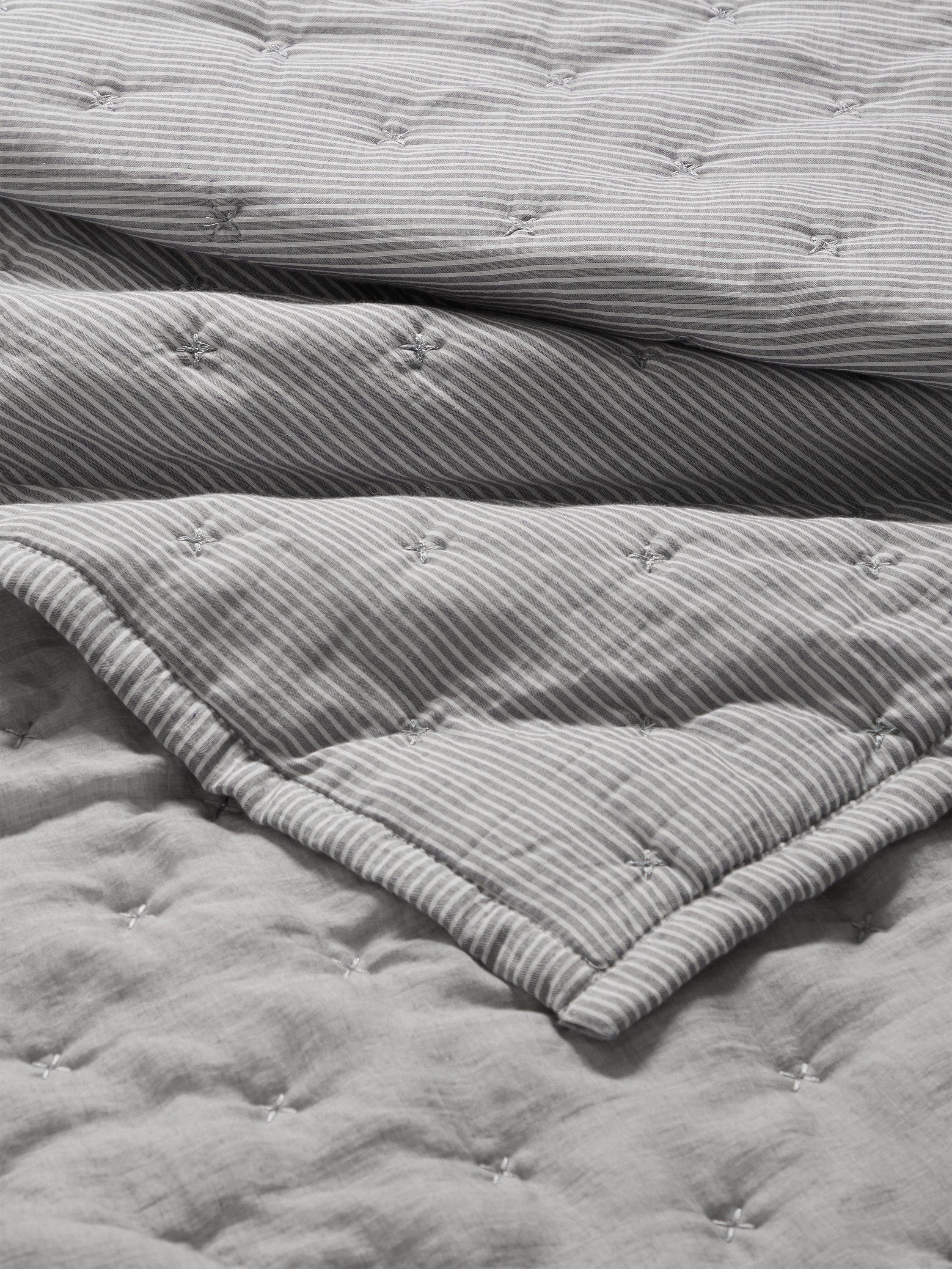 The perfect lightweight extra layer for autumn nights, this chambray striped bedspread has a relaxed and classic charm and is reversible.