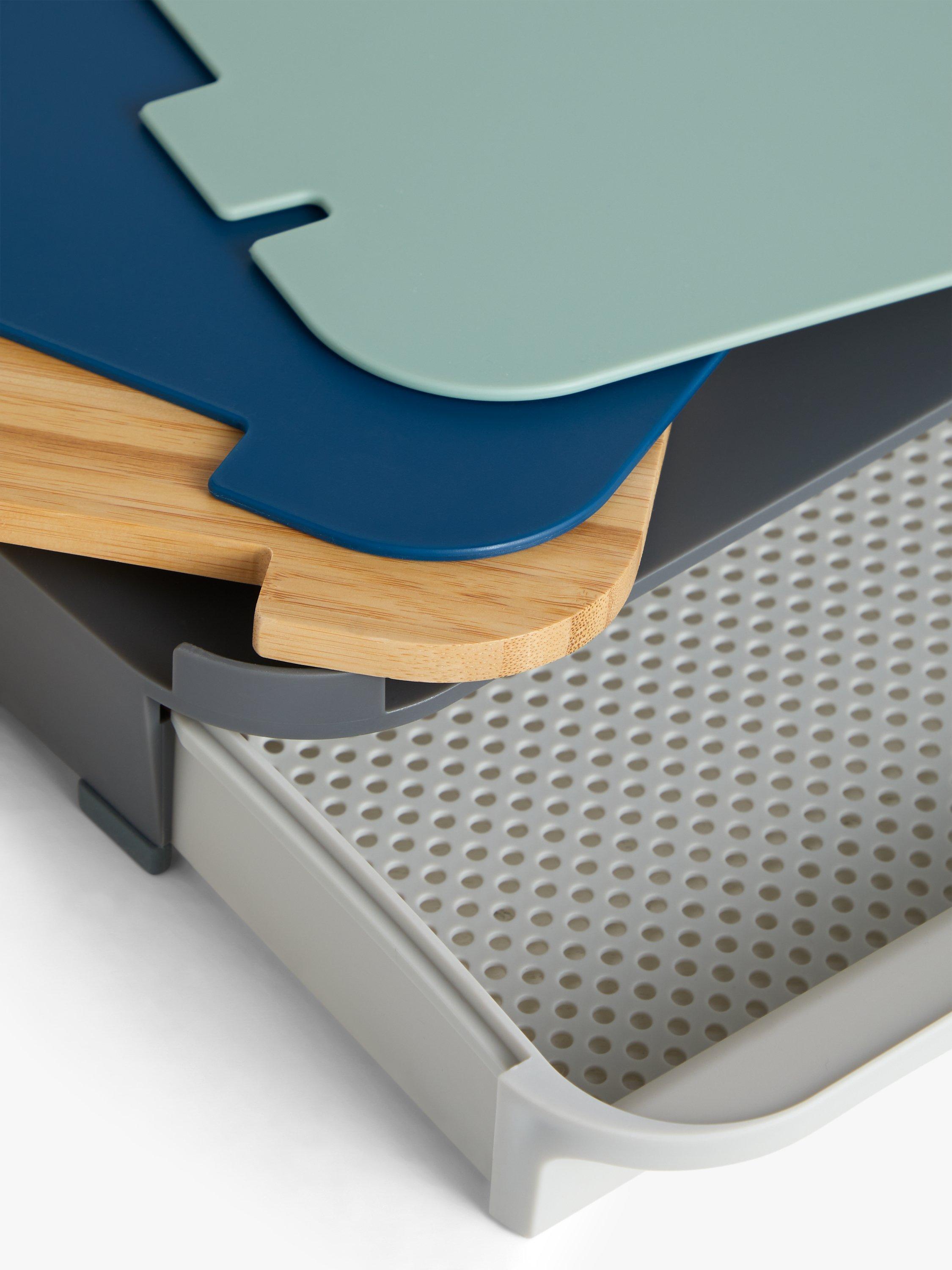The set includes a bamboo chopping board as well as two flexible plastic chopping boards for keeping different food types separate. There's a solid drawer for removing food waste after chopping and a colander-style drawer for draining water from food, straight into the sink.