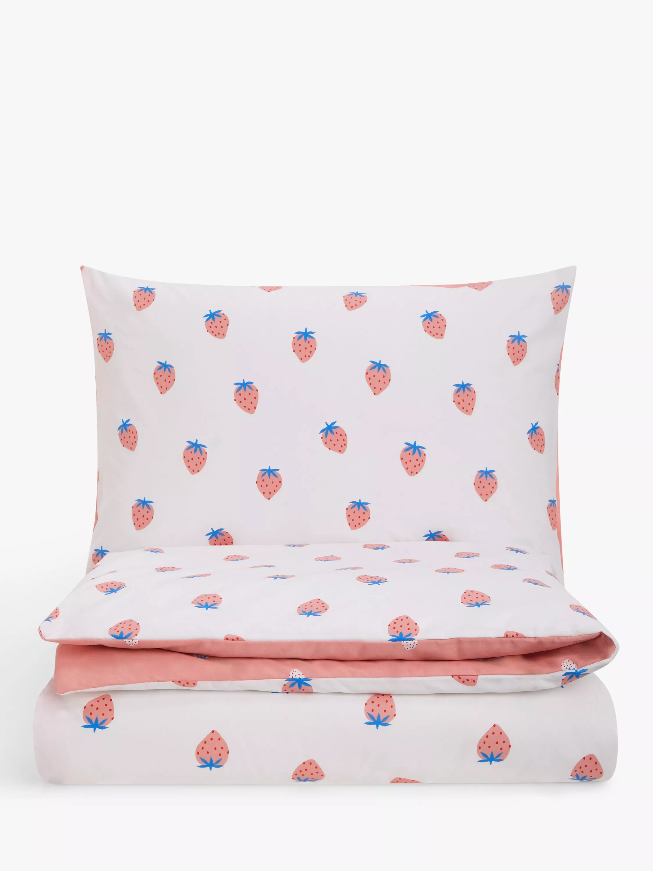 John Lewis ANYDAYEasy Care Strawberry Print Reversible Duvet Cover and Pillowcase Set, Mid Pink, Double set