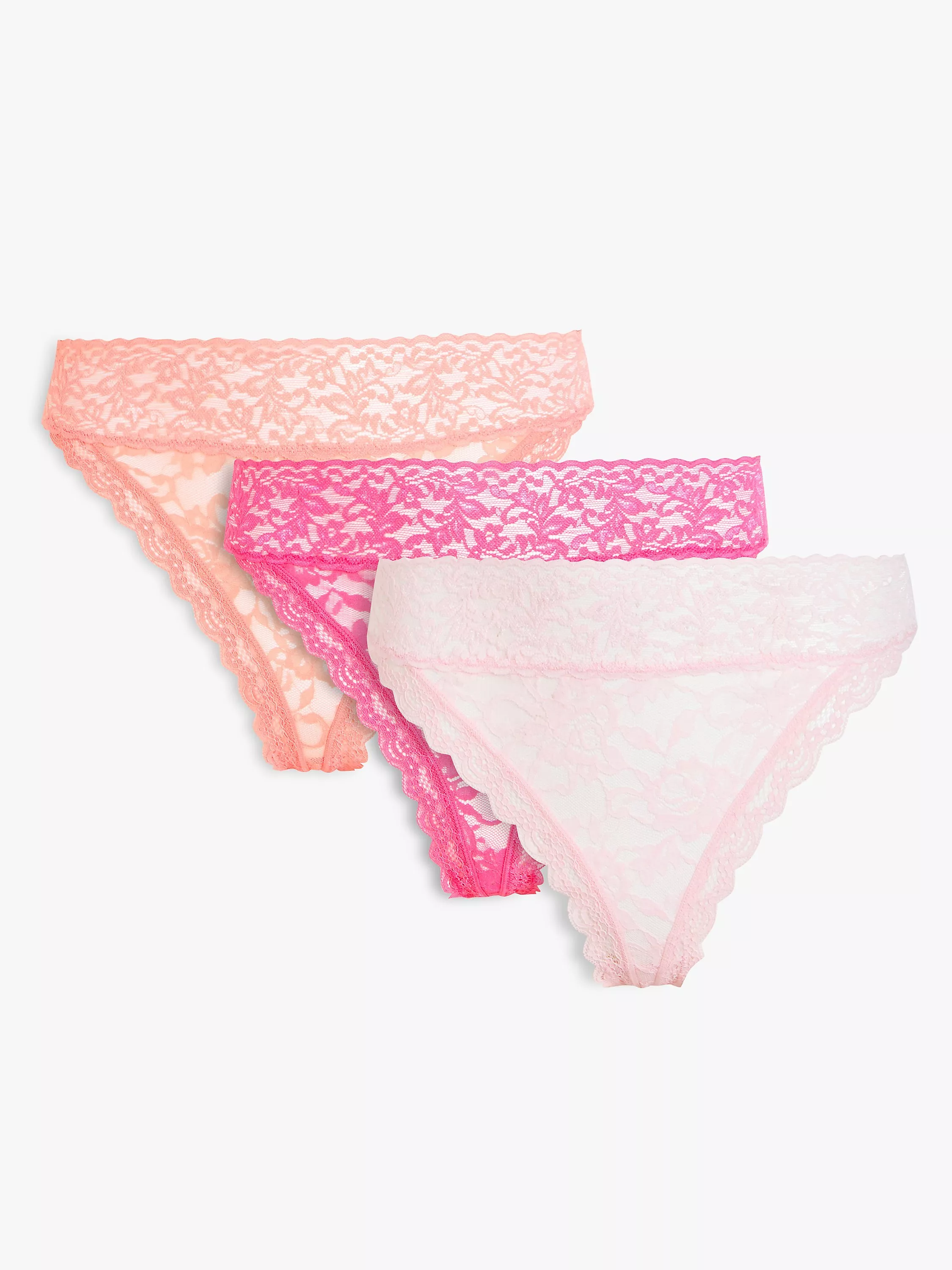 John LewisANYDAY Helenca Lace Brazilian Knickers, Pack of 3, Coral/Blush/Lambe, 16
