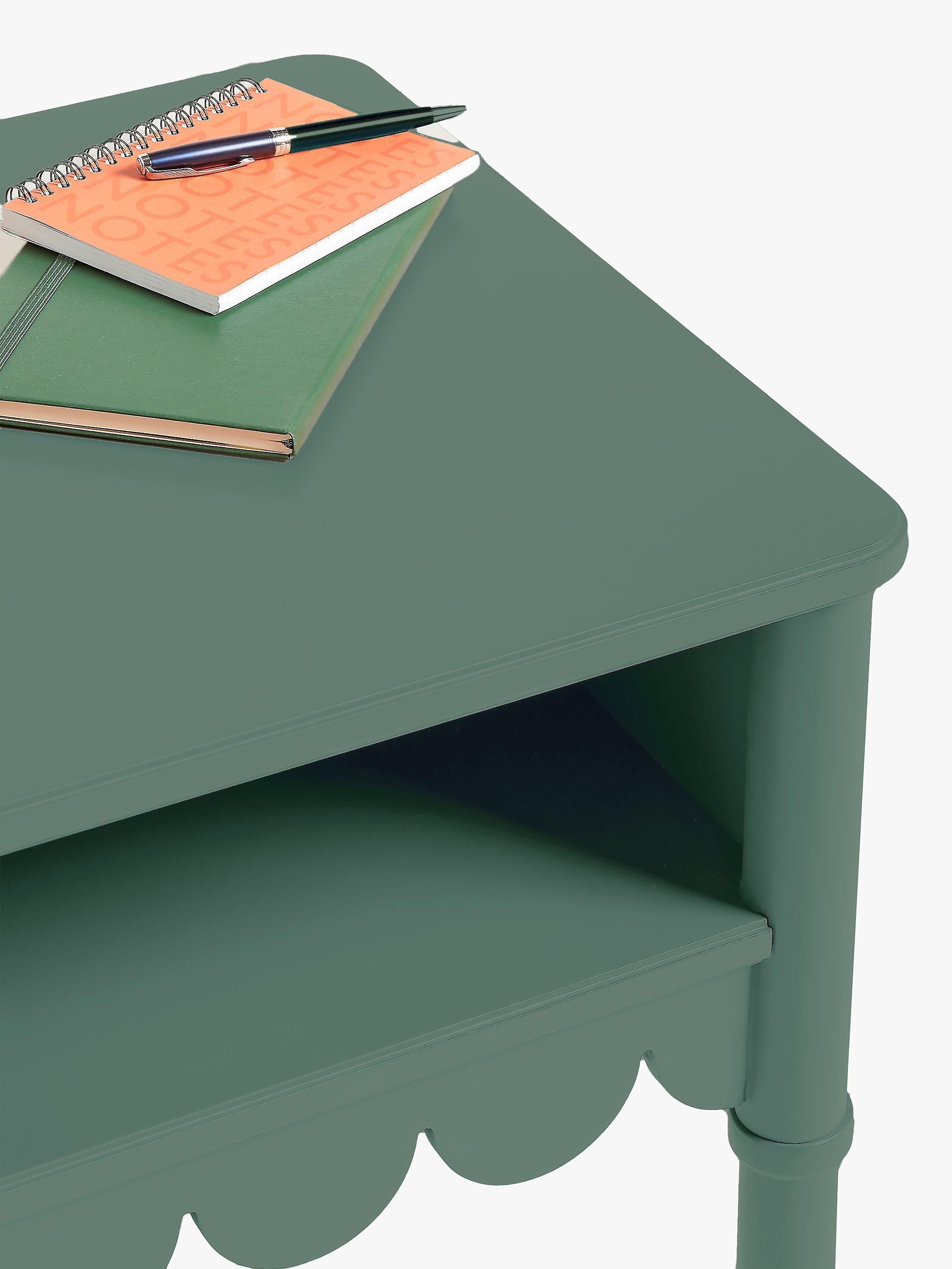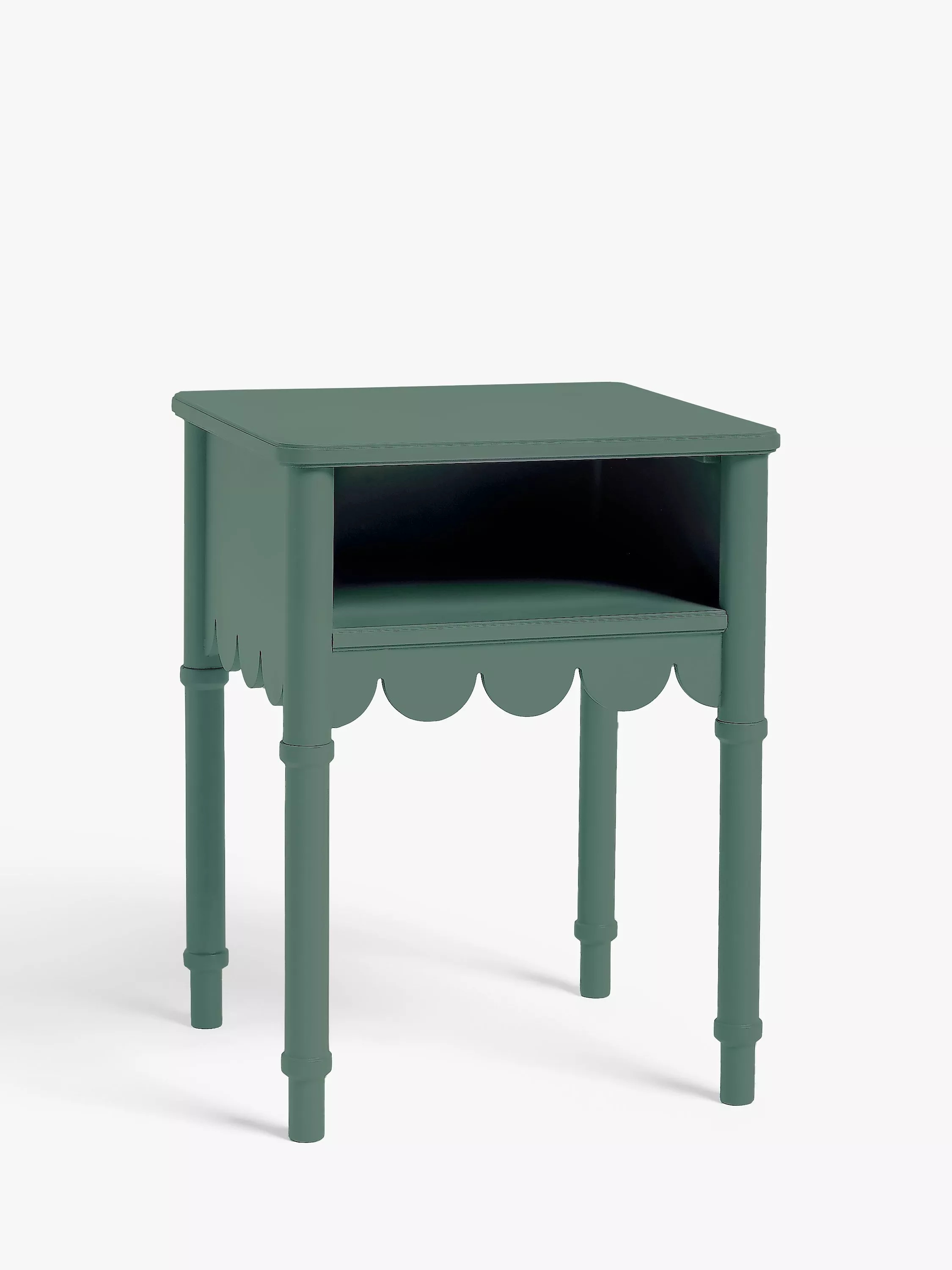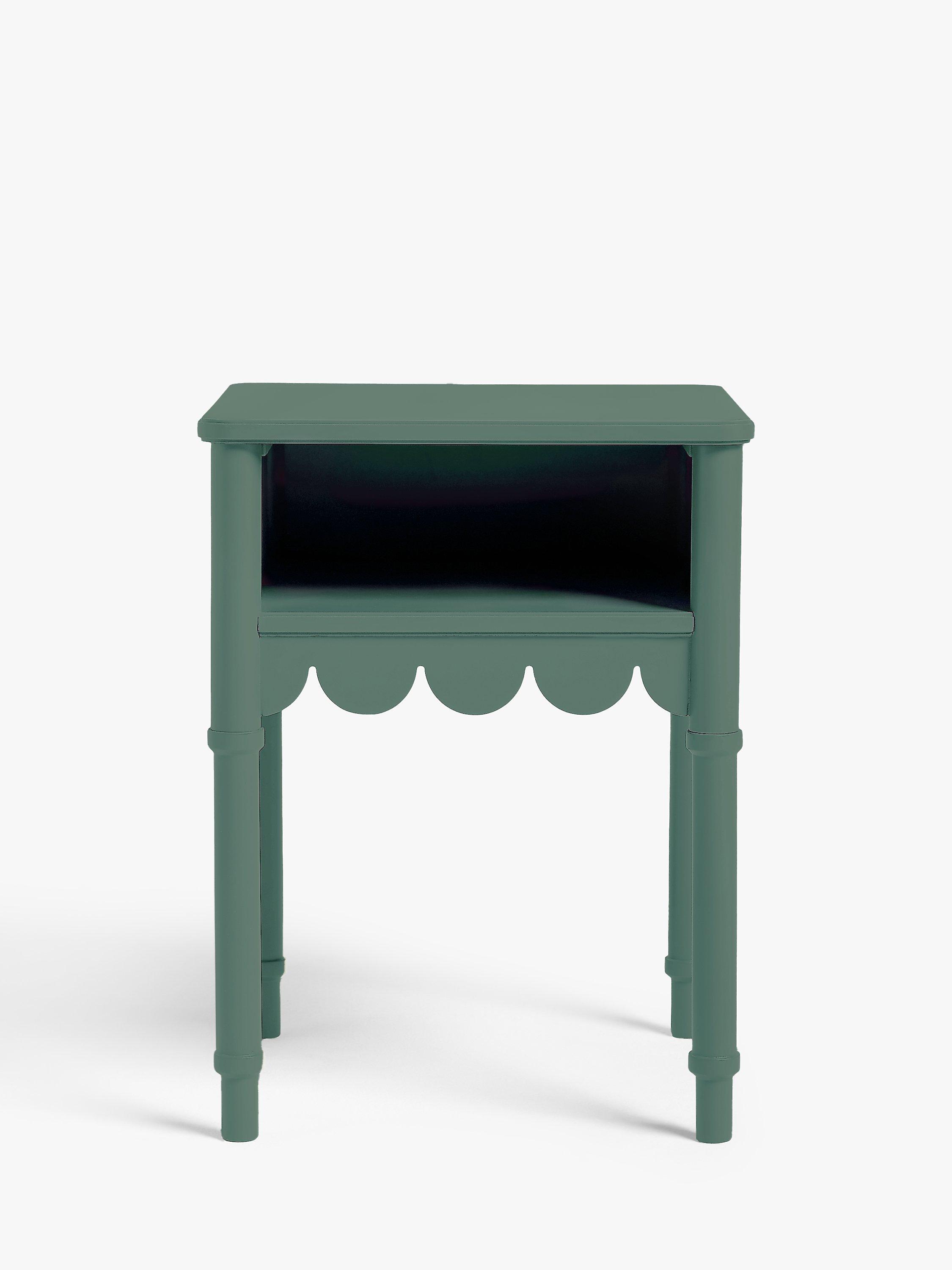 An injection of decorative design and a splash of colour are two ways to transform your bedroom. This bedside table combines both, with its sweet, scalloped edge design detail and bold painted finish. Compact, playful and of course practical, there's an open shelf-section for your bedside essentials.