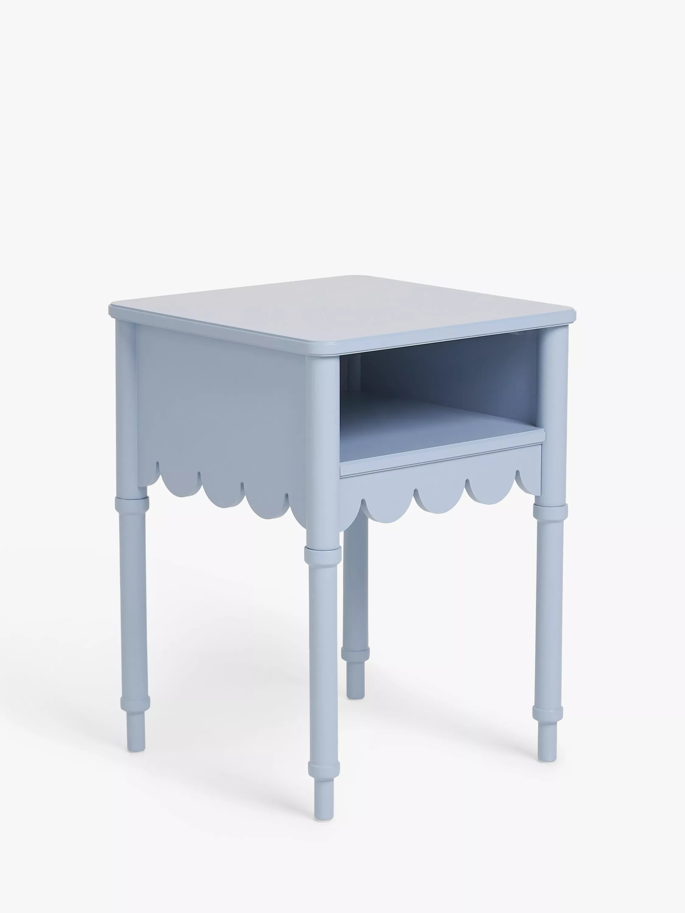 An injection of decorative design and a splash of colour are two ways to transform your bedroom. This bedside table combines both, with its sweet, scalloped edge design detail and bold painted finish. Compact, playful and of course practical, there's an open shelf-section for your bedside essentials.