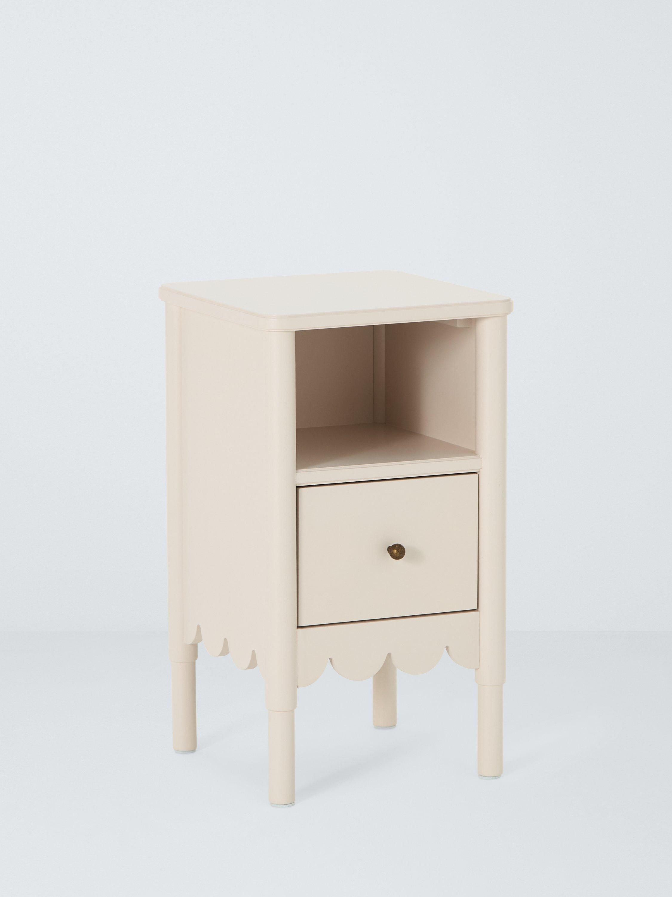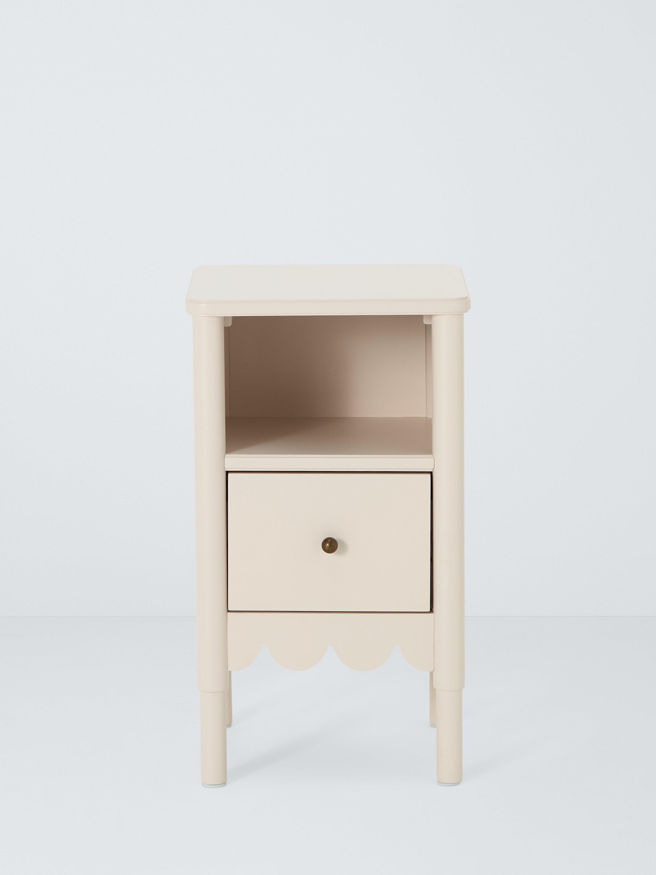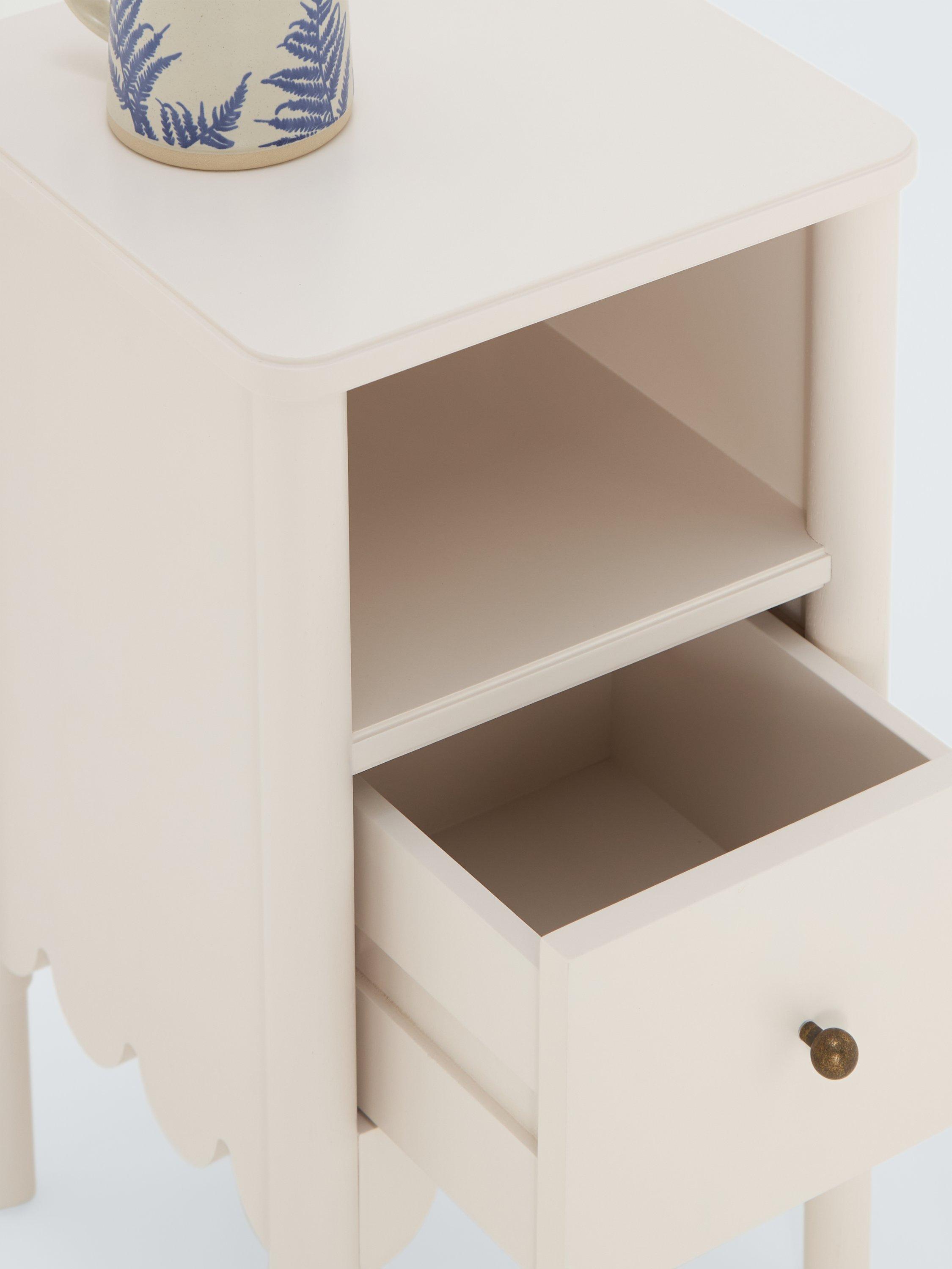 Decorative design and an injection of colour will instantly transform your space, so we've designed this bedside table to do just that. Its narrow profile and compact size means it's ideal for smaller spaces and it features a scalloped edge design detail beneath the open shelf and draw section.