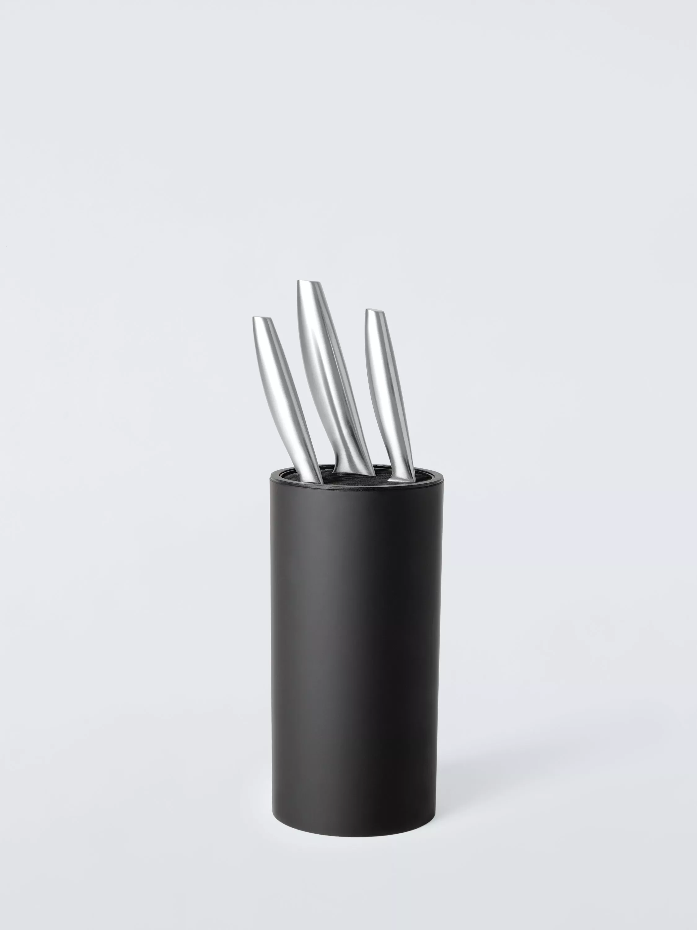 A basic knife set for all your food prep needs. A soft-touch coating on the ergonomic handles ensures a comfortable grip and use, and matches the knife storage block, which includes three kitchen knife essentials. The stainless steel knife blades are strong and durable, and the knives are easy to keep clean.