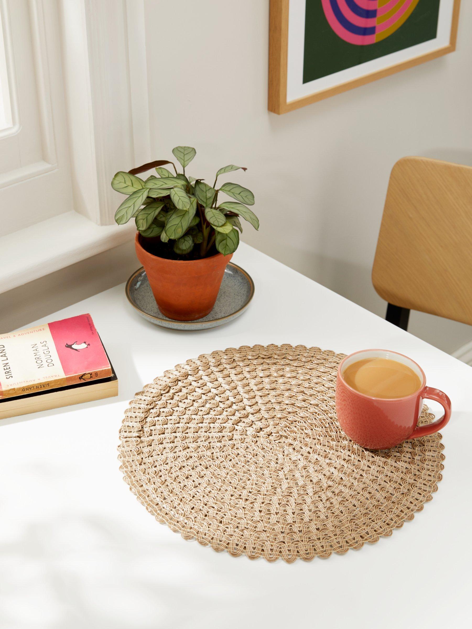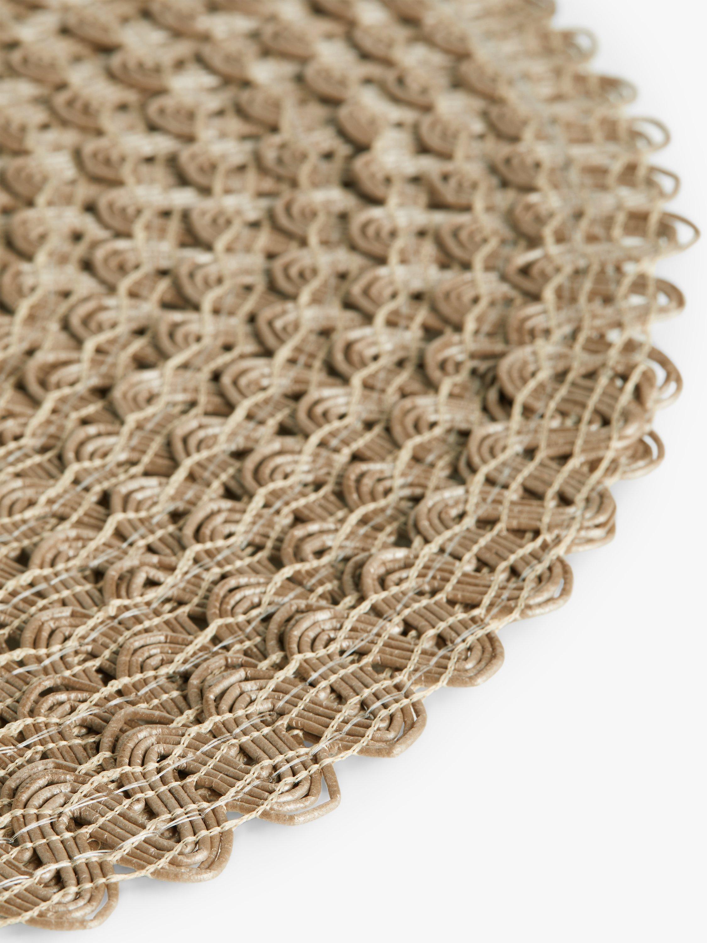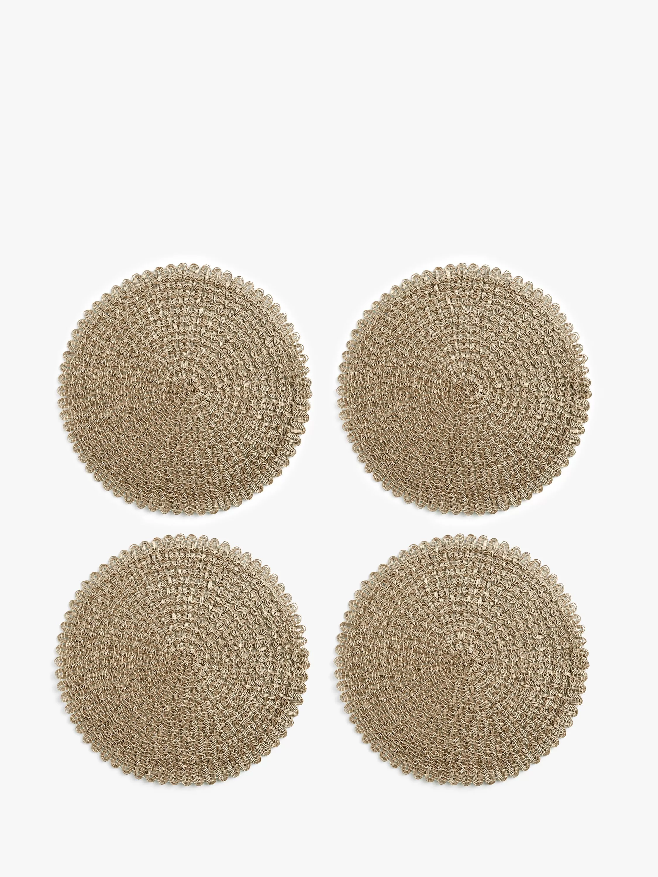 Four round placements made with intricately layered braiding and scalloped edges. Made of wipe-clean polypropylene, this textured, durable design protects table surfaces.