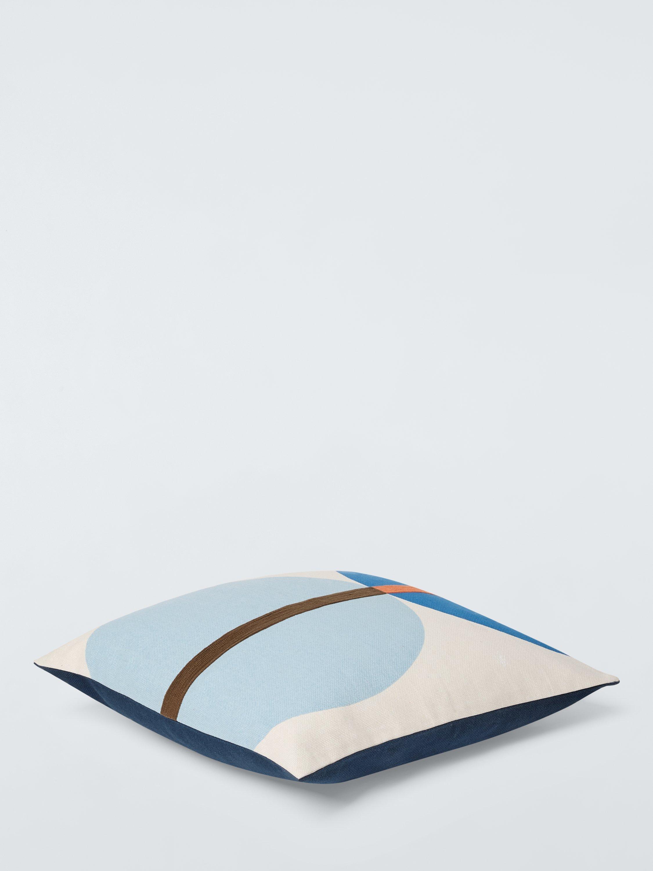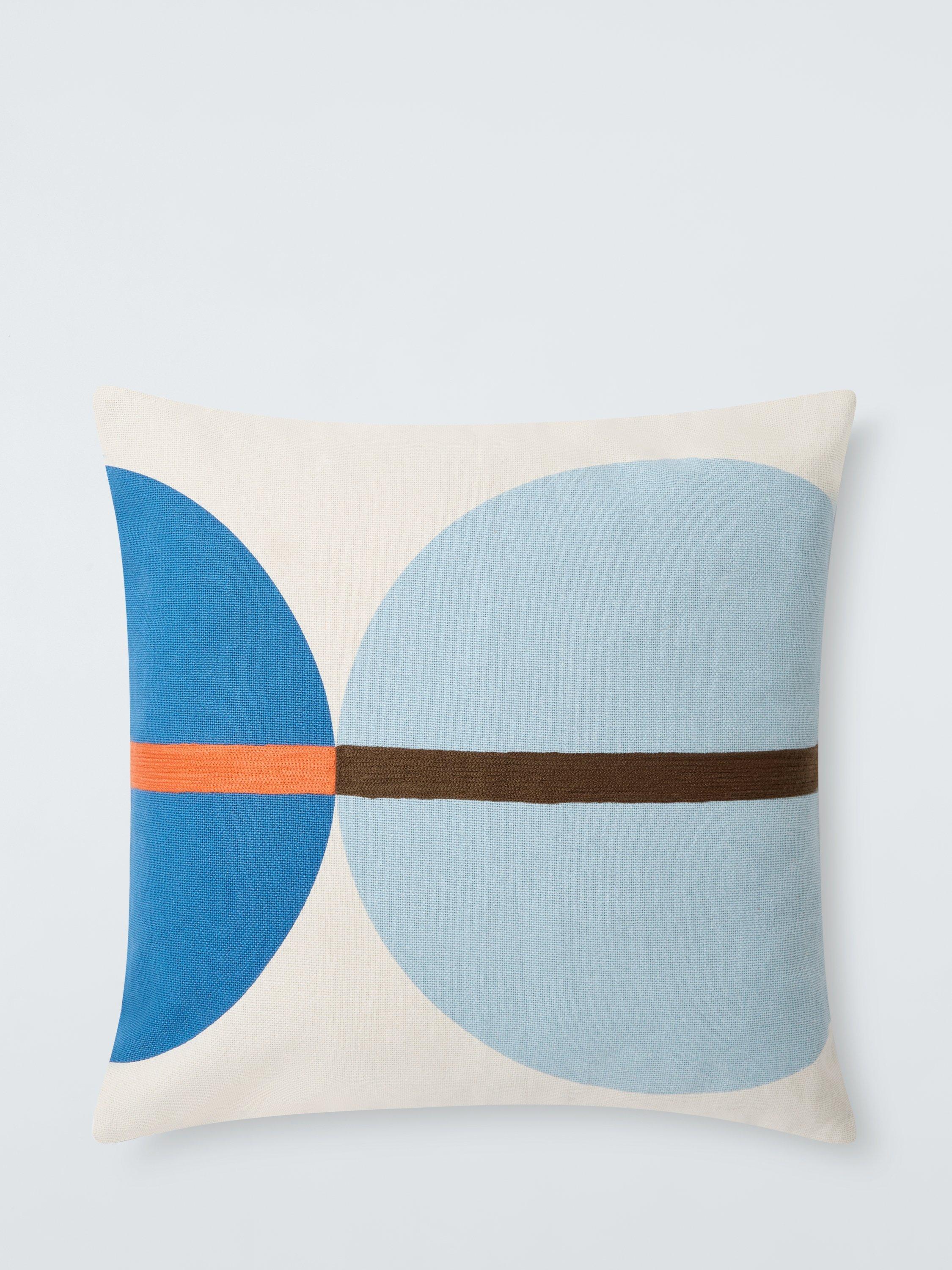 This retro-style cushion features two planet-like orbs enhanced with chain stitching.
