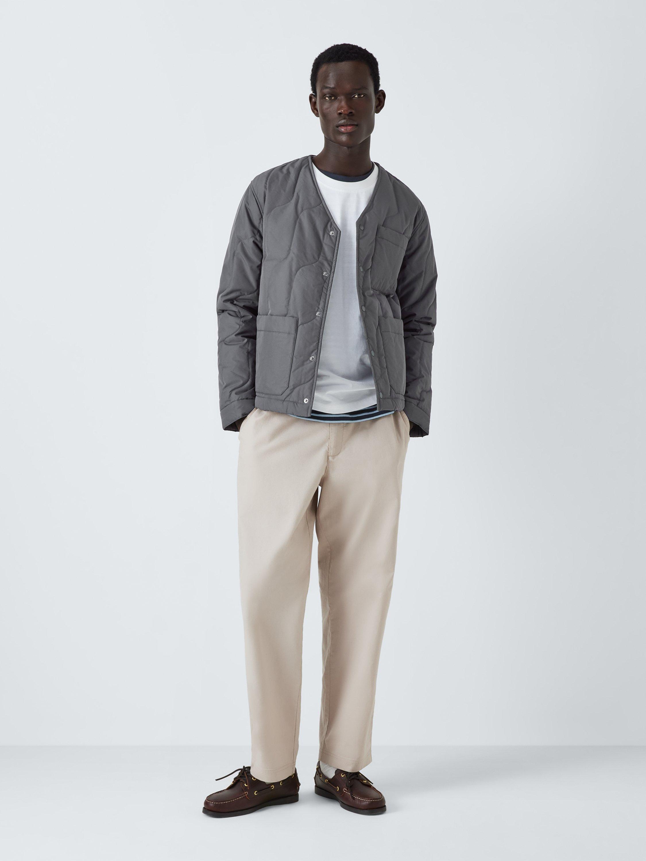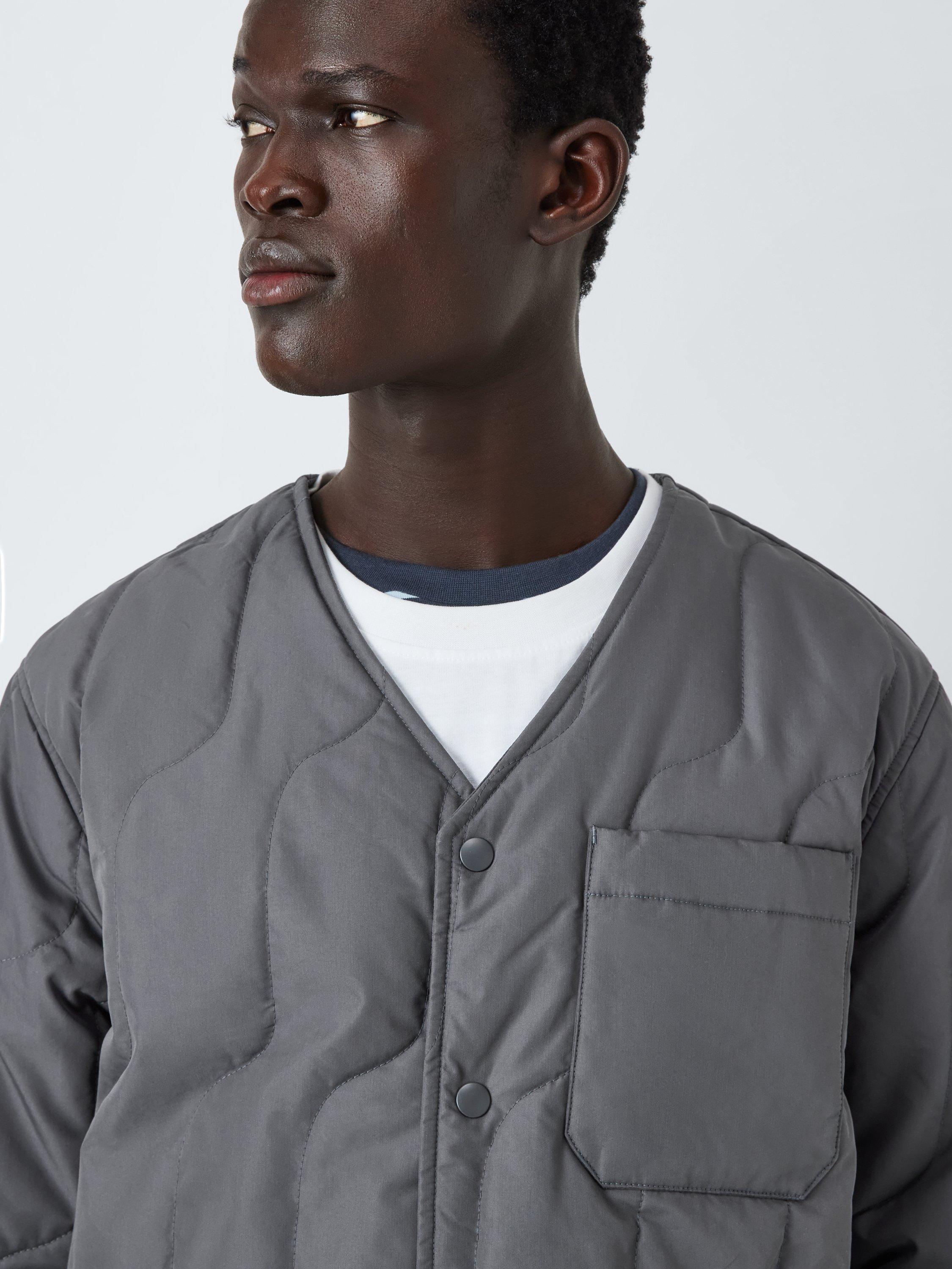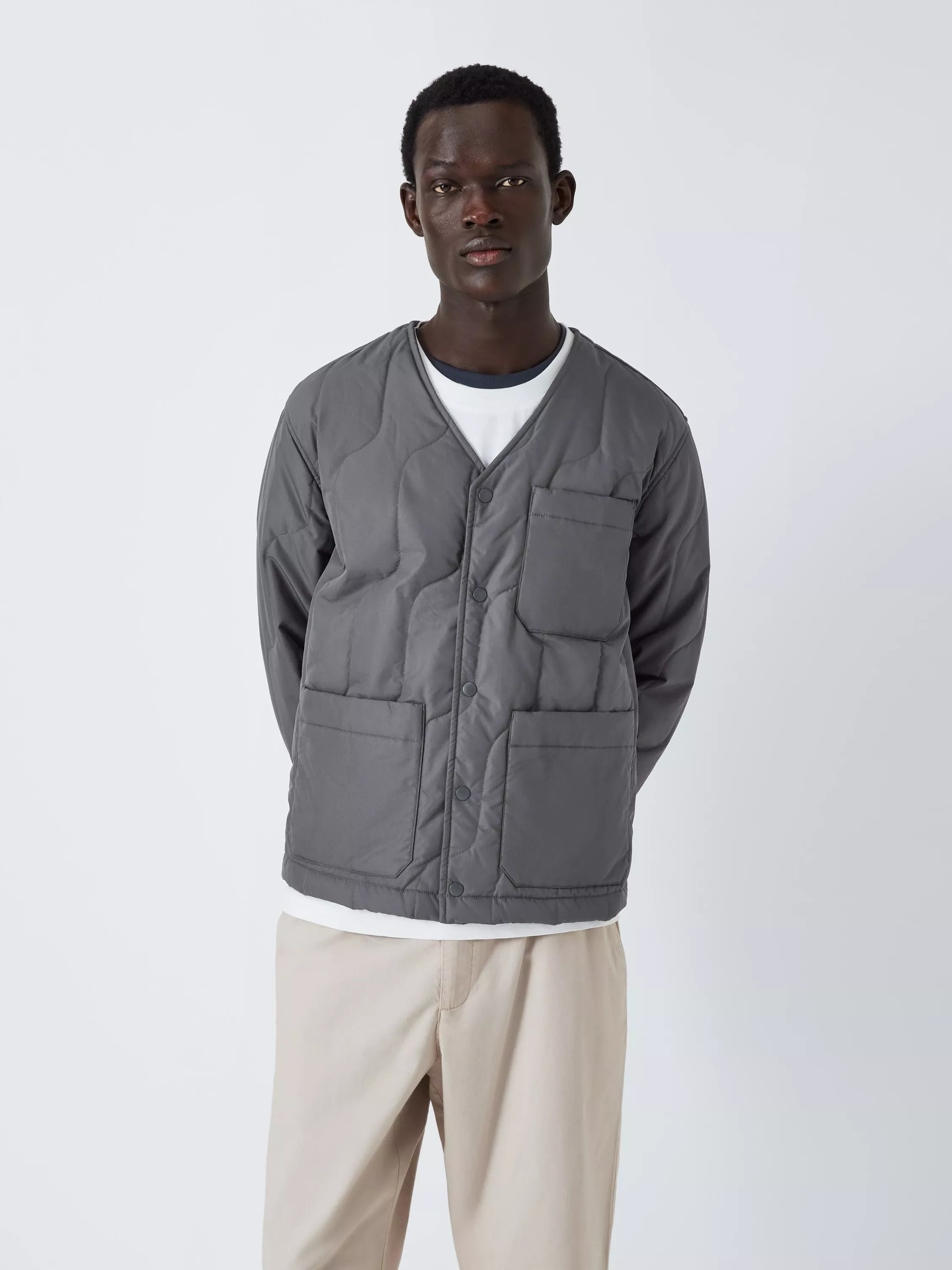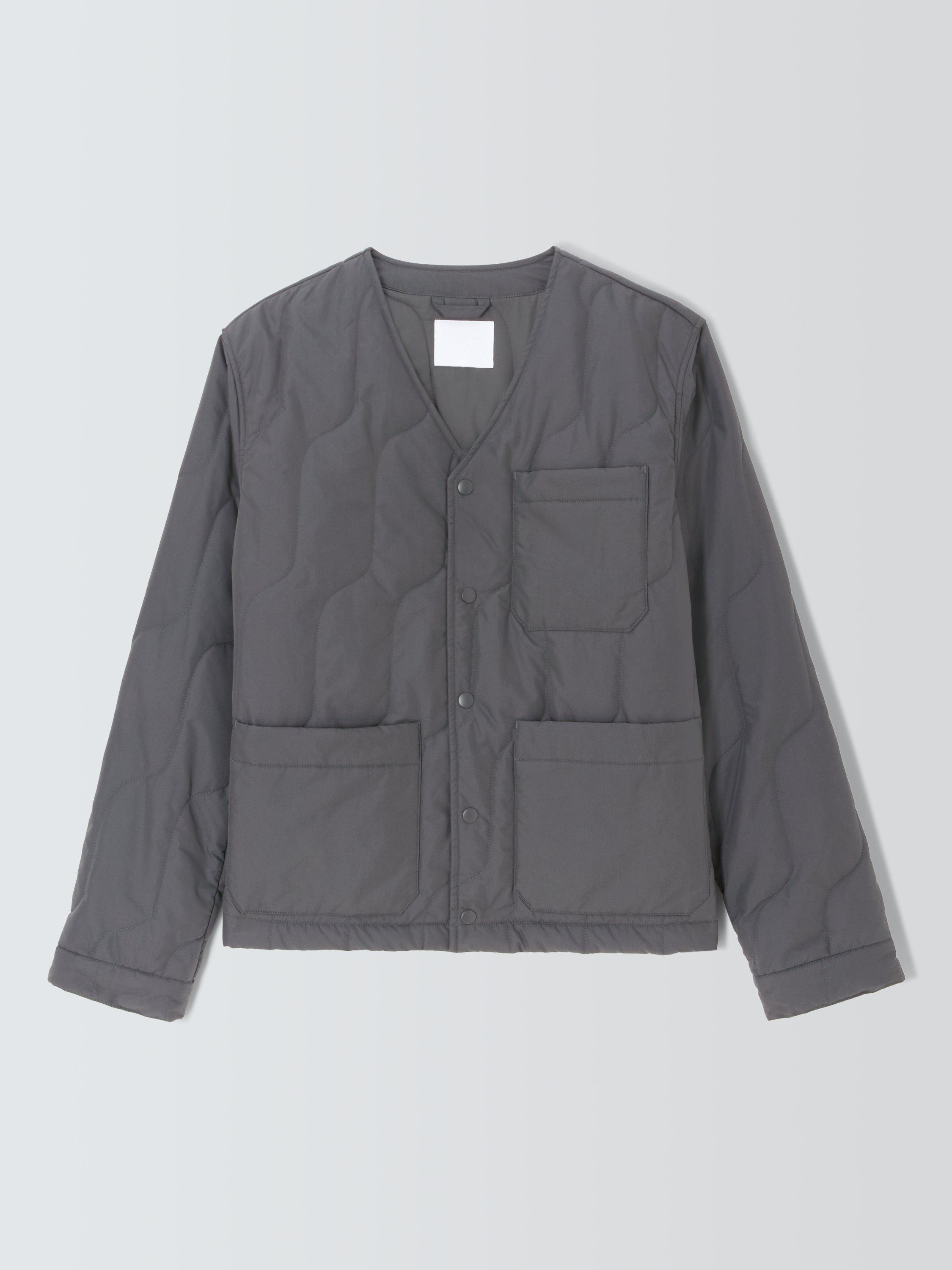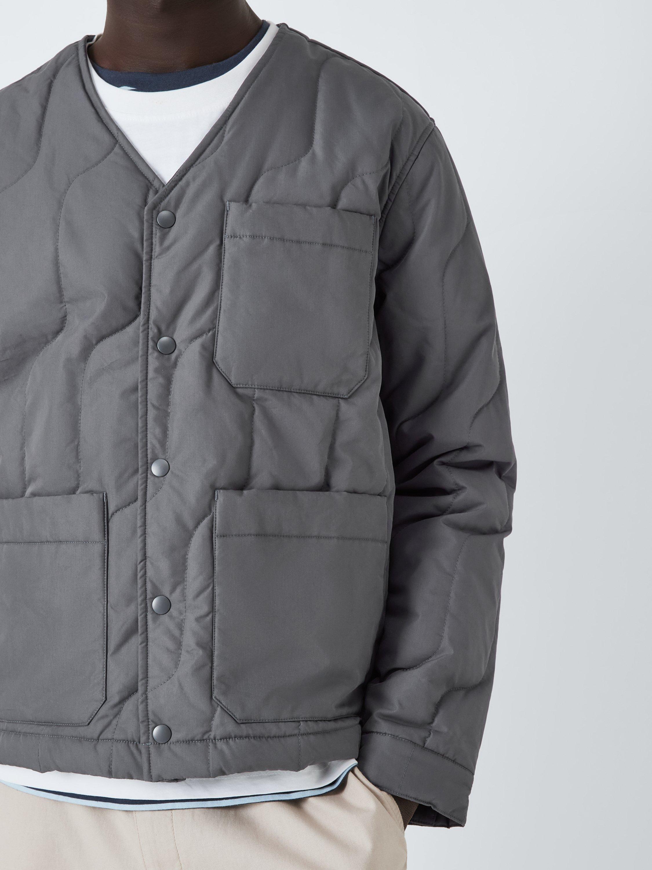 Wavy quilting adds lightweight warmth to this jacket, designed with two front utility-style patch pockets and one on the left chest. The Durable Water Repellent (DWR) coating ensures water resistance in light rainfall. Pick a favourite scarf to wear over the V-neckline on colder days and fasten with the popper buttons on the front.