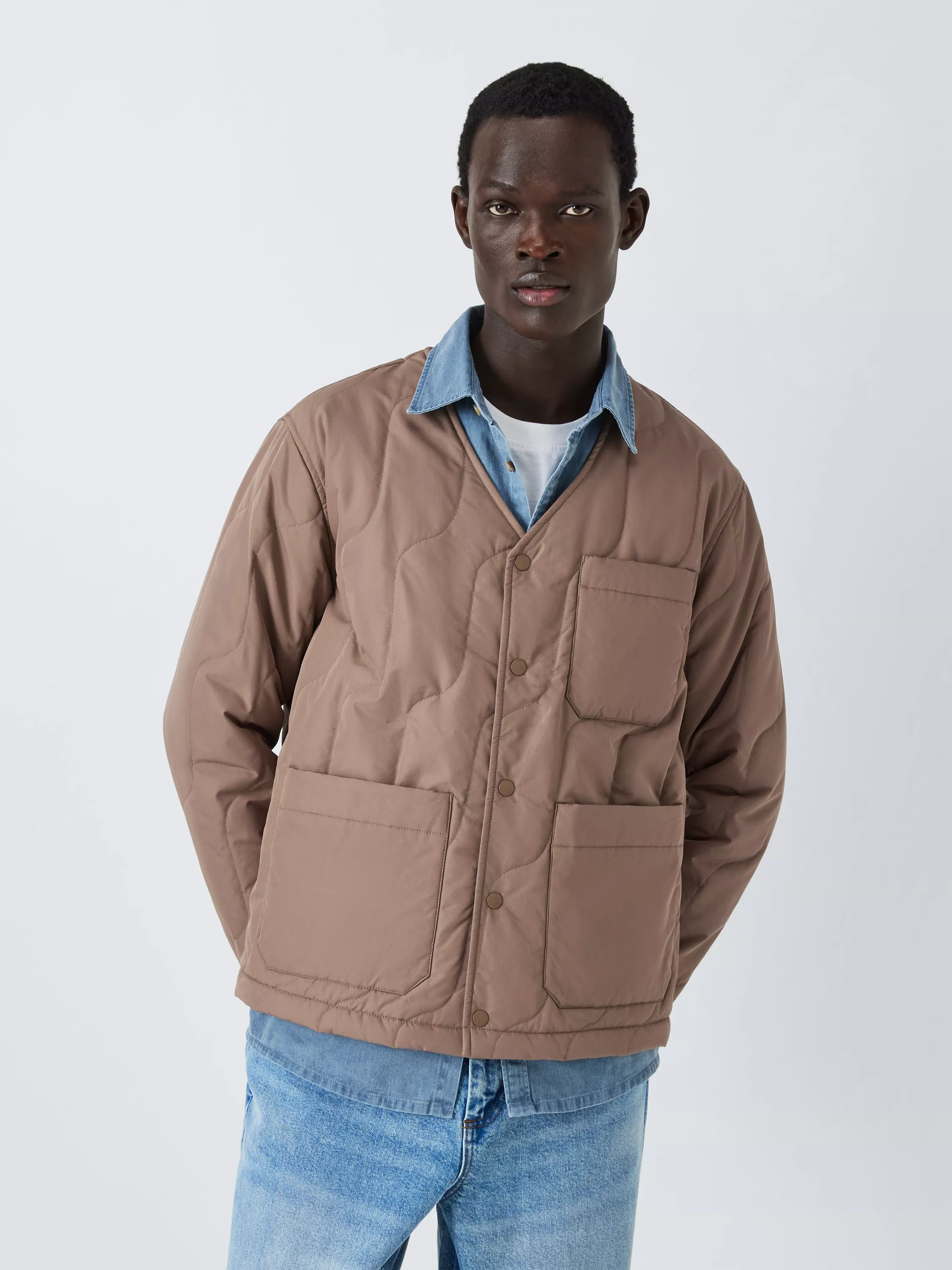 Wavy quilting adds lightweight warmth to this jacket, designed with two front utility-style patch pockets and one on the left chest. The Durable Water Repellent (DWR) coating ensures water resistance in light rainfall. Pick a favourite scarf to wear over the V-neckline on colder days and fasten with the popper buttons on the front.