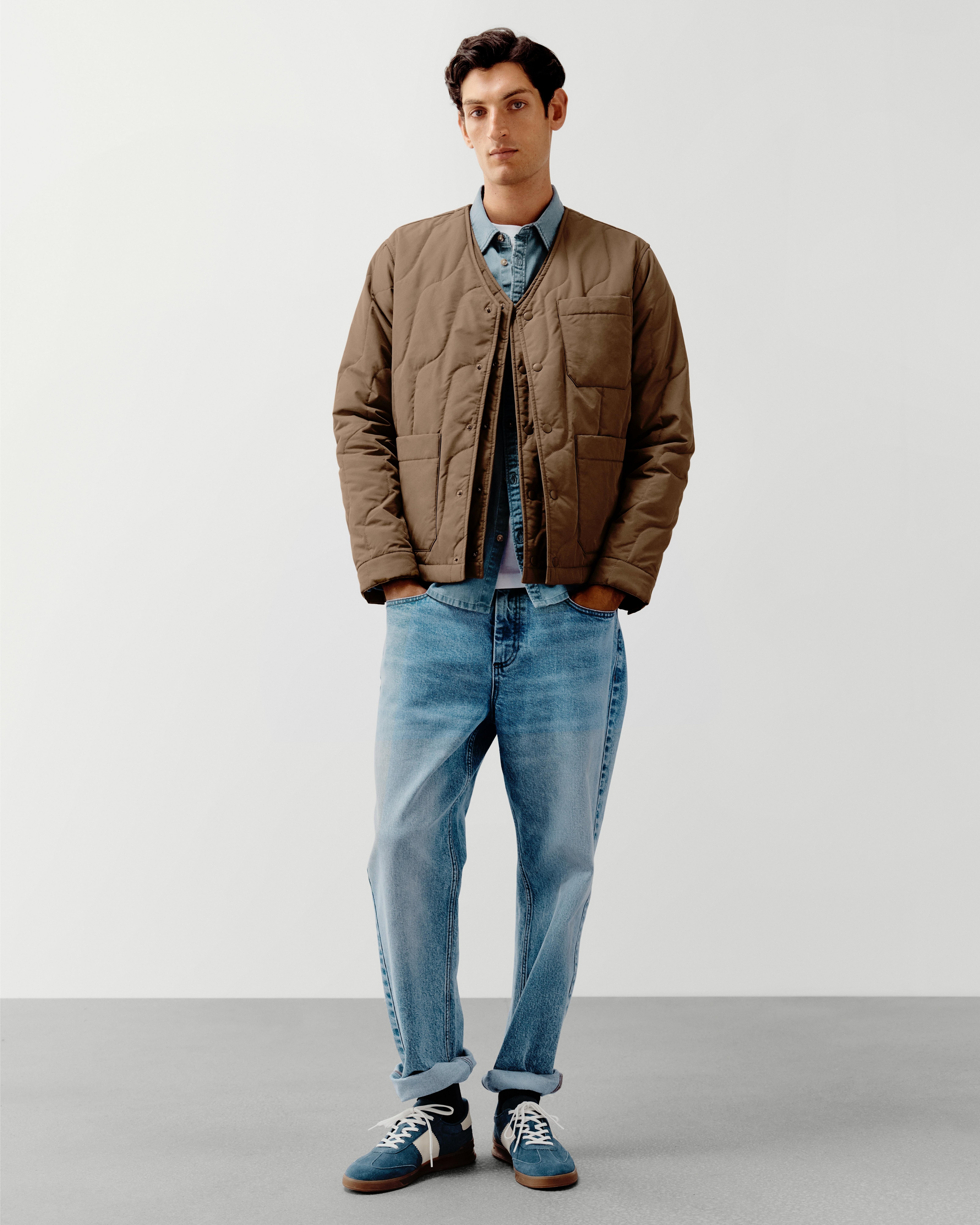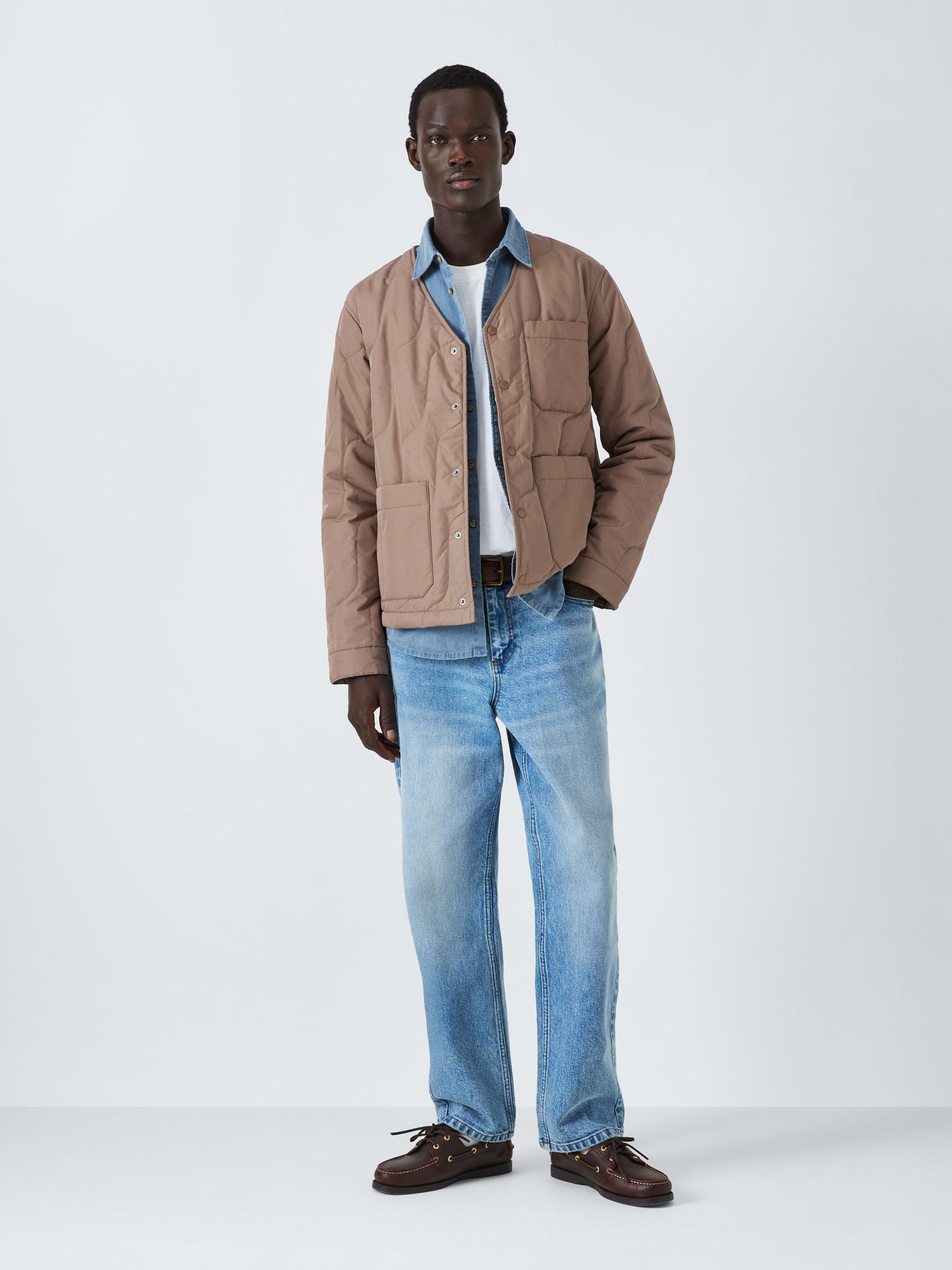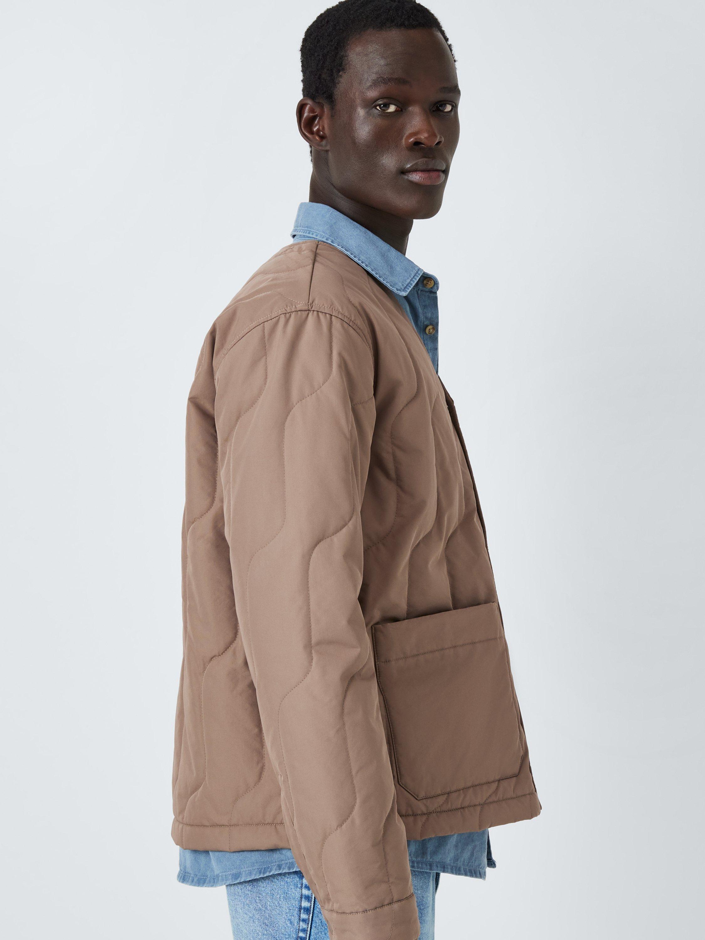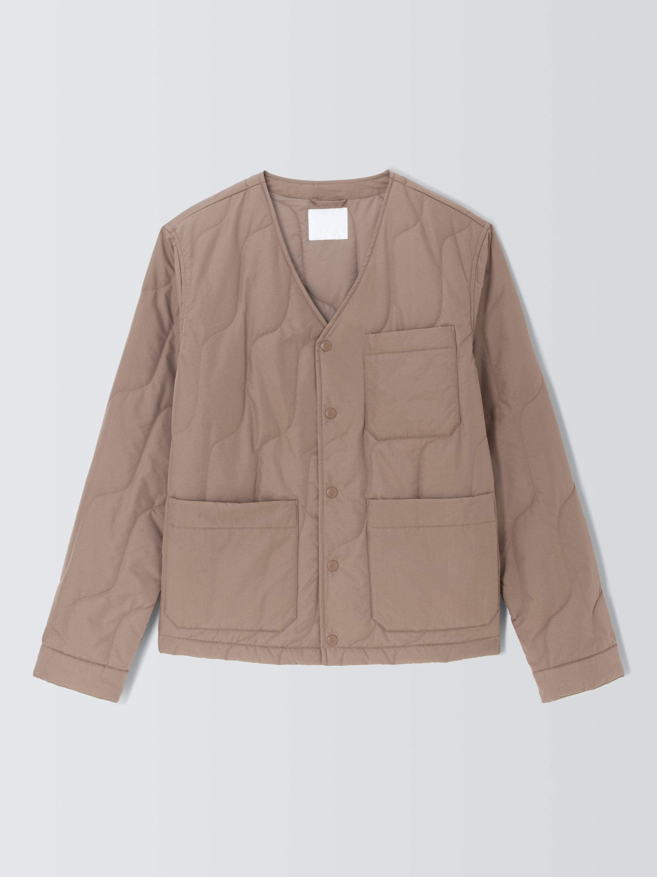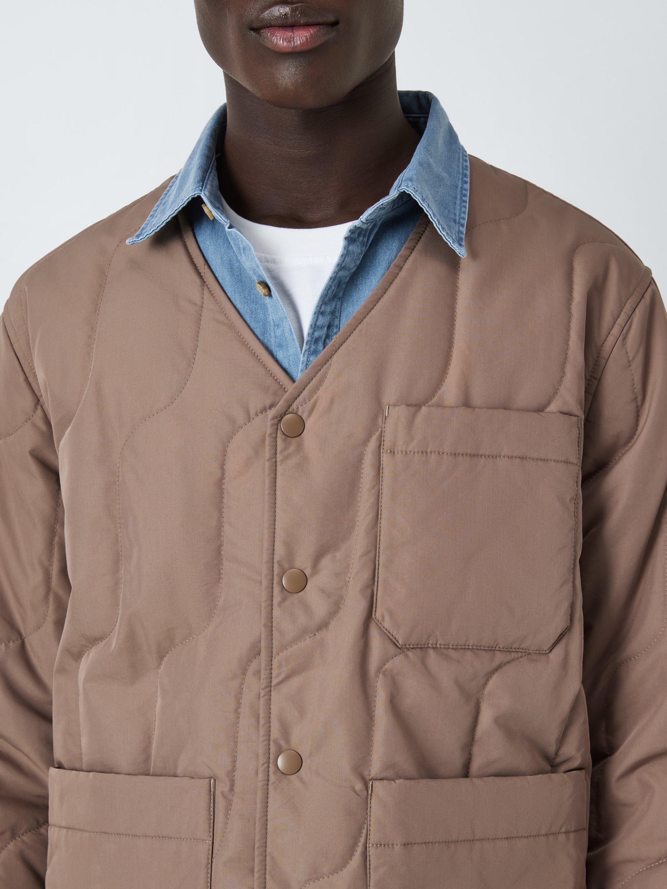 Wavy quilting adds lightweight warmth to this jacket, designed with two front utility-style patch pockets and one on the left chest. The Durable Water Repellent (DWR) coating ensures water resistance in light rainfall. Pick a favourite scarf to wear over the V-neckline on colder days and fasten with the popper buttons on the front.