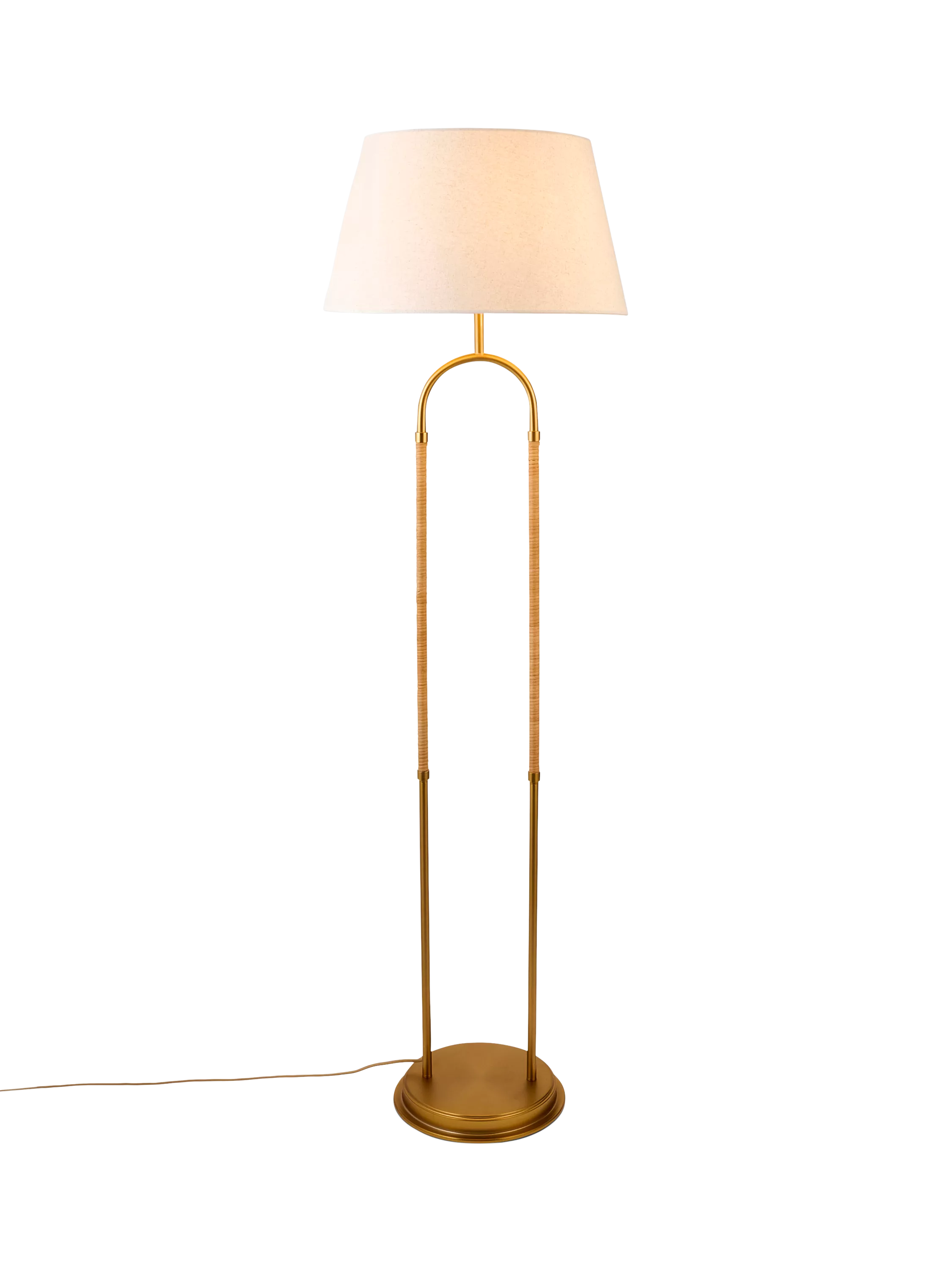 Modern design meets traditional materials with this floor lamp, featuring a cane-wrapped base with brass accents. Complemented with a large oatmeal shade, it will cast warm, even light for a more cosy and inviting space. Use the foot switch to operate.