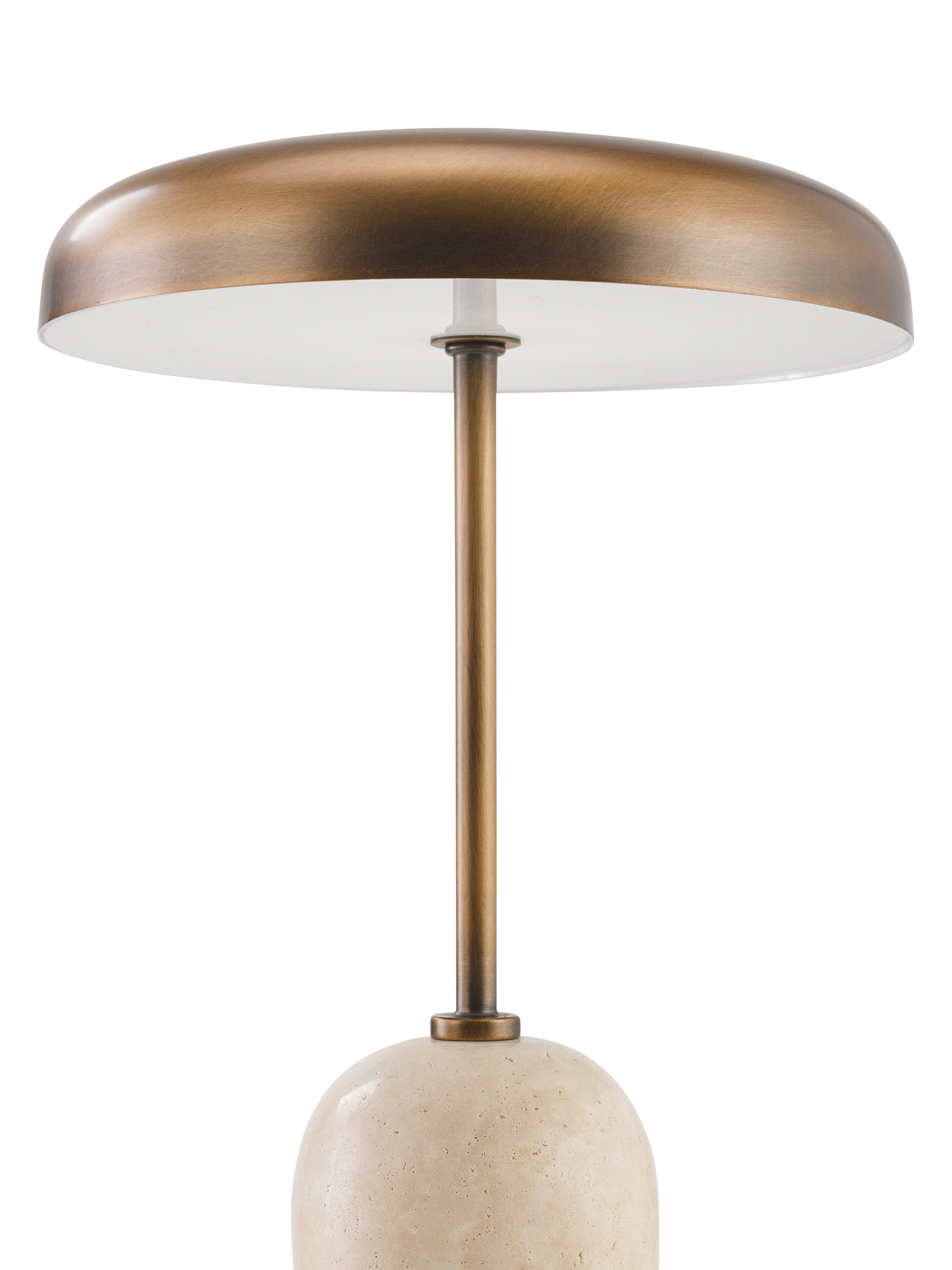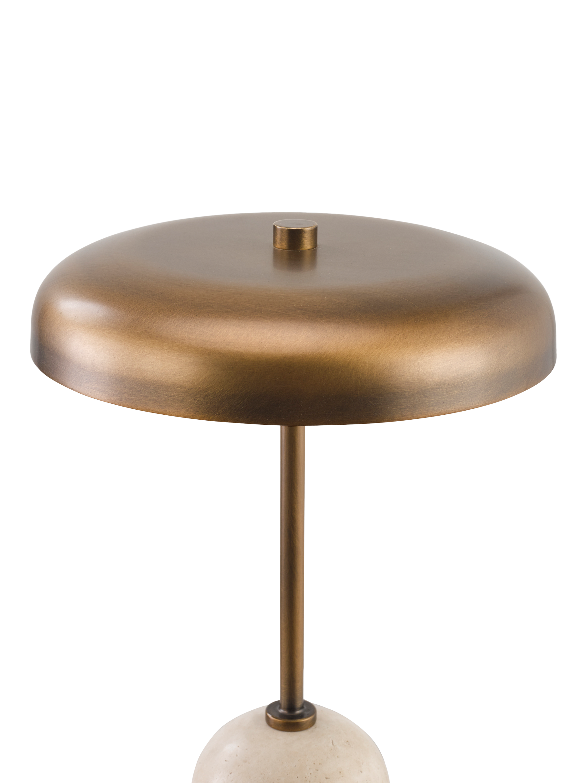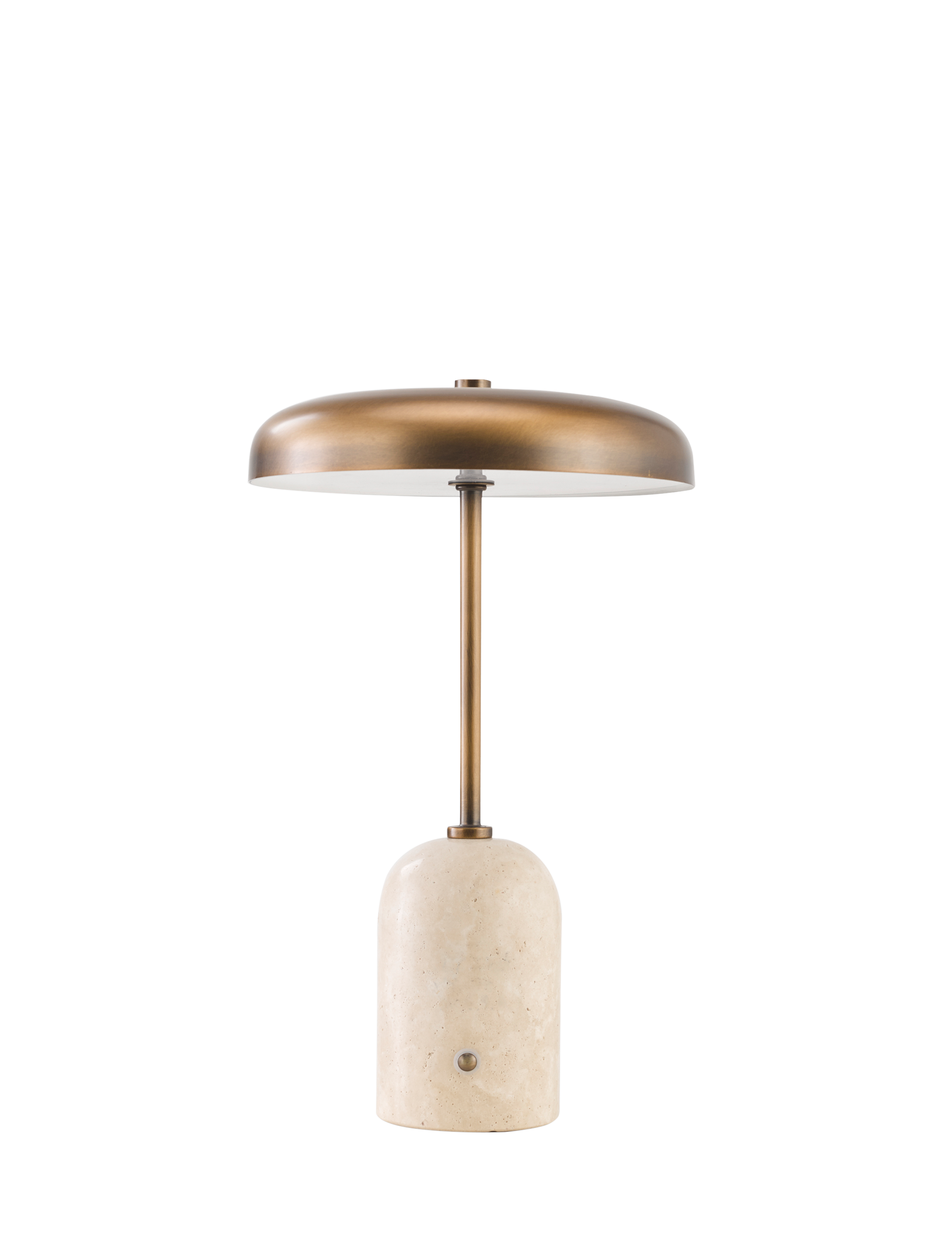 This modern luxe table lamp features a marble base and an antique brass finish metal dome shade, which creates a down light, ideal for creating ambience and drama in your interior. It features a three-stage touch switch and a rechargeable power source that provides absolute flexibility. Place the lamp anywhere around the home without the need for it to be close to a plug socket.