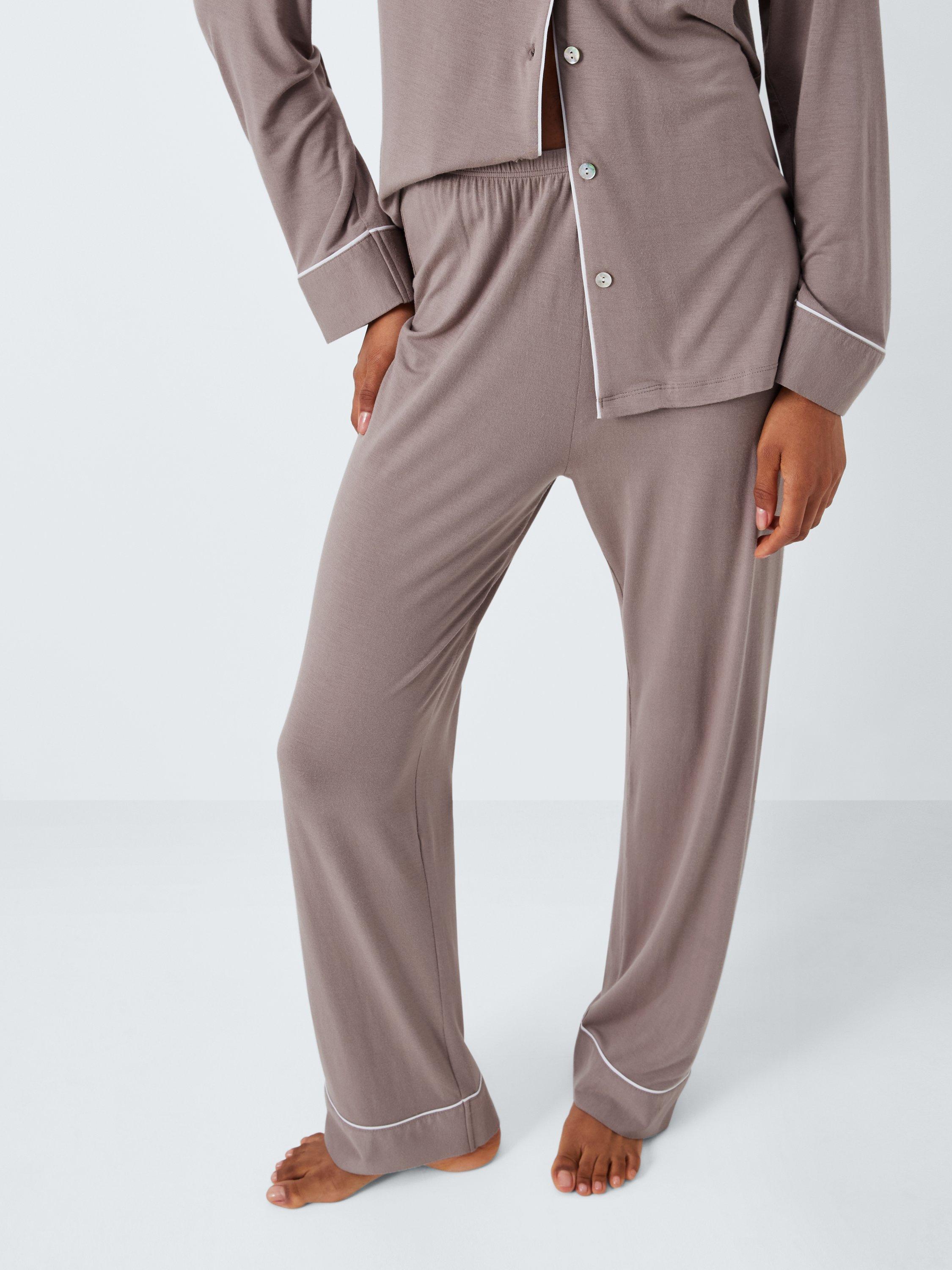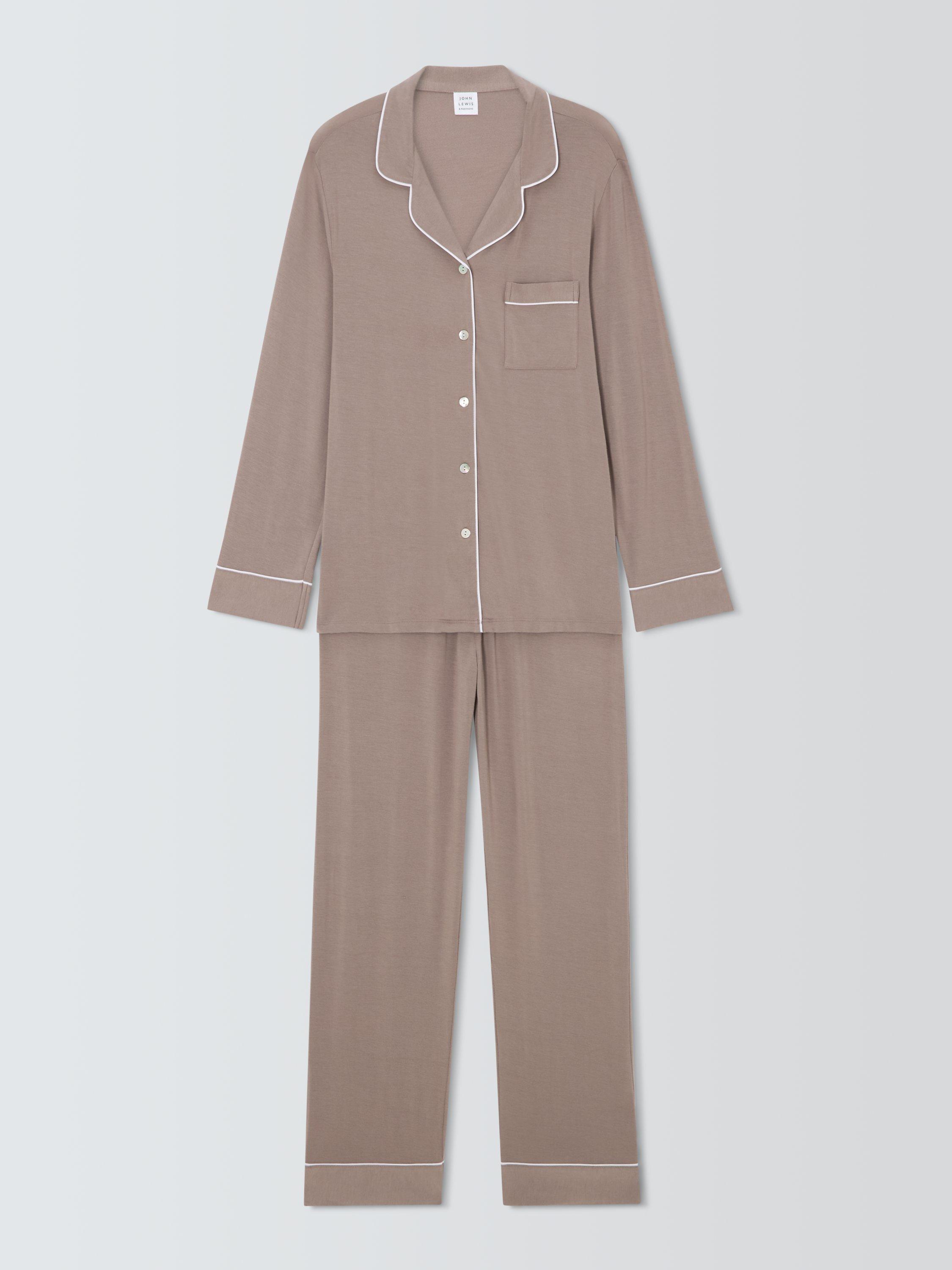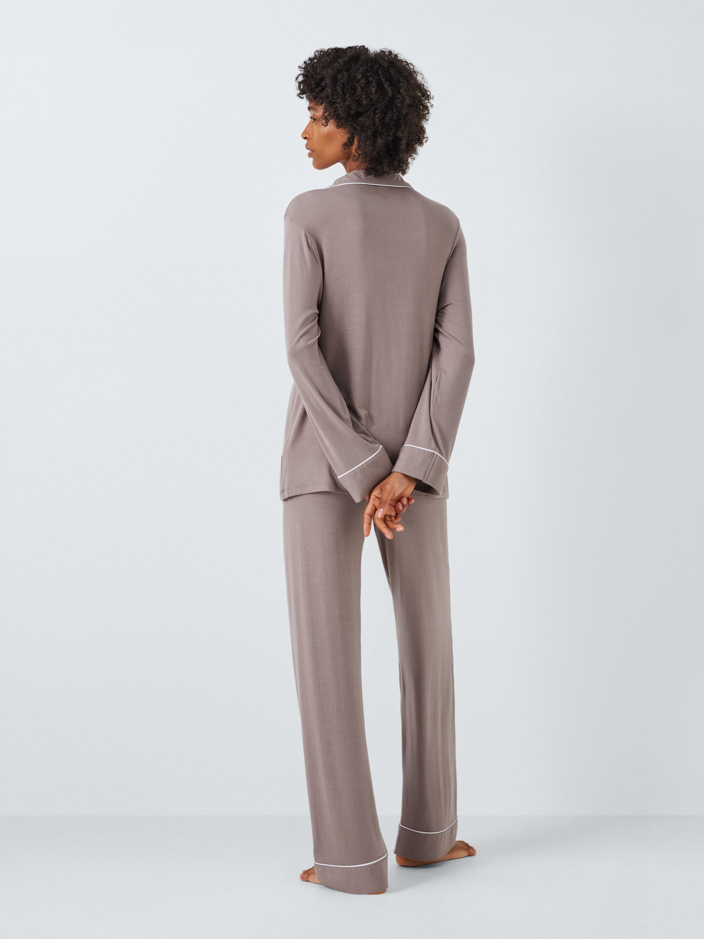 Offering a relaxed fluid fit in soft modal jersey, our Aria pyjamas are a cosy, comfortable option for cooler nights. They feature straight fit bottoms and a classic button through shirt with full length sleeves while the curved collar gives the top a softer, feminine look. This set is finished with smart trims in a striking contrast tone.