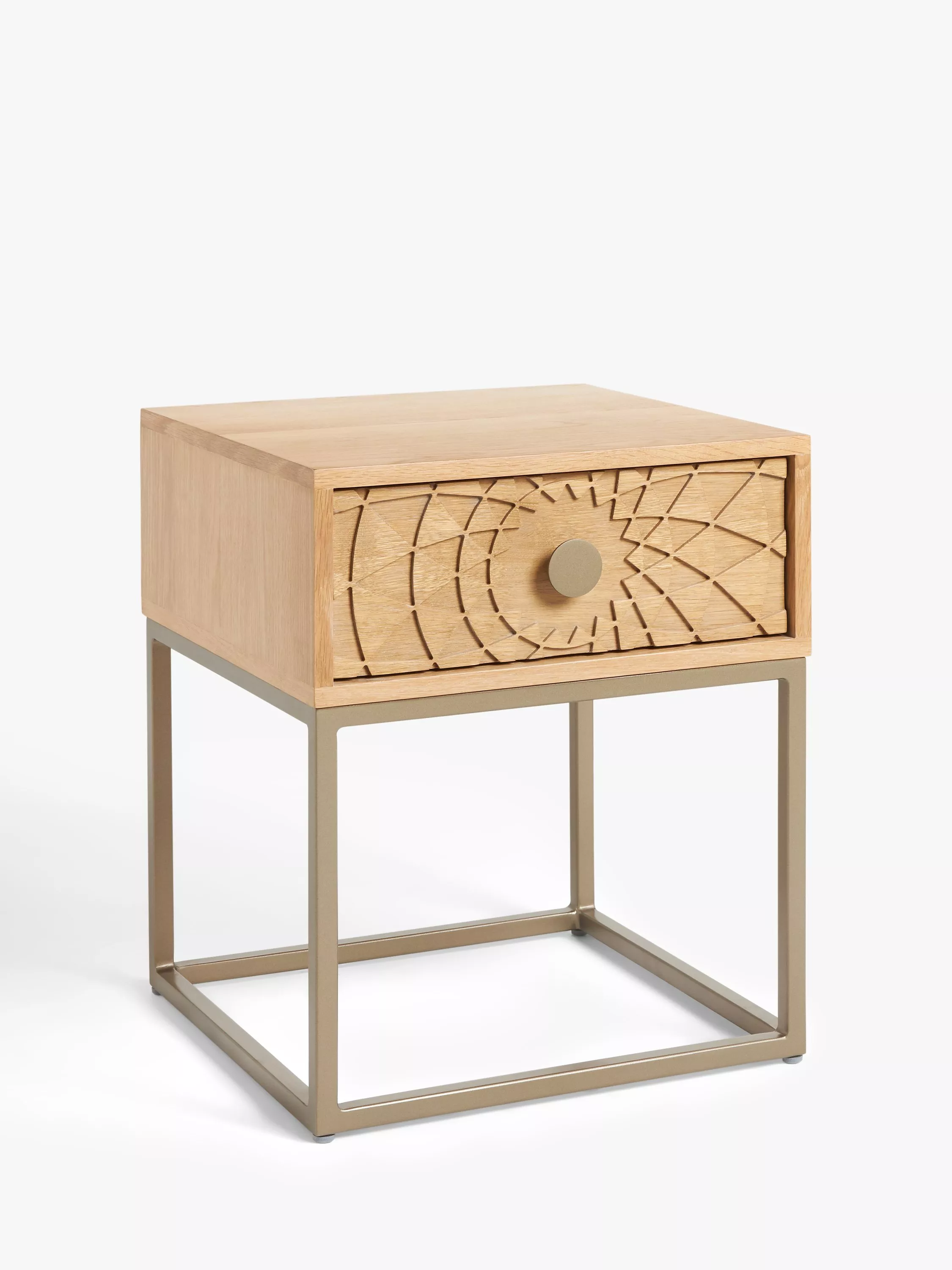 The allure of our Array side table comes from the beautiful mandala pattern, carefully carved into the drawer front. Available in an oak or acacia wood build, with veneers and MDF for additional support, our in-house designers created this functional side table into a bold and beautiful piece that adds useful storage in your living room.
