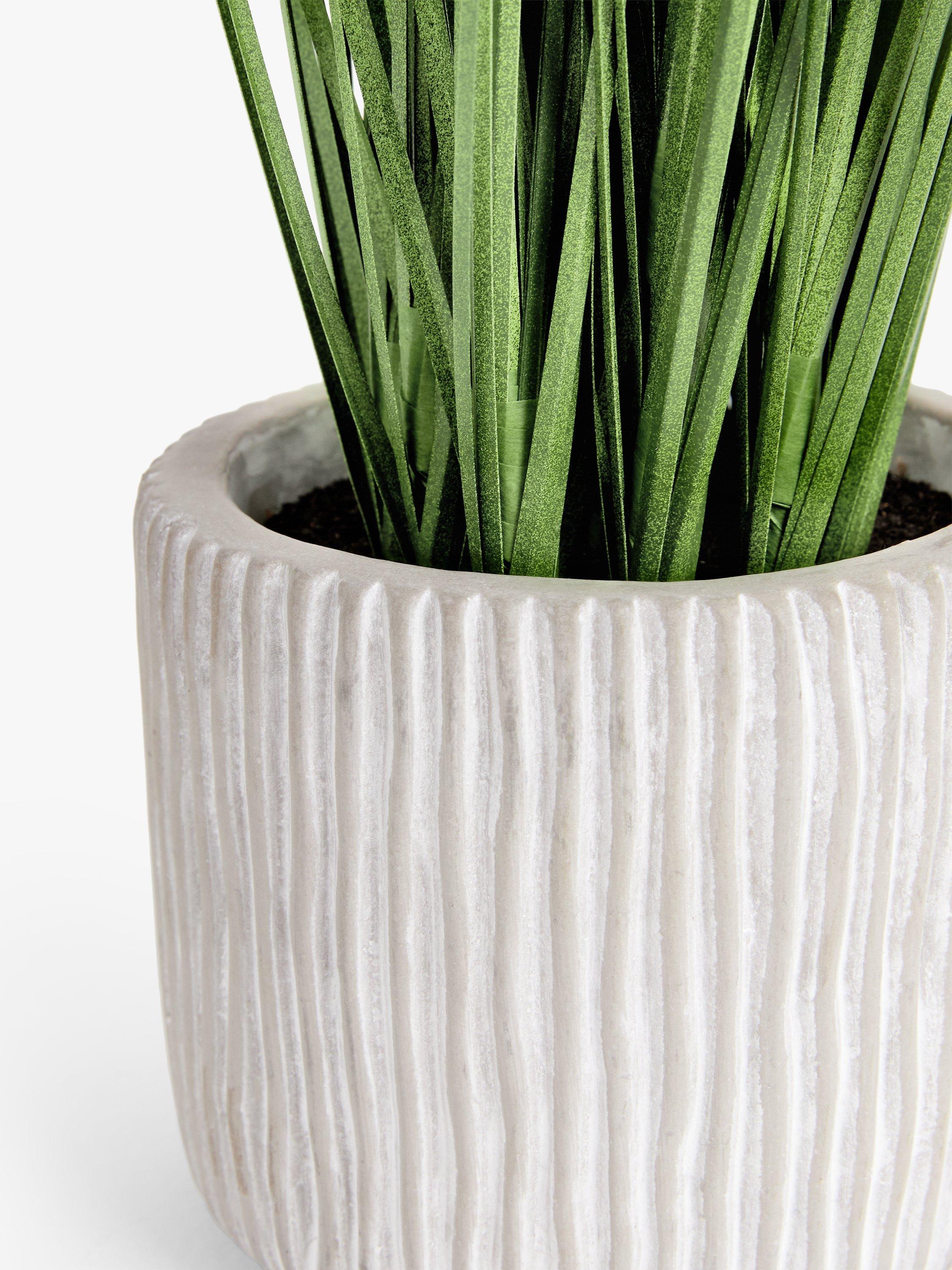 Detailed authentic-looking foliage makes a contrast against a textured concrete-style pot.