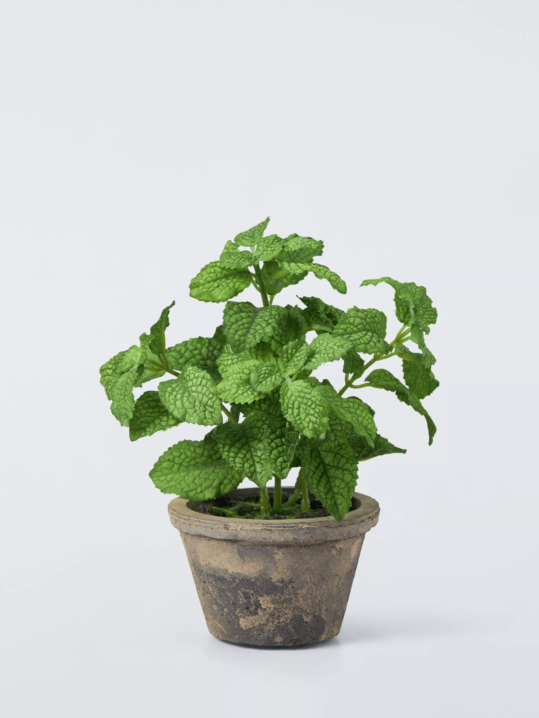 Artificial mini mint plant in a rustic ceramic pot. This life-like, maintenance-free plant adds elegance to any space. Great for kitchens or living areas. A lovely gift for herb lovers, it brings year-round charm.