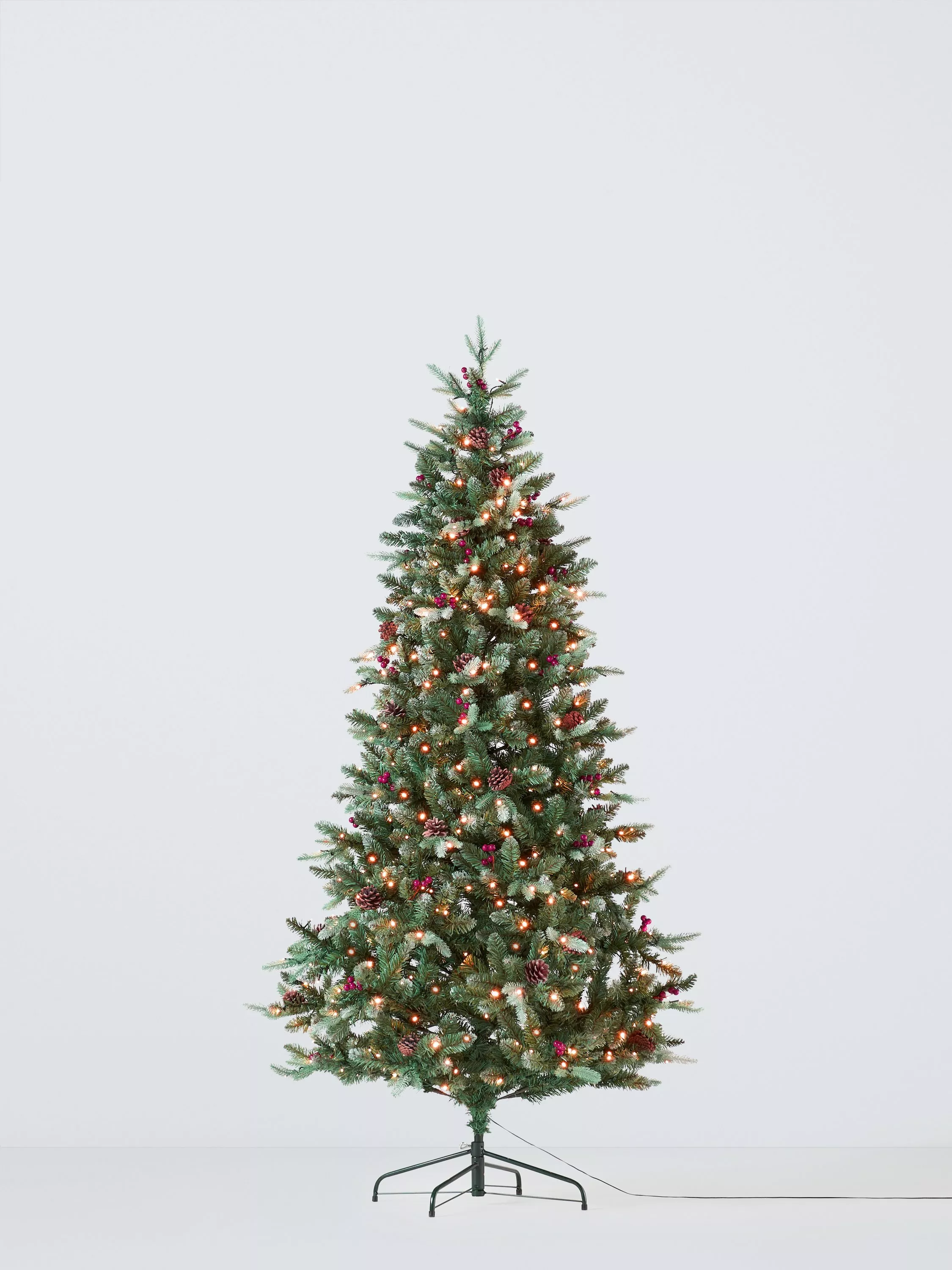 A classically conical artificial Christmas tree, pre-lit with 550 pure white LEDs. The tree's outer tips are fine needles, decorated with real pine cones and artificial red berries. There are 1159 tips in total, giving an irregular shape that's great for hanging decorations of varying lengths.
