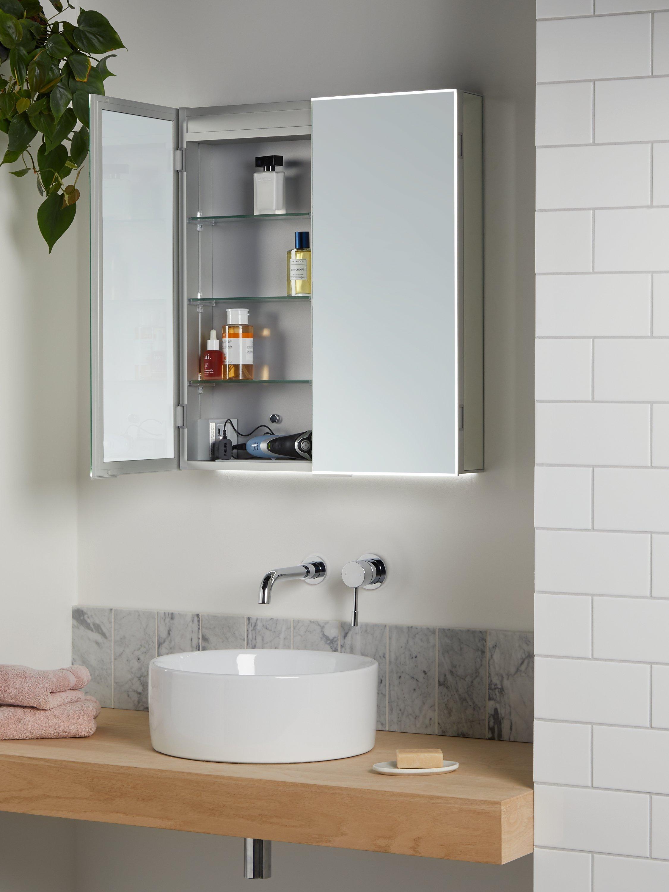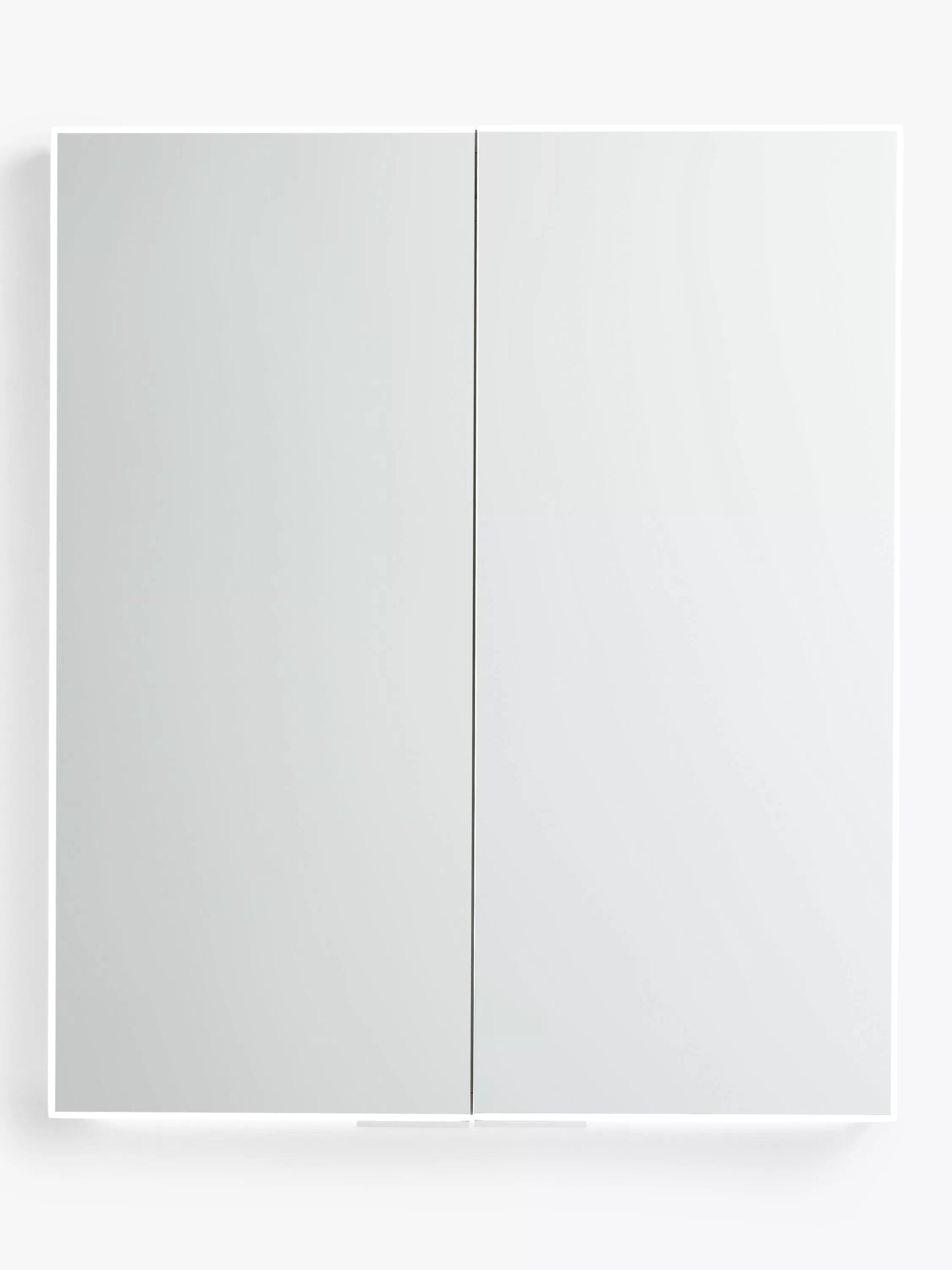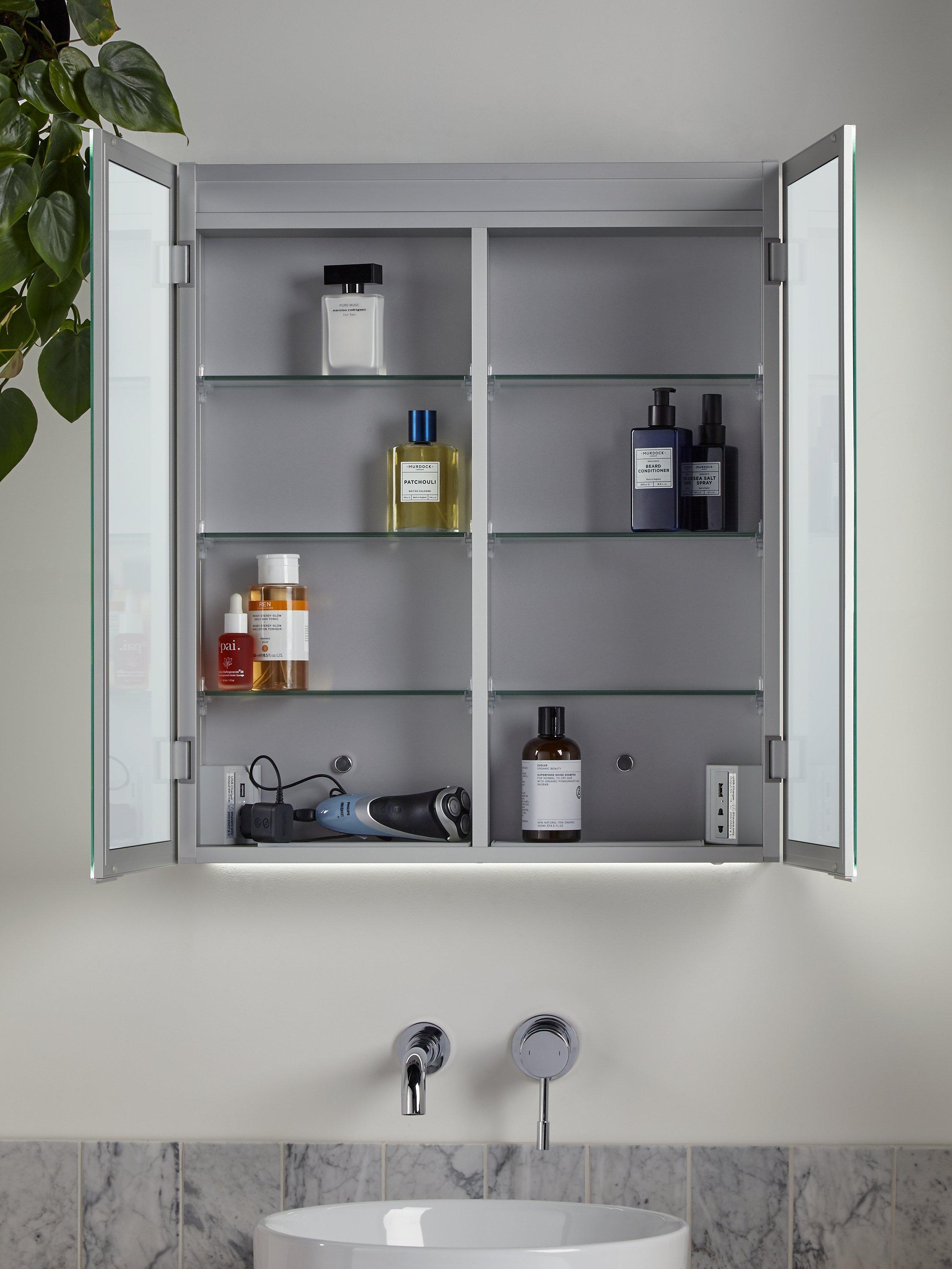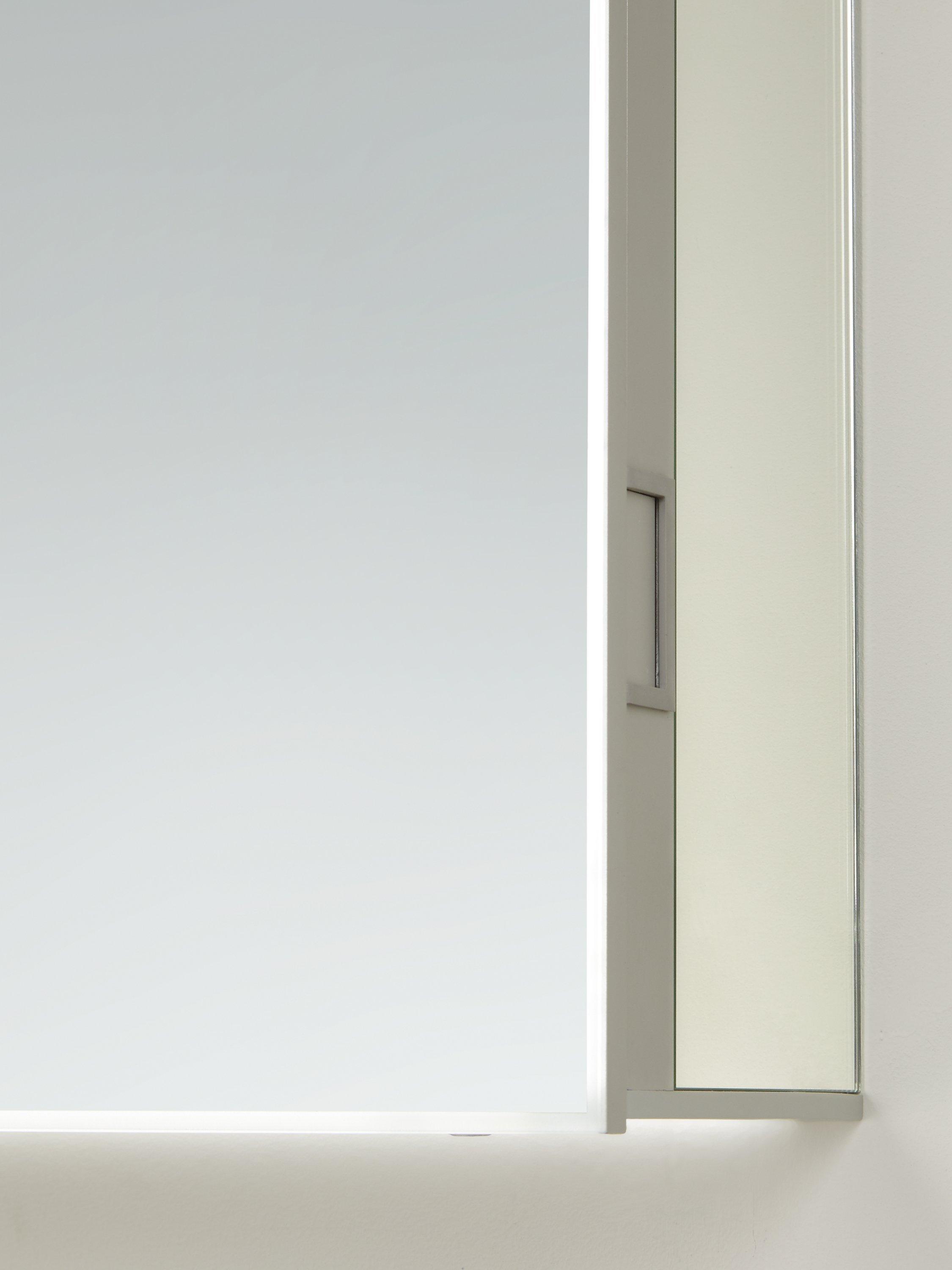 Our double Aspect bathroom cabinet has two double-sided mirror doors with ambient lighting from its underside as well as border illumination. This thin, precise lighting around its edges gives the cabinet a really sleek aesthetic.