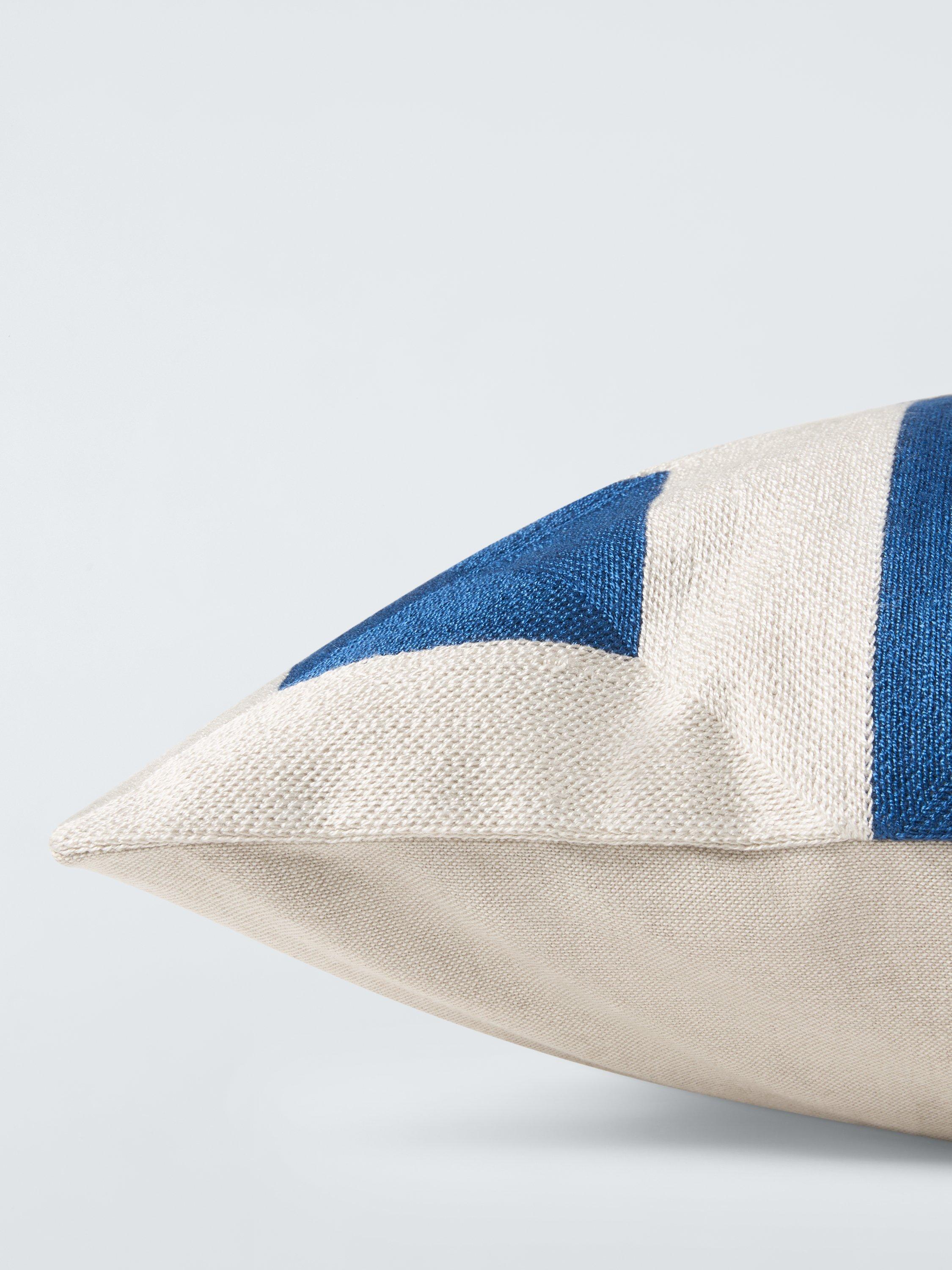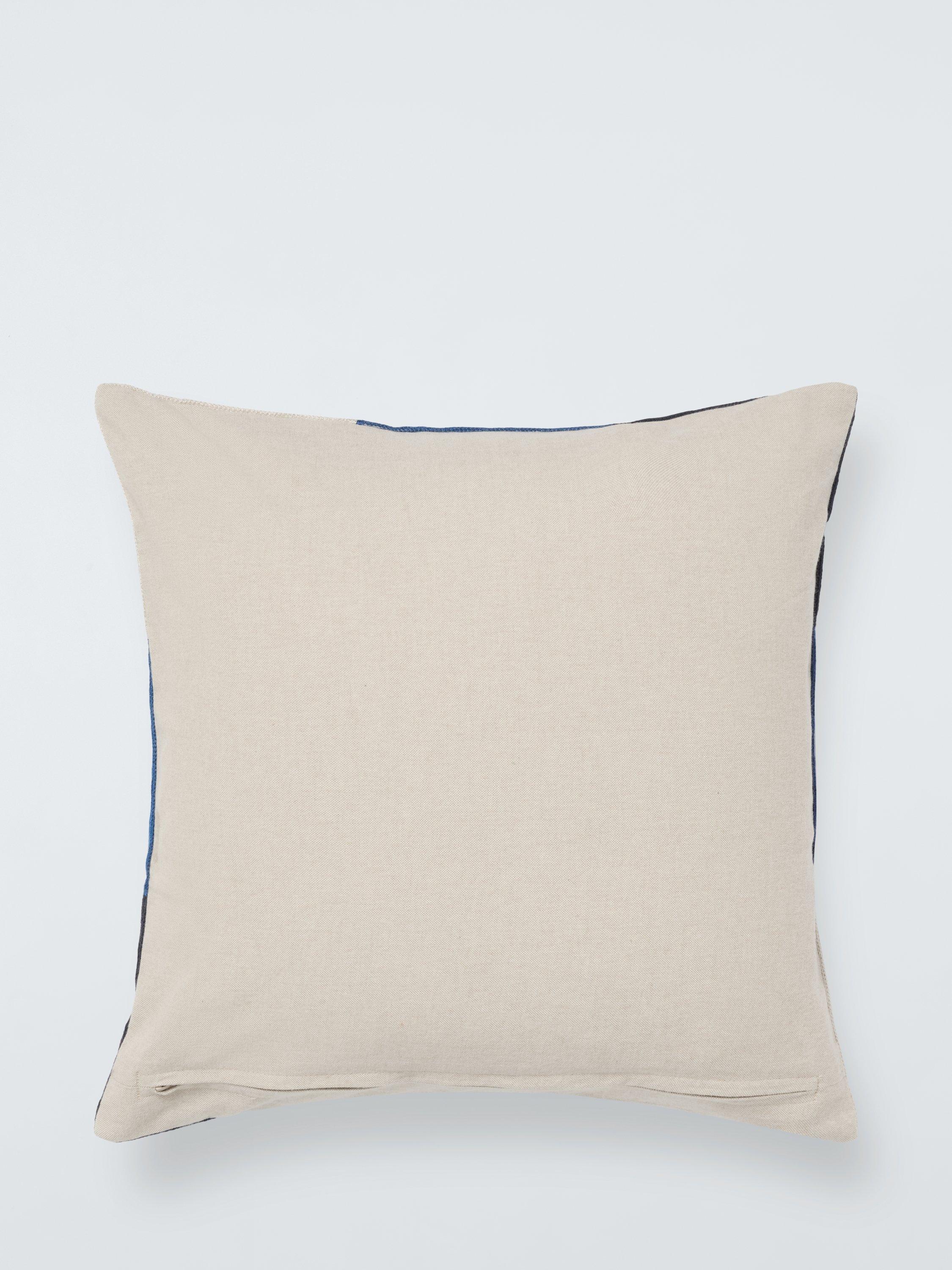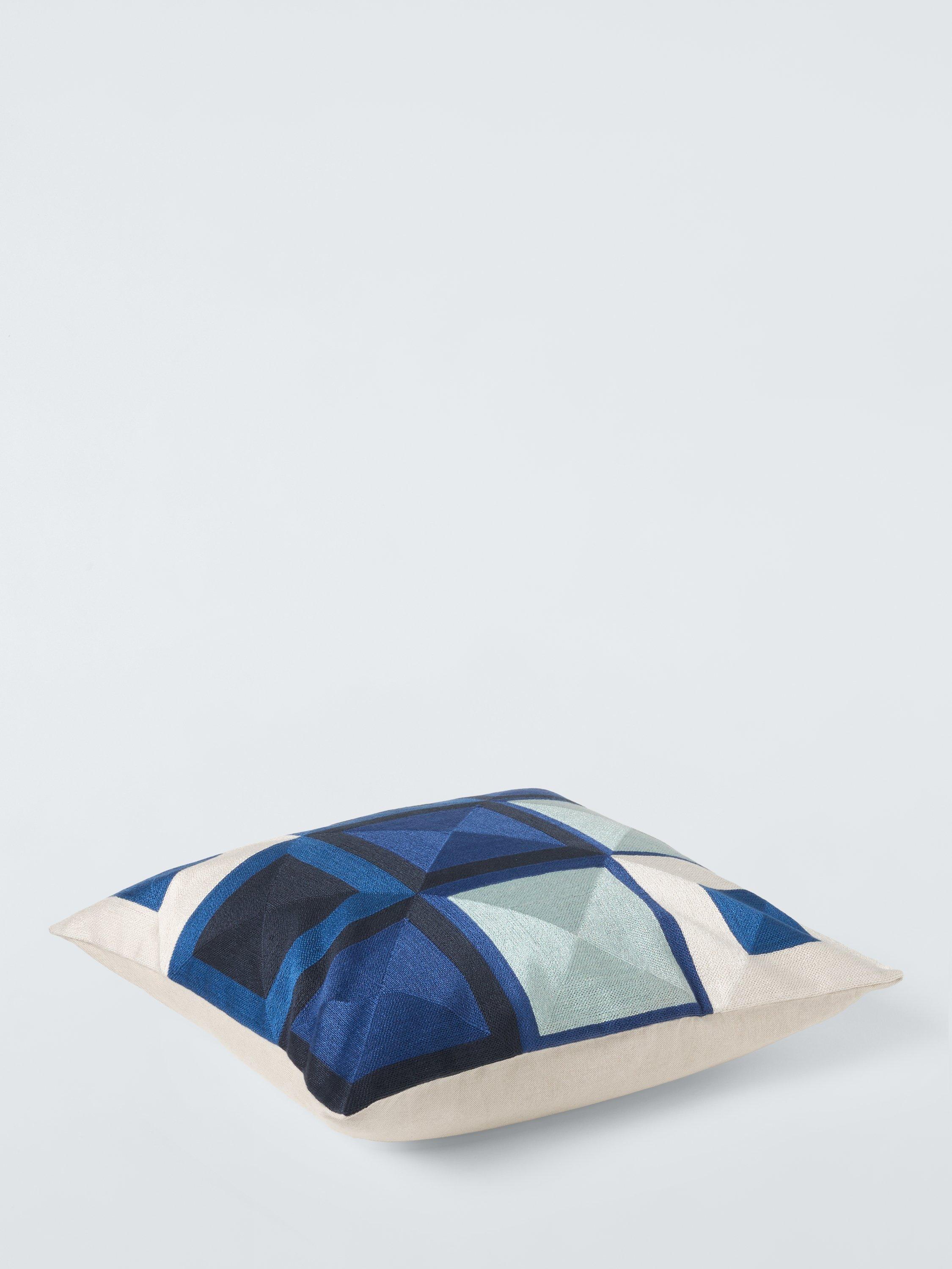 A modern patchwork-style design cushion stitched onto a woven background. Feather filled.