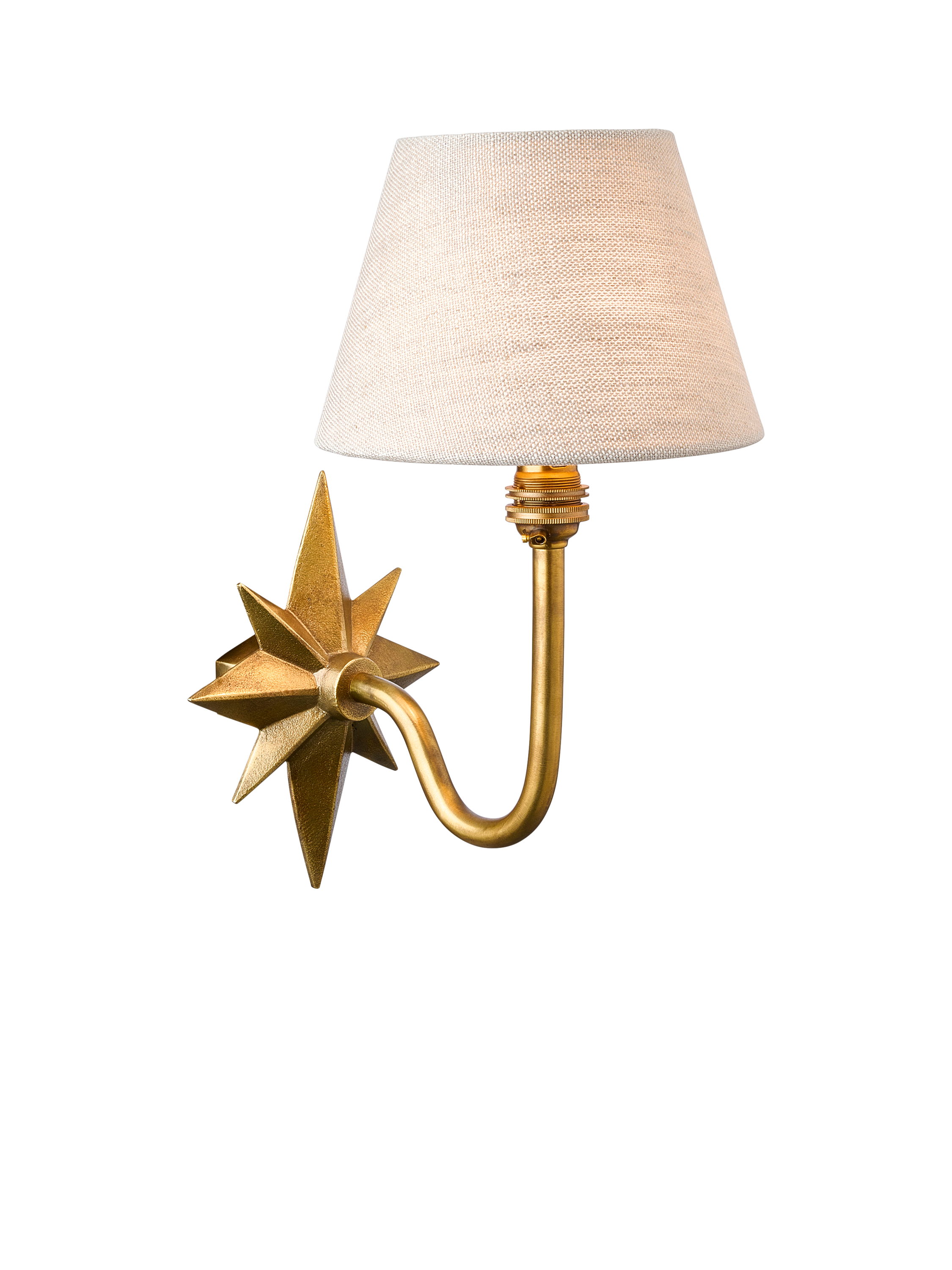 A beautiful die-cast wall back with a celestially inspired form, showcasing the craftsmanship of skilled metalworkers in India. This statement design is completed with a heritage arm shape. We recommend adding a fabric candle clip shade to complement this wall light base.