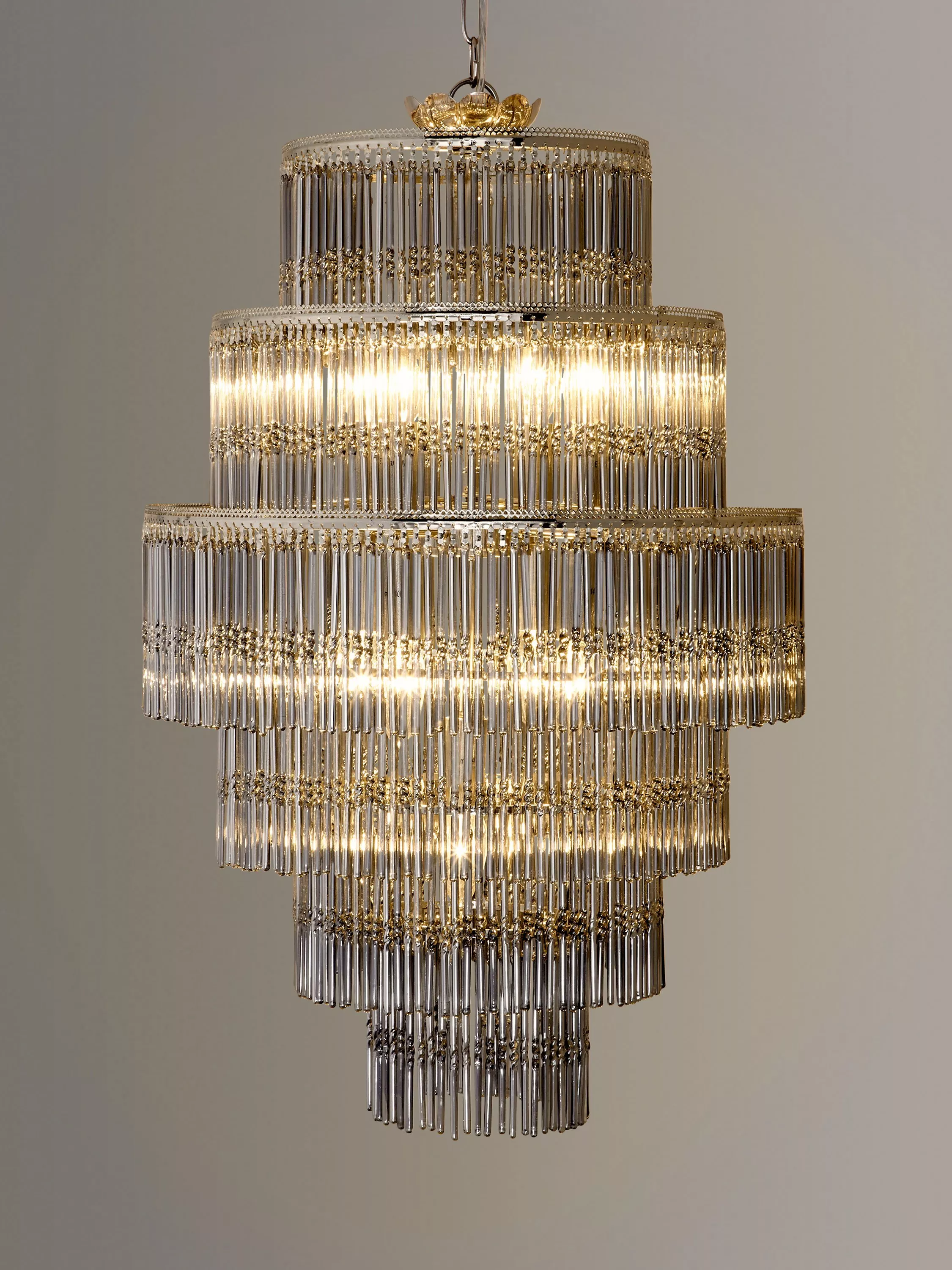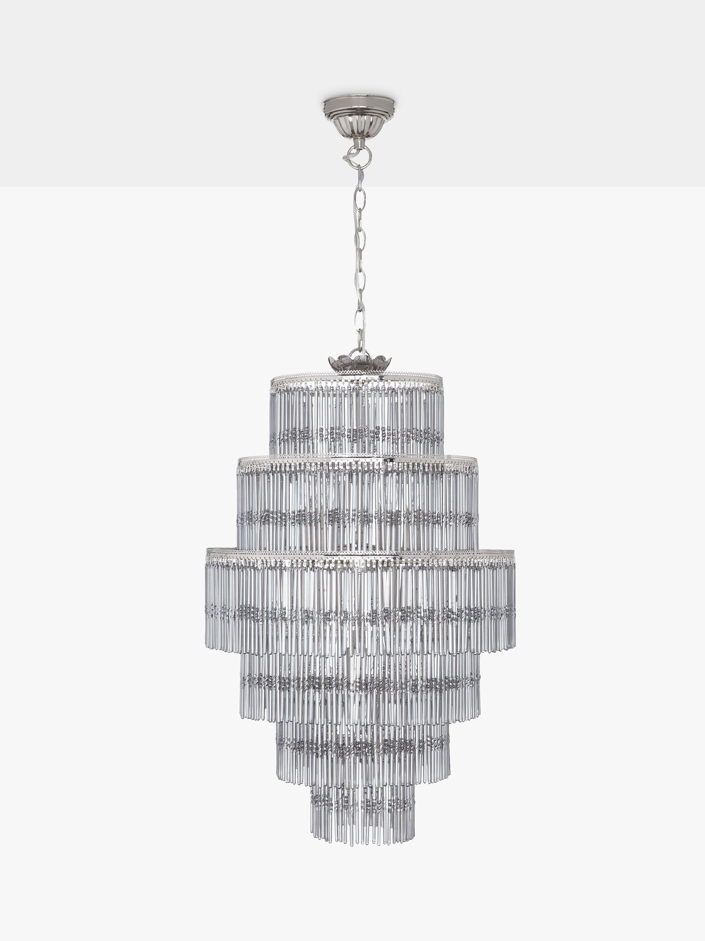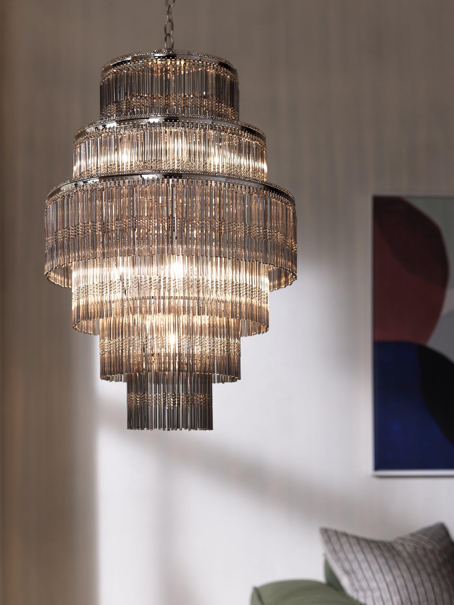 This dramatic five-tier chandelier will create the perfect centrepiece in your room. With a cascade of stunning, electroplated smoked glass rods, it will create a beautiful effect when lit. Also features polished nickel detail for added glamour.