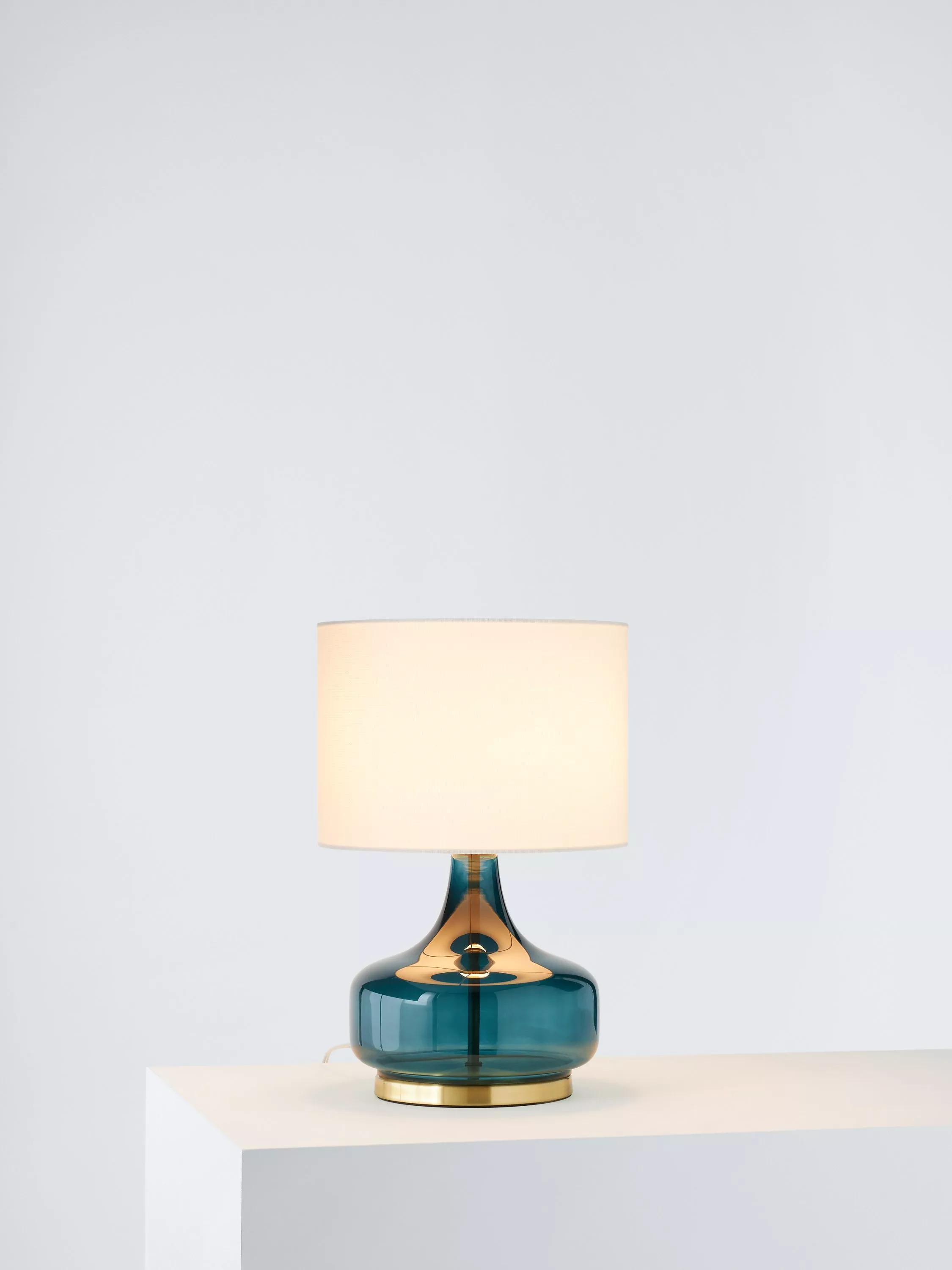 The sculpted base of this table lamp is made from glass and rests on a metal plinth in a smart antique brass finish. We've paired it with a fabric lampshade made from natural linen to enhance a warm glow of light in your space.