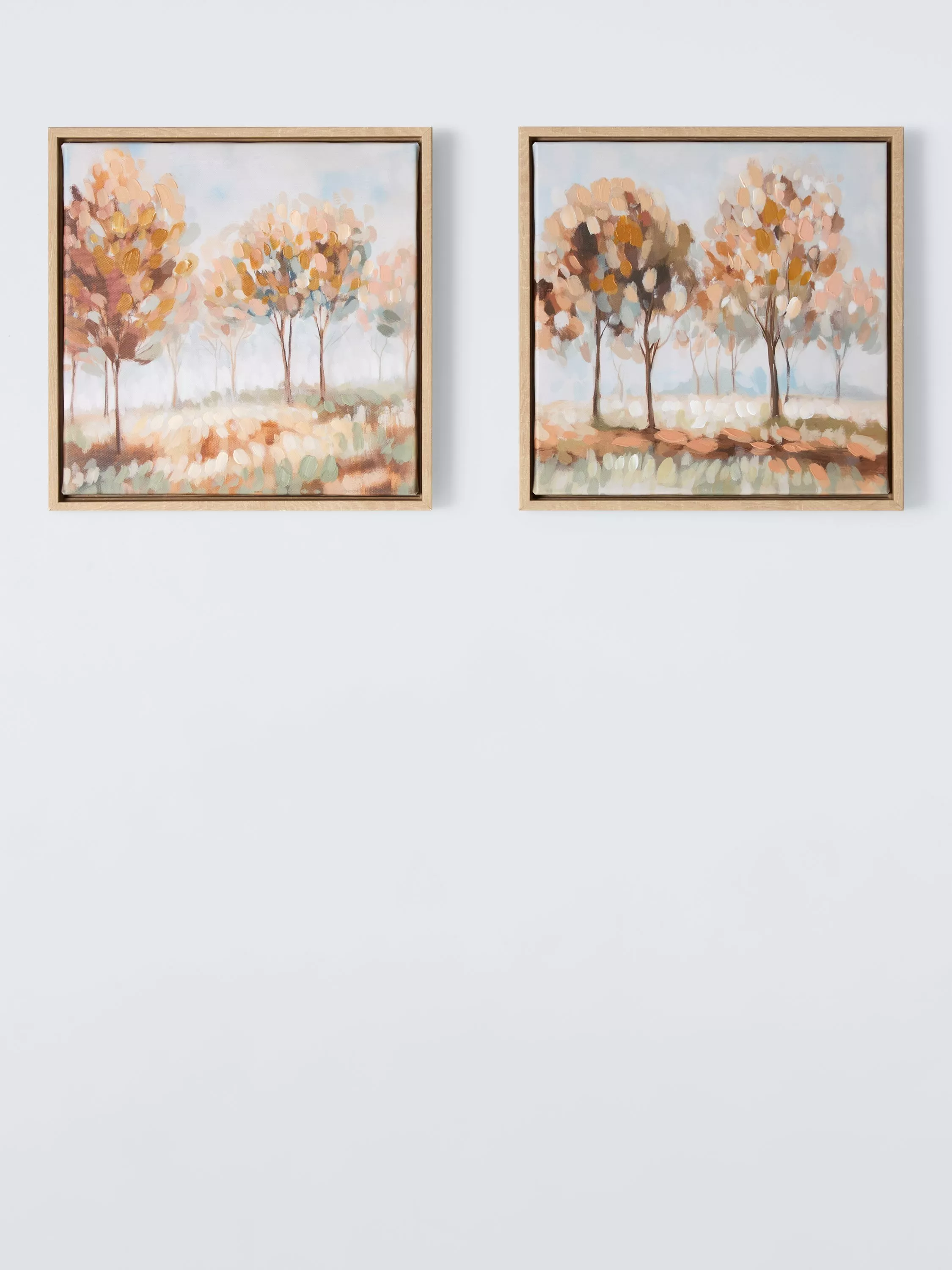 Pair of 'Autumn Trees' prints in soft hues. These canvas prints have wood-effect frames and are ready to hang on your wall.