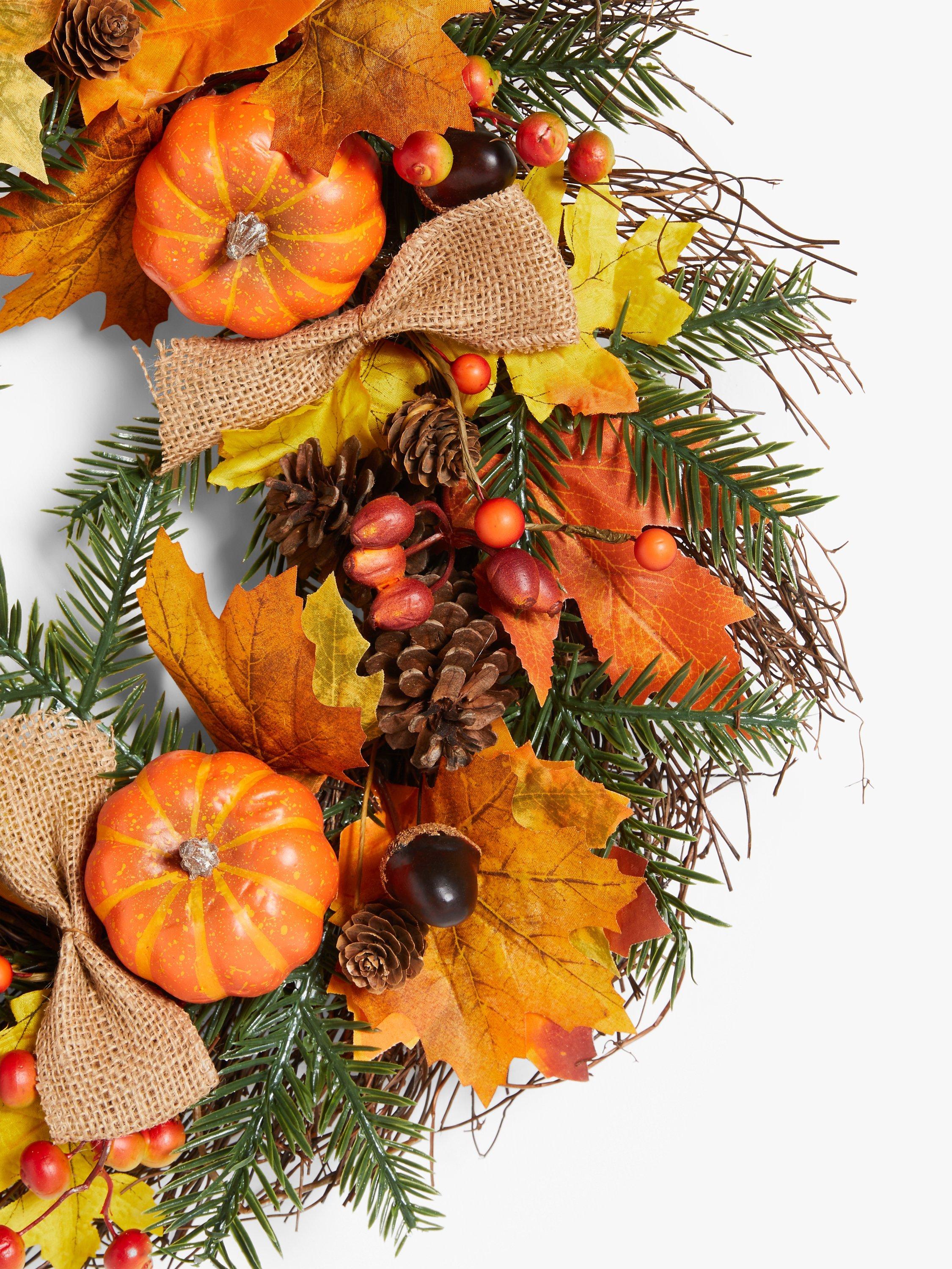 This rattan wreath is beautifully decorated with autumn leaves, pumpkins and pine cones to add seasonal style to your home.